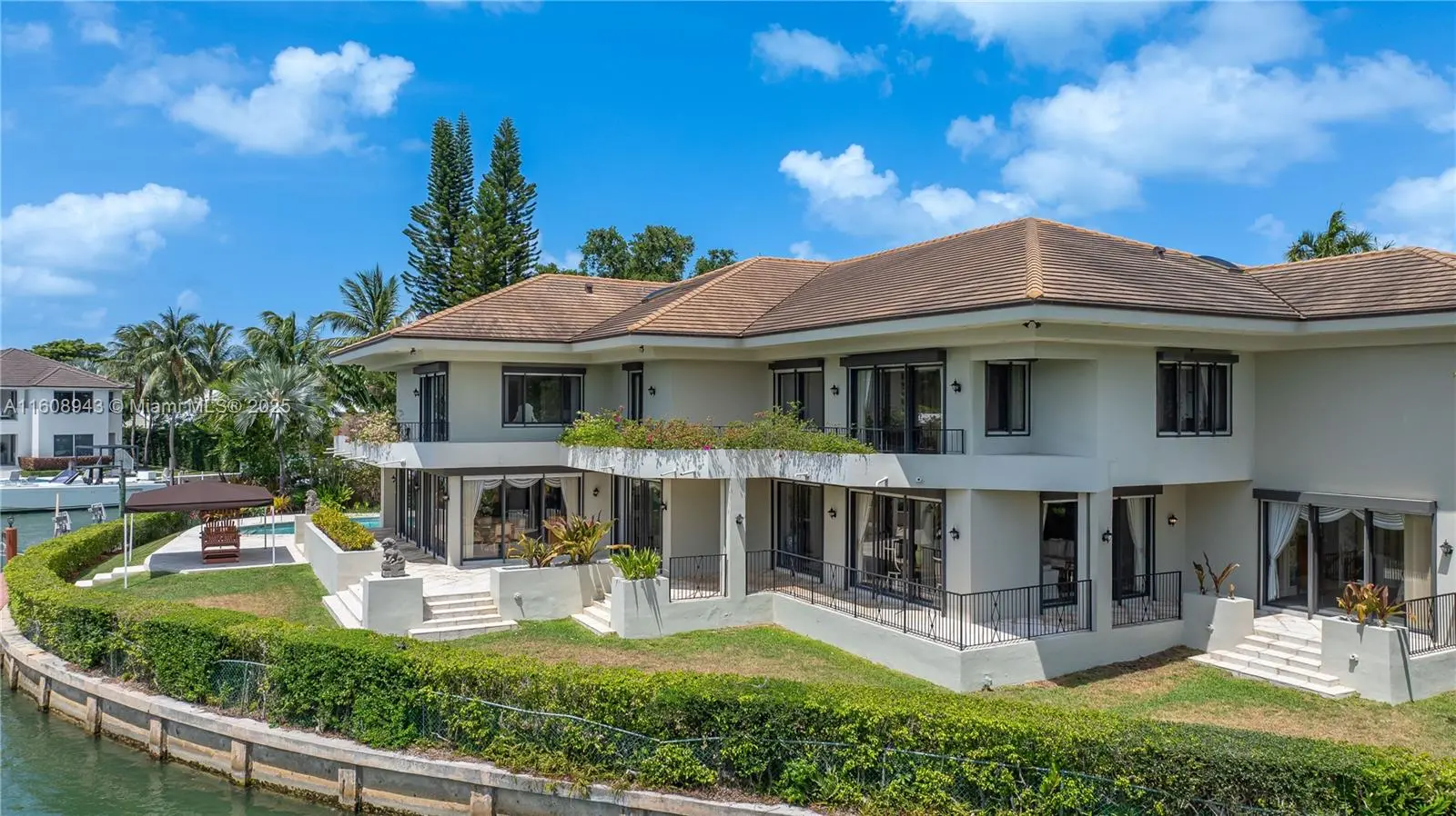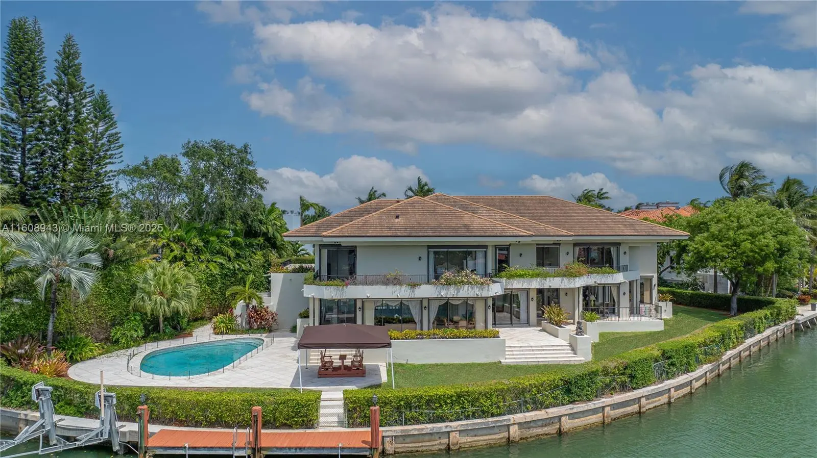 Spectacular contemporary estate set on a coveted cul-de-sac along Cape Florida Dr., one of Key Biscayne’s most prestigious and private addresses. Situated on a 23,724 sqft lot with +250 ft of waterfront and elevation of 8.71 ft above sea level, this home offers 8 bedrooms (including a guest suite and 2 staff quarters), 8.5 baths, a private dock, boat lift, and resort-style pool. A grand foyer with soaring ceilings introduces an architectural masterpiece designed by renowned architects and built by Interscope. More features include an elevator, full-home generator, reinforced concrete seawall, 2-car garage + porte-cochere for 4 cars, and driveway for 8+ cars. Discover the exceptional potential of this unique estate—a perfect blend of elegance, privacy, and premier waterfront living.