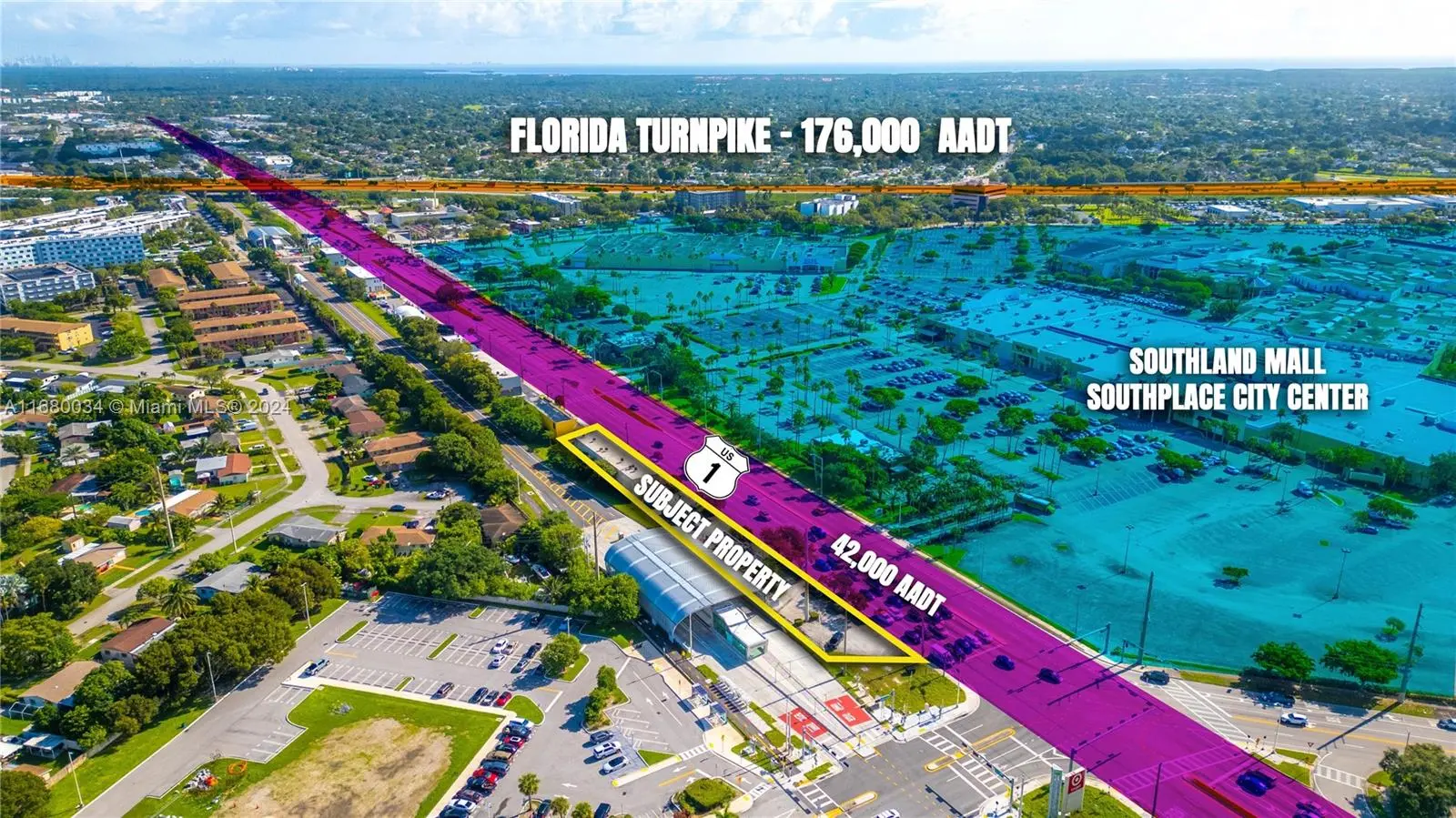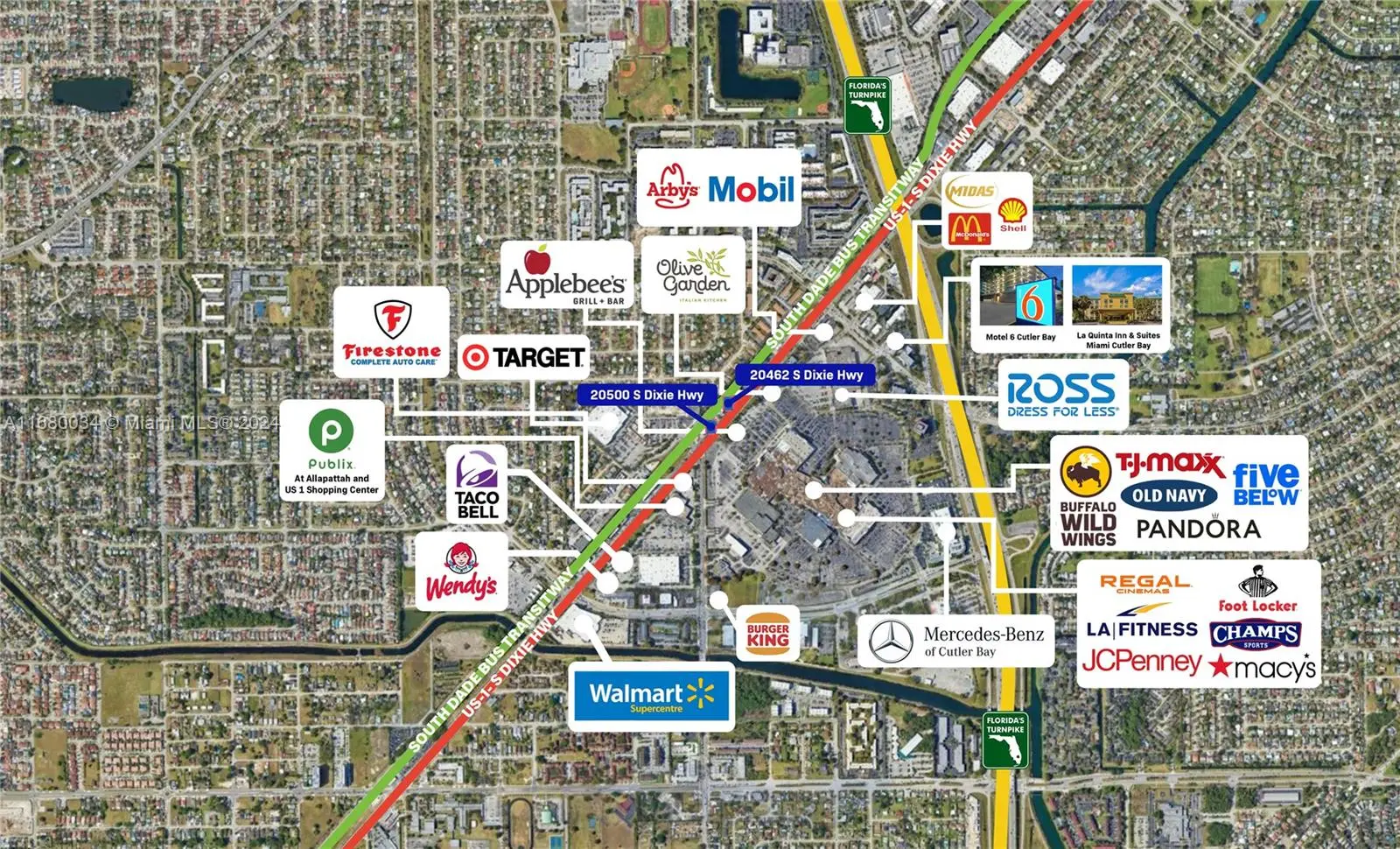 Prime investment opportunity! This fully-leased property at 20462-20500 S Dixie Hwy in Cutler Bay features two buildings: an 8,584 sq. ft. retail strip and a 2,192 sq. ft. freestanding restaurant, situated on a 26,004 sq. ft. lot. Located on the high-traffic US-1, directly across from Southland Mall, this property generates an NOI of $210,000 annually. With excellent value-add and redevelopment potential, this property ideal for investors looking to enhance income streams or explore future development opportunities in a thriving commercial corridor.