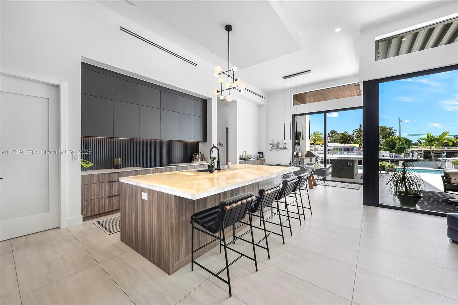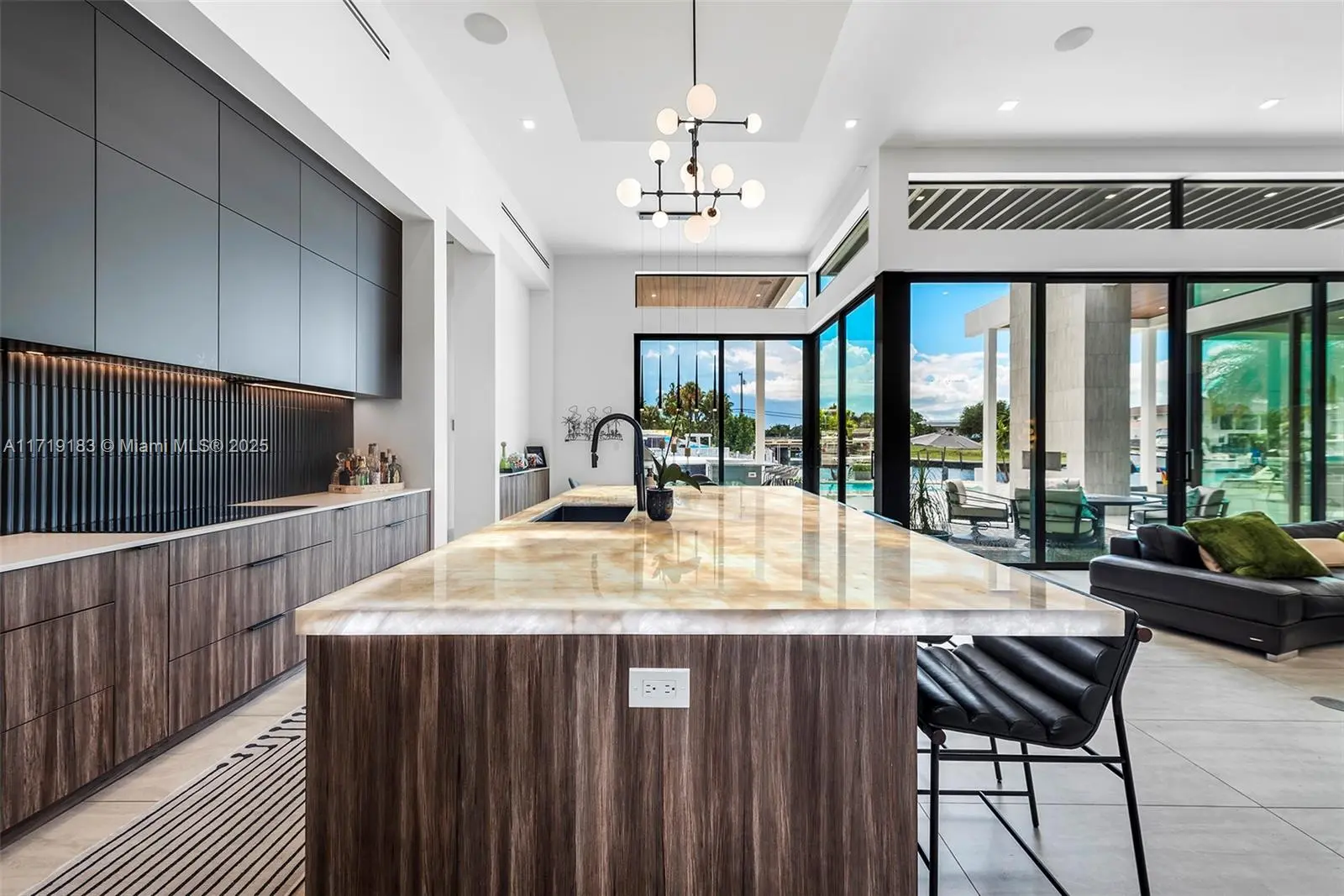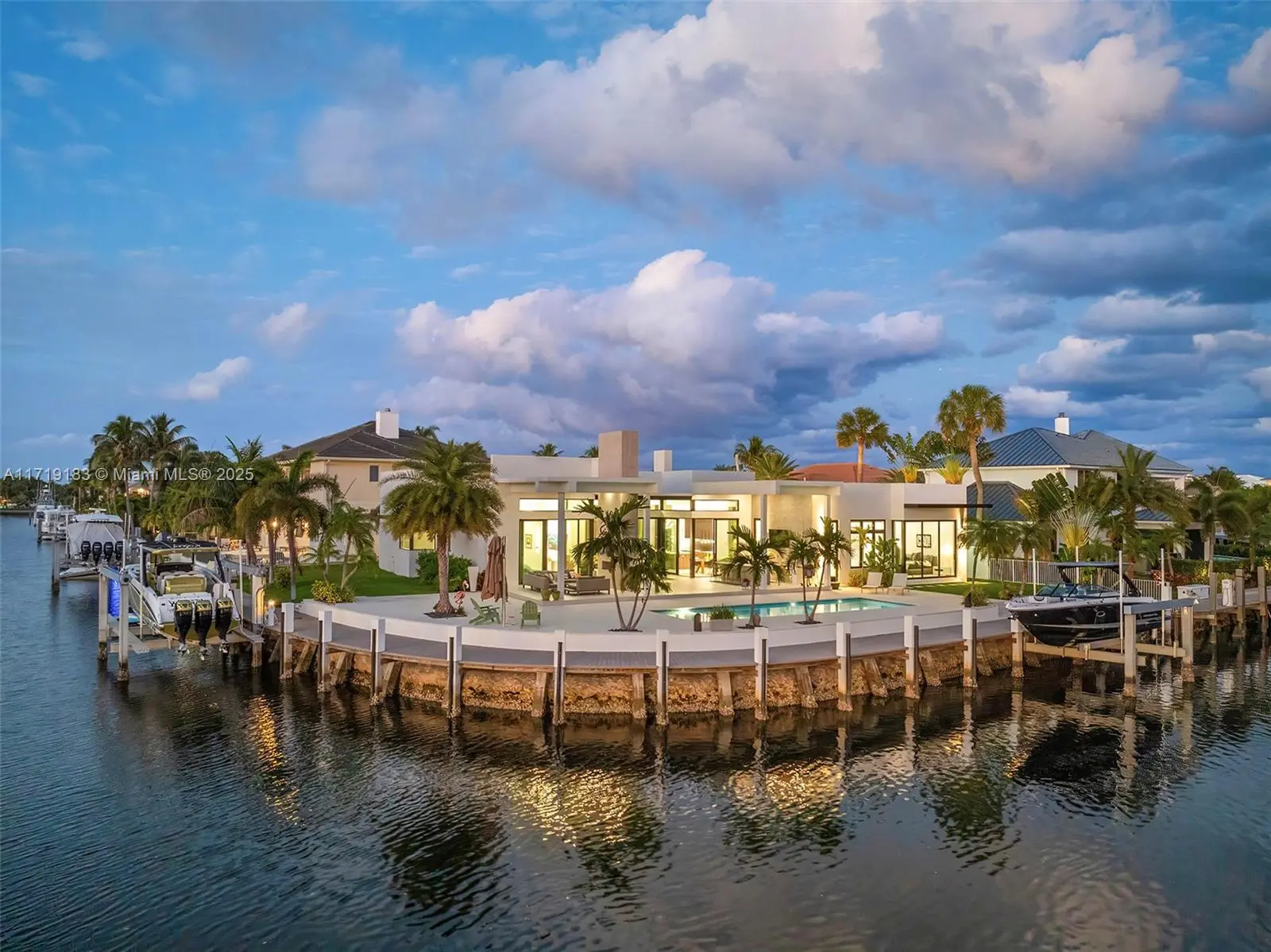Experience the epitome of luxury in this brand-new modern ranch-style home built by renowned Zahn Builders, positioned perfectly on a coveted Southern point lot. Boasting over 200' of prime waterfrontage on the South Grand Canal, this gem is just minutes from the ocean. The home spans over 4,700 total square feet, including more than 3,000 square feet of outdoor space. Revel in the meticulous design with 3 primary-sized bedrooms, 4.5 lavish baths, a state-of-the-art gym, and an expansive 4-car garage. Outdoors, enjoy the convenience of two 25k LB lifts, perfect for your boating needs. The open-concept interior showcases no-expense-spared finishes, including mesmerizing backlit onyx countertops and select materials that exude opulence. A rare gem, this home defines sophisticated living.