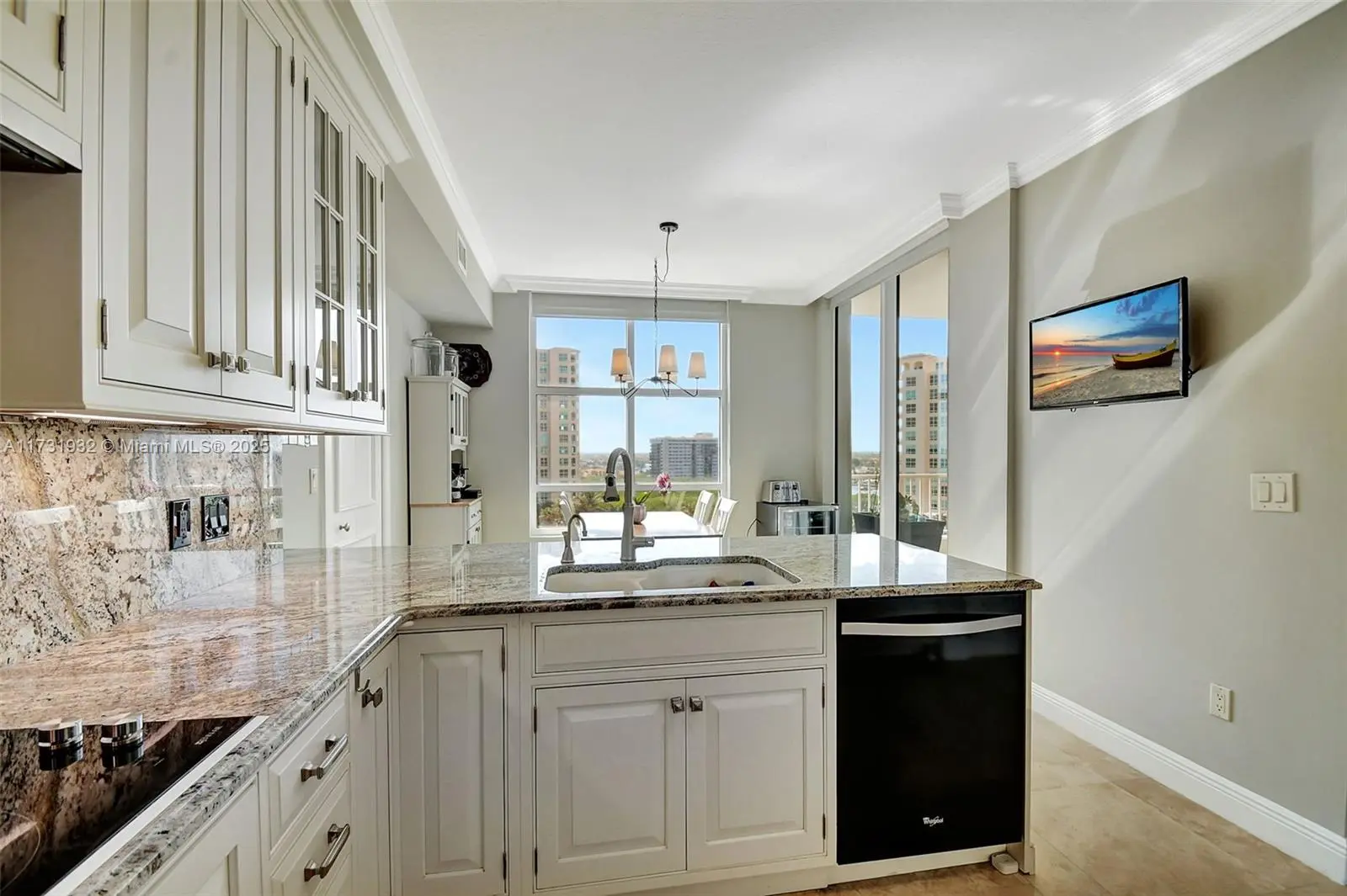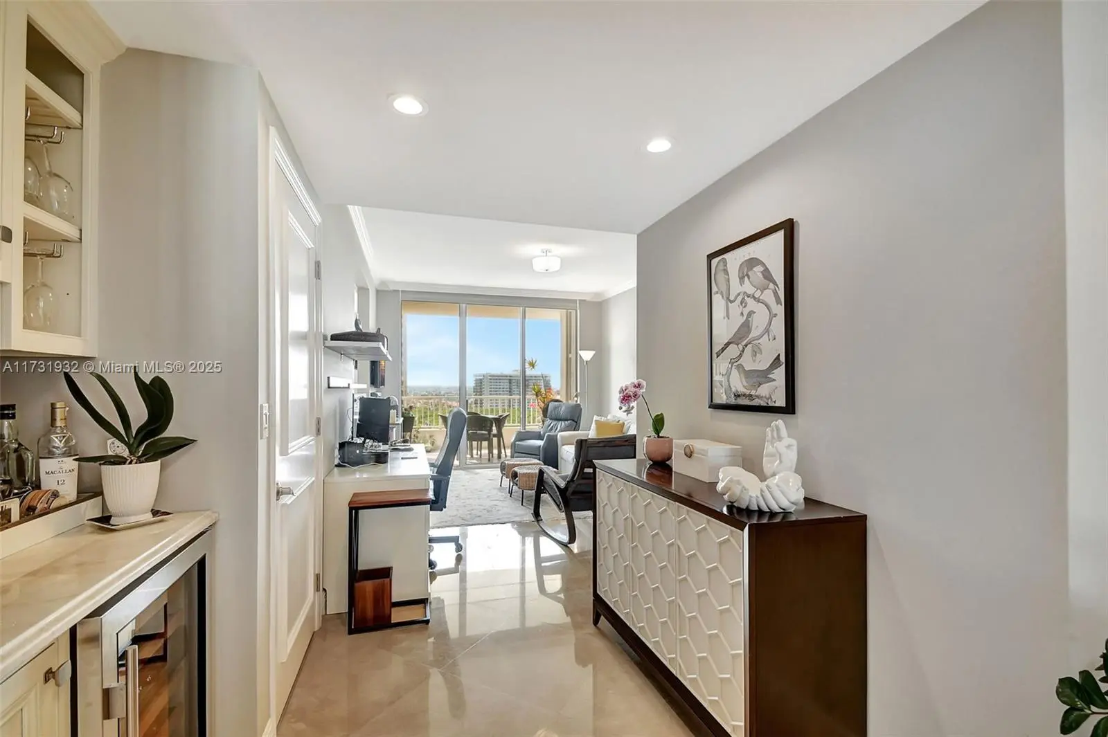 Perched on a high floor, this renovated Siena model spans over 2,230 square feet with 2 bedrooms, 2.5 baths, and a converted den that functions as a guest suite and office. Two balconies frame sweeping views of the ocean, Intracoastal, and city skyline. The kitchen is outfitted with custom granite counters and backsplash. The primary bath combines marble, quartz, and a built-in spa for a true retreat experience. The building has undergone a full transformation with upgraded elevators, redesigned common spaces, and a new reception. Residents enjoy access to a staffed private beach pavilion, 24-hour security, and full-service amenities. Sophisticated finishes and a clean transitional style make this a polished, turnkey coastal residence.