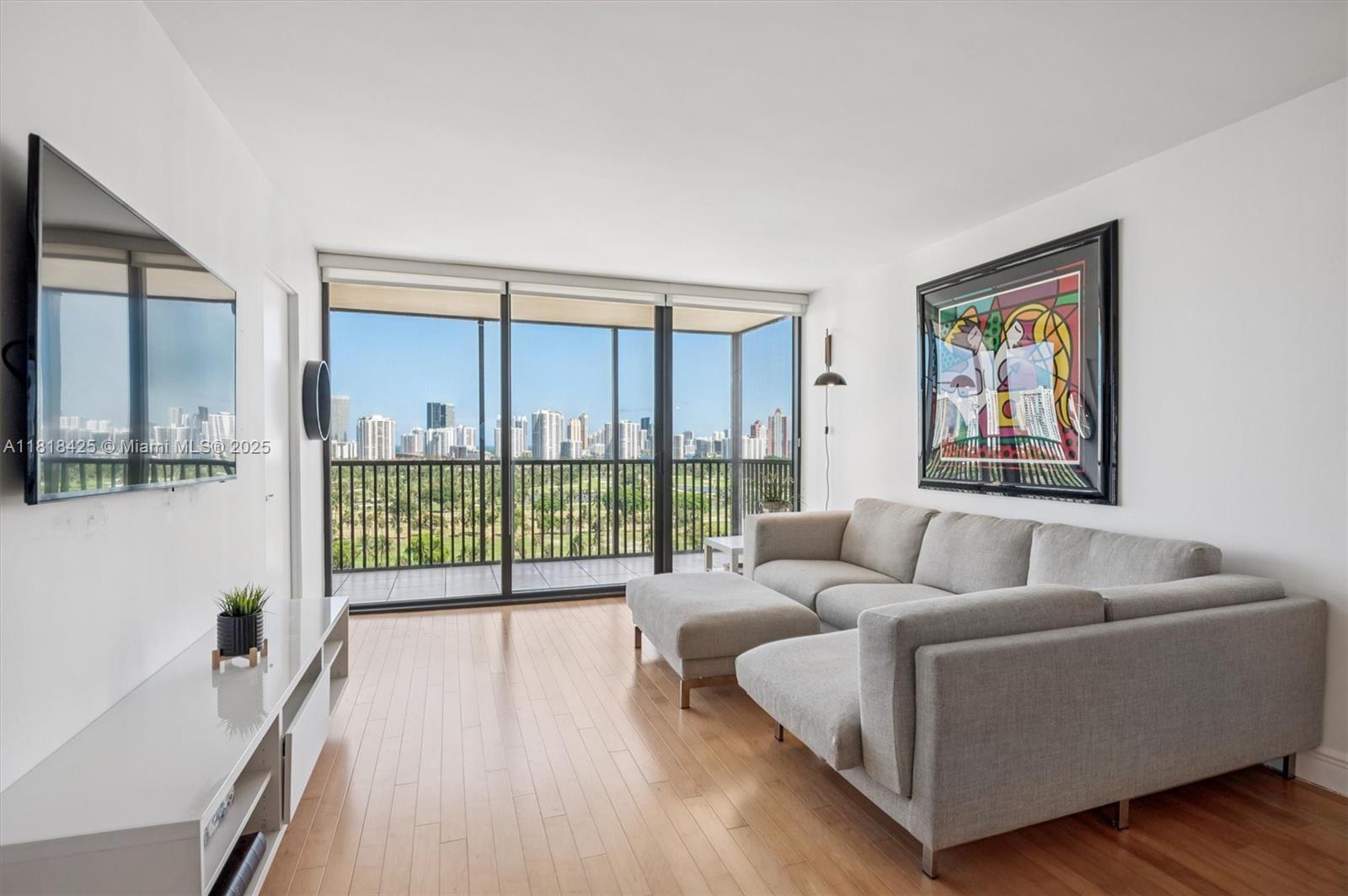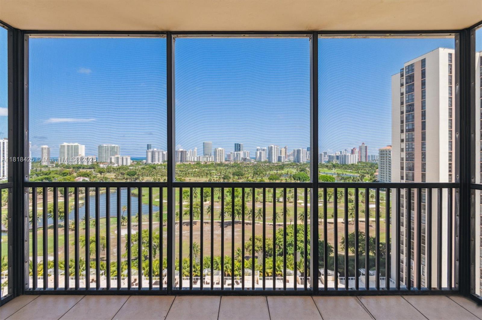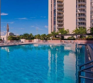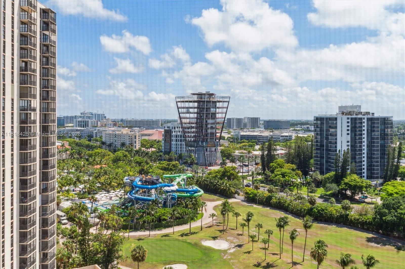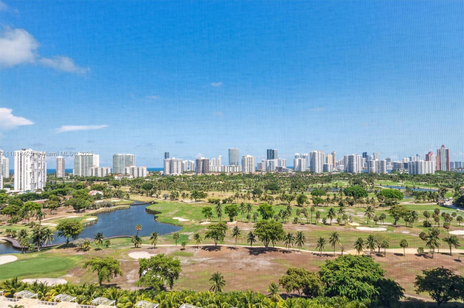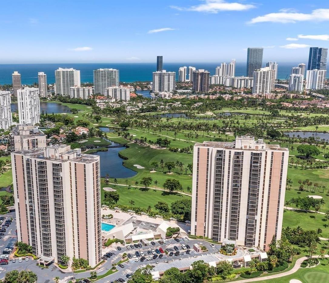 Welcome to this beautiful 2/2 split bedroom corner unit, where breathtaking views of the golf course, ocean, and skyline await! This stunning, totally renovated property boasts elegant wood floors, smooth ceilings creating an inviting atmosphere. The kitchen feature sleek white wood cabinetry & SS appliances, perfect for culinary enthusiasts & entertaining guests. The master bath has a glass enclosed shower and a spacious ensuite dressing area with custom built in closets. Enjoy the beauty of the city lights from your living space, with panoramic vistas that will leave you in awe. This exceptional property is move in ready! Assigned covered parking, pool, jacuzzi, sauna, fitness center, 24 hour security gate, shuttle service & ADA/ESA animals permitted. Building passed 40yr certification