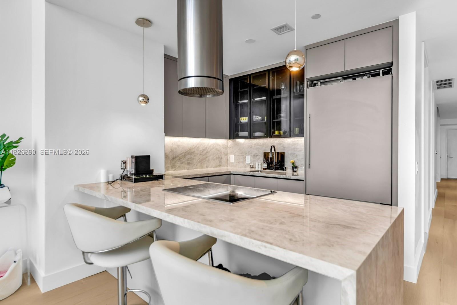 The Ultimate Miami Loft — Perched high on the 43rd floor of Marquis, this one-of-a-kind residence offers unobstructed turquoise water views of Biscayne Bay, the Atlantic Ocean, Miami Beach, and Downtown Miami. Spanning nearly 1,700 SF of fully renovated interior space, this 1-bedroom + DEN features soaring 20' ceilings, floor-to-ceiling windows, an oversized terrace, and abundant storage throughout. No detail was overlooked—brand-new kitchen, bathrooms, flooring, and accent lighting elevate the space. Enjoy 5-star amenities including pools, fitness center and spa, 24-hour security, and exclusive beach club access at the Bentley Hotel in South Beach. Live in the heart of it all—steps from the waterfront park, art and science museums, Arena, Miami Worldcenter, and the future 33-acre park.