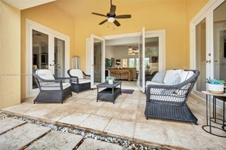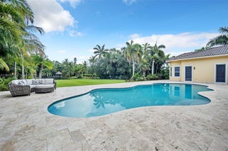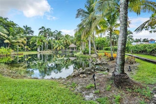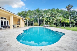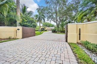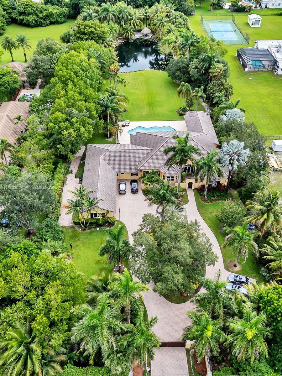 Gated 2.3 acre estate in exclusive Sunshine Ranches offering unmatched privacy, space, and tropical luxury. This 7 bedroom, 6.5 bath hacienda style residence (including a den) also features a separate office, wood and tile flooring, crown molding, and generous living areas filled with natural light. The fully fenced grounds are a true tropical paradise professionally landscaped with over $300K in mature palms, exotic plants, and fruit trees, plus over $20K in custom outdoor lighting. Outdoor highlights include an expansive travertine deck, scenic walking trails, and a tiki hut overlooking a serene private lagoon. Additional features include a 4 car garage, whole house generator, 500 gallon underground propane tank, and security cameras. A rare find in prestigious Southwest Ranches.