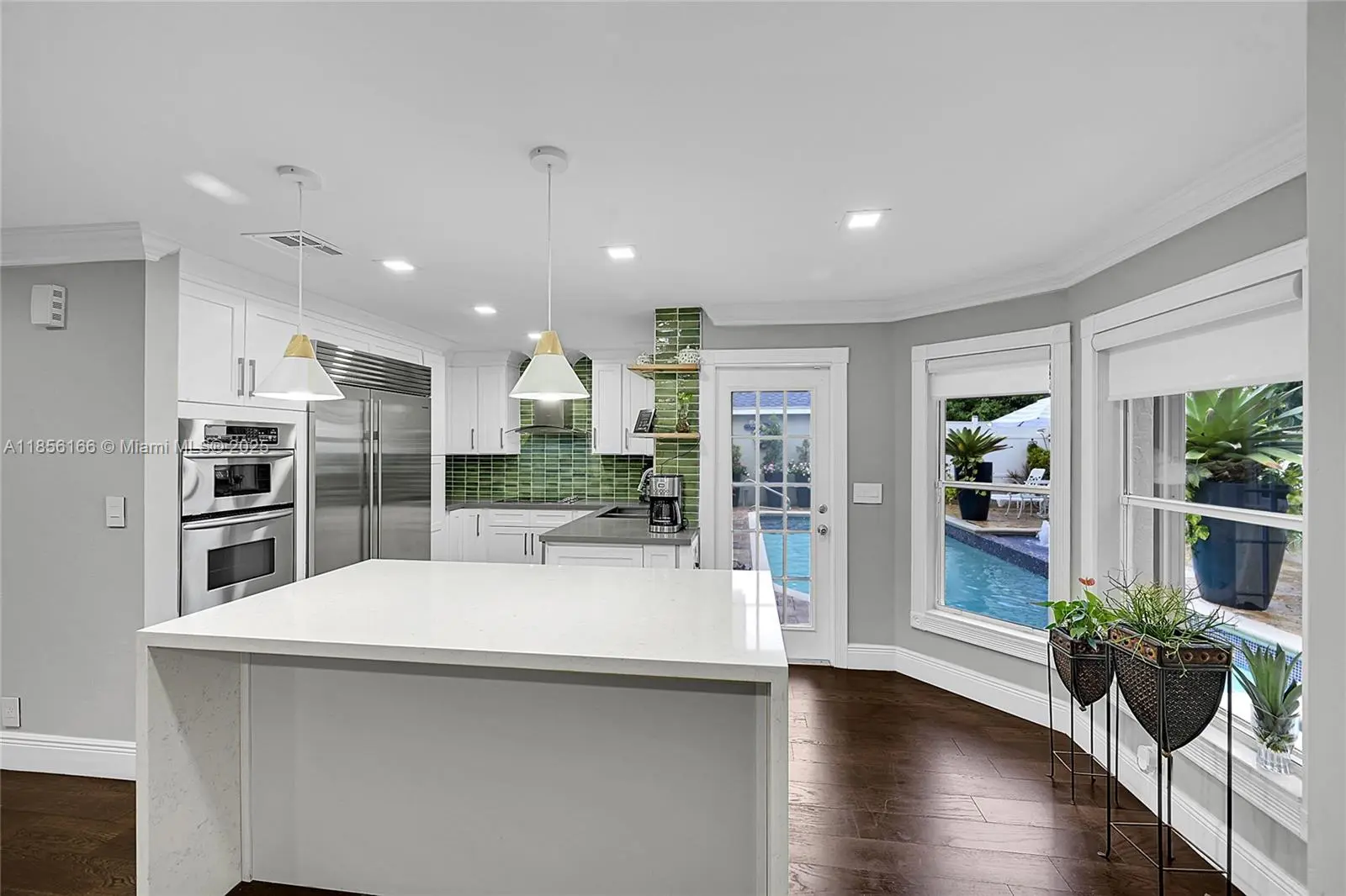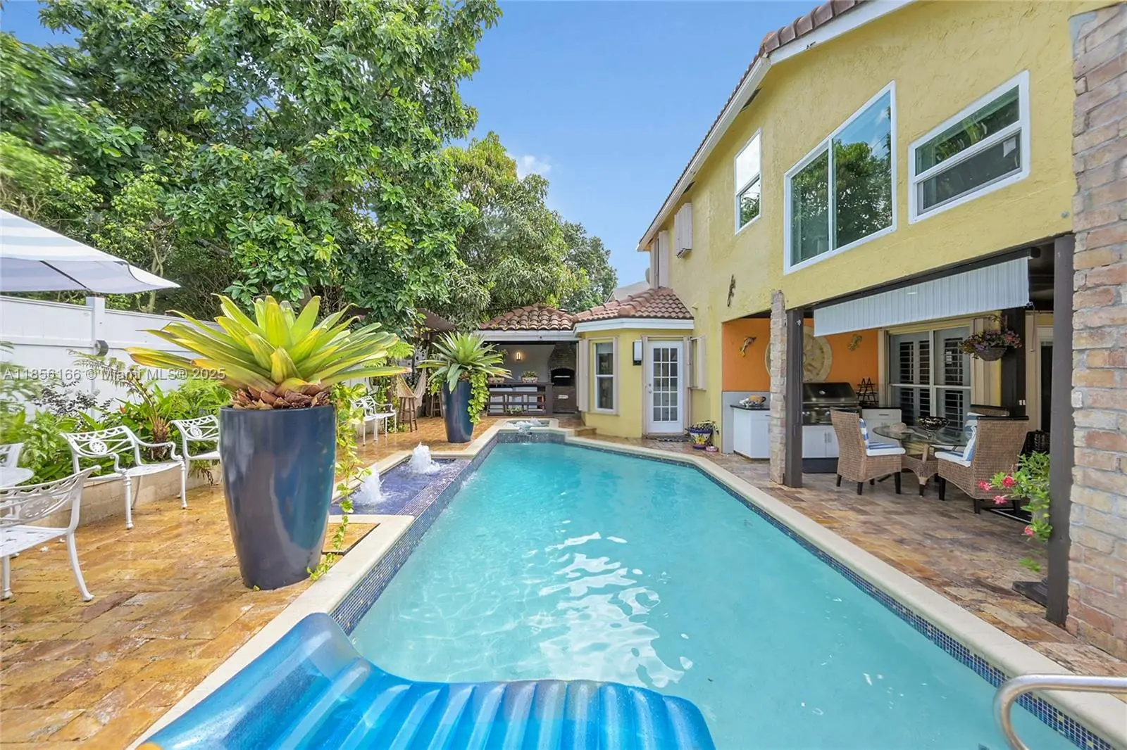 Beautifully upgraded 4-bedroom (2 suites), 3.5-bath home with vaulted ceilings, crown moldings, plantation shutters, and hardwood floors throughout. Spa-style bathrooms with rain showers and jets; master bath with Italian marble floors and walls. Chef’s kitchen with newer appliances,Sub-zero refrigerator, waterfall quartz island, hot tower, tankless water Heater. Outdoor summer kitchen with Alfresco BBQ grill/with Rotisserie, pizza oven, under wood-paneled patio ceiling. Oversized pool with spa blower, spa bench with jets, marble pool deck, and tropical fruit trees.Also featuring are hurricane shutters, brick driveway, oversized garage with custom closet, upgraded half bath, mud room, and hi-hat lighting throughout. HOA offers tennis courts, pickleball courts, and kids playground.