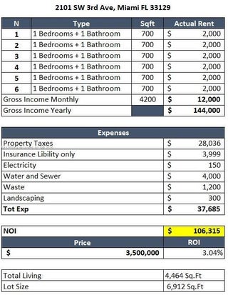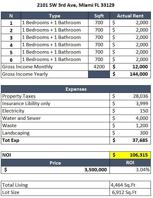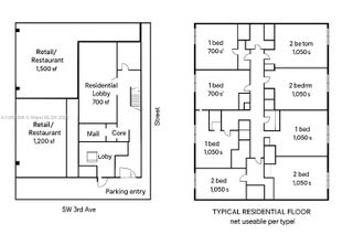 T6-8-O-URBAN CORE ZONE. You can build a mixed use high rise building of 8 floors. First floor for commercial retail or offices. second and third floors for 33 parking spaces. 5 next floors for residences 5 units per floor. Amazing corner lot location to develop get income as you submit permits. Gross income $144,000. 40 year recertification was passed in 2022. Flat roof replaced in 2019. Very low liability insurance $4,000 a year. Building consist of 6 one bedrooms one bathroom of 700 Sf each rented at $2,000.