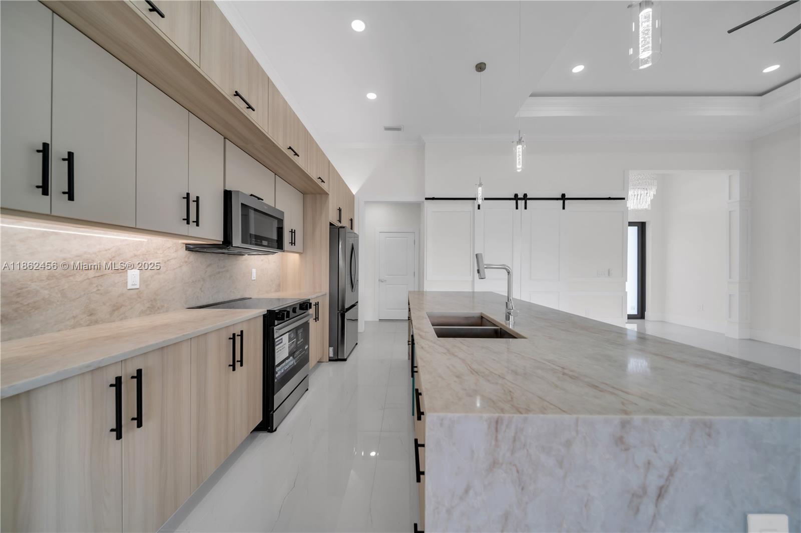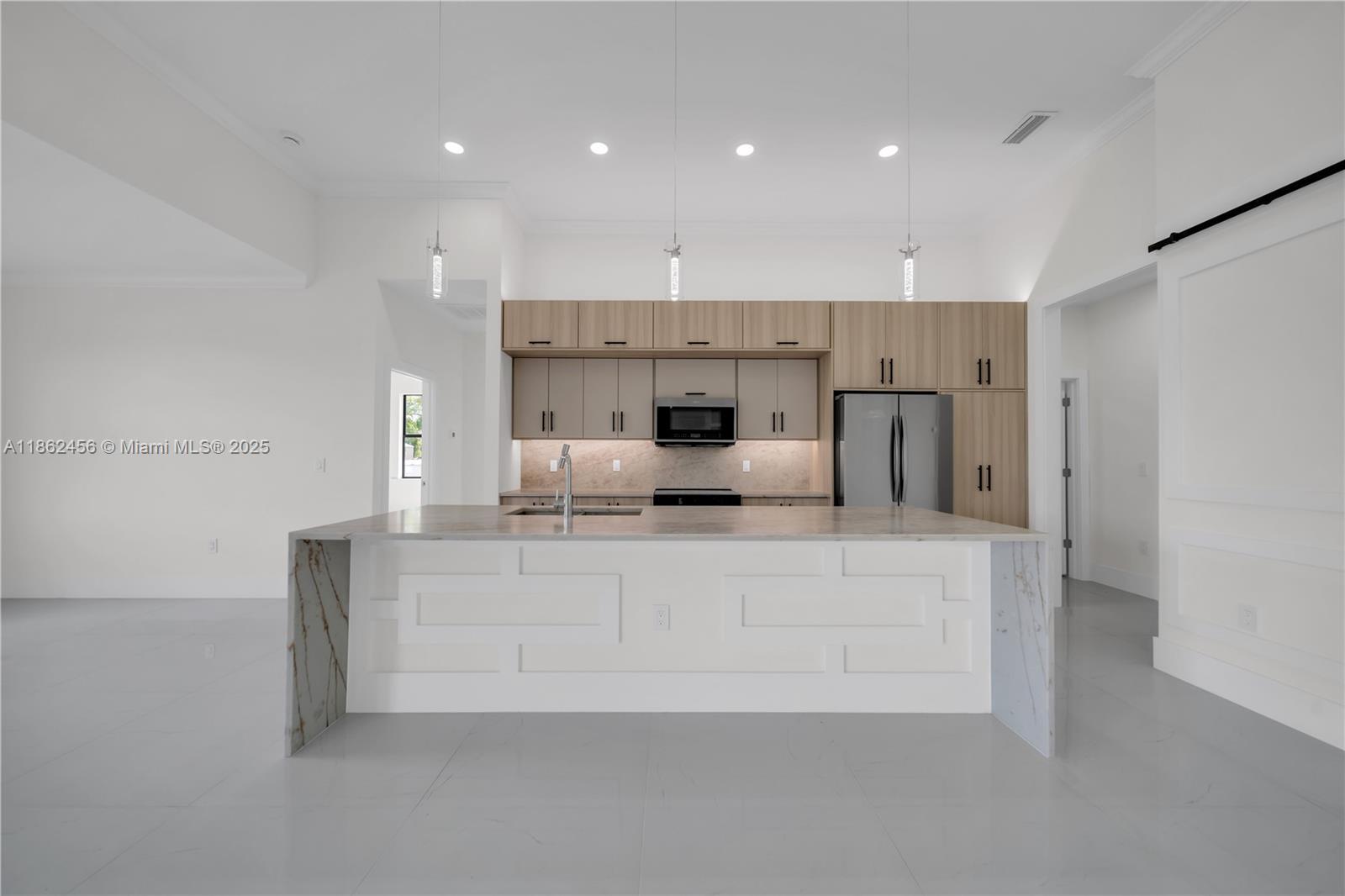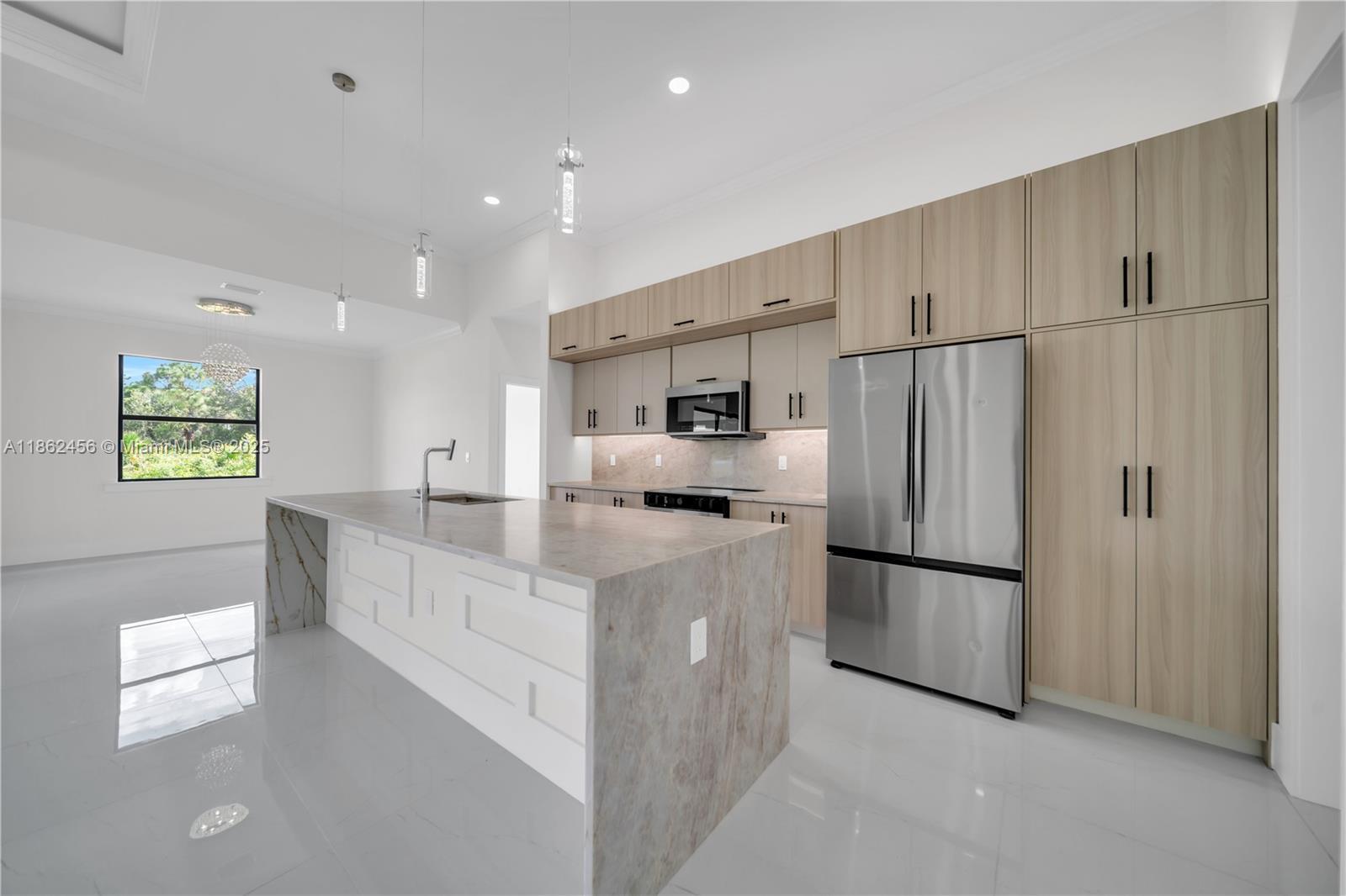 This brand-new construction features 3 bedrooms plus a den and 3 full bathrooms, offering 1,868 sq. ft. of living space with a total of 2,637 sq. ft.. The open-concept design highlights a modern kitchen with a quartz waterfall island, custom cabinetry, stainless steel appliances, and elegant pendant lighting. Large-format porcelain tile floors, soaring ceilings, and impact-resistant windows and doors provide comfort, safety, and style. Enjoy an expansive lanai with a fully equipped outdoor kitchen, perfect for entertaining or relaxing. Don’t miss this opportunity—schedule your showing today!