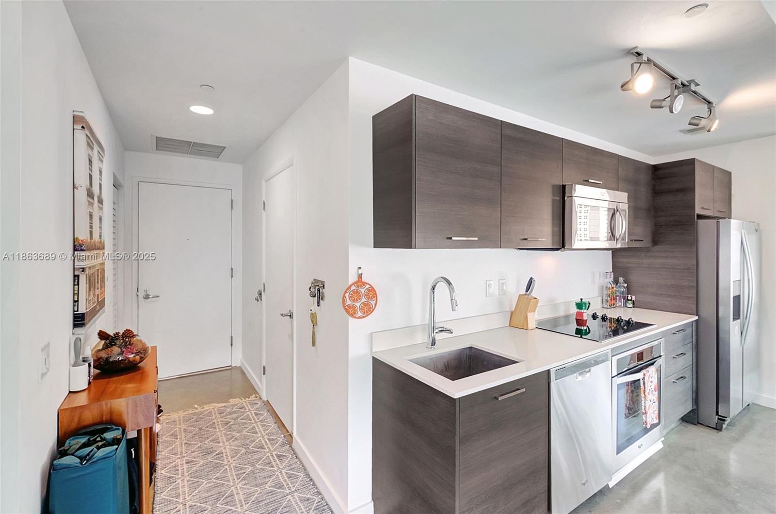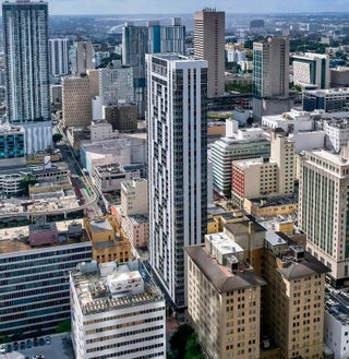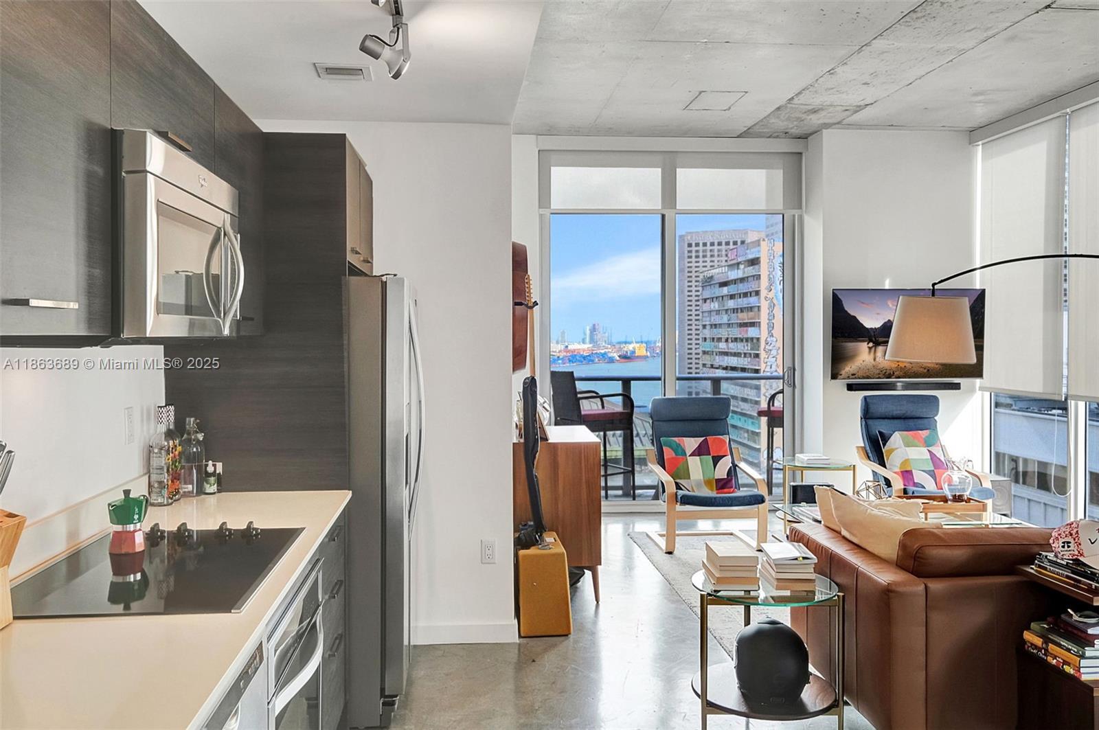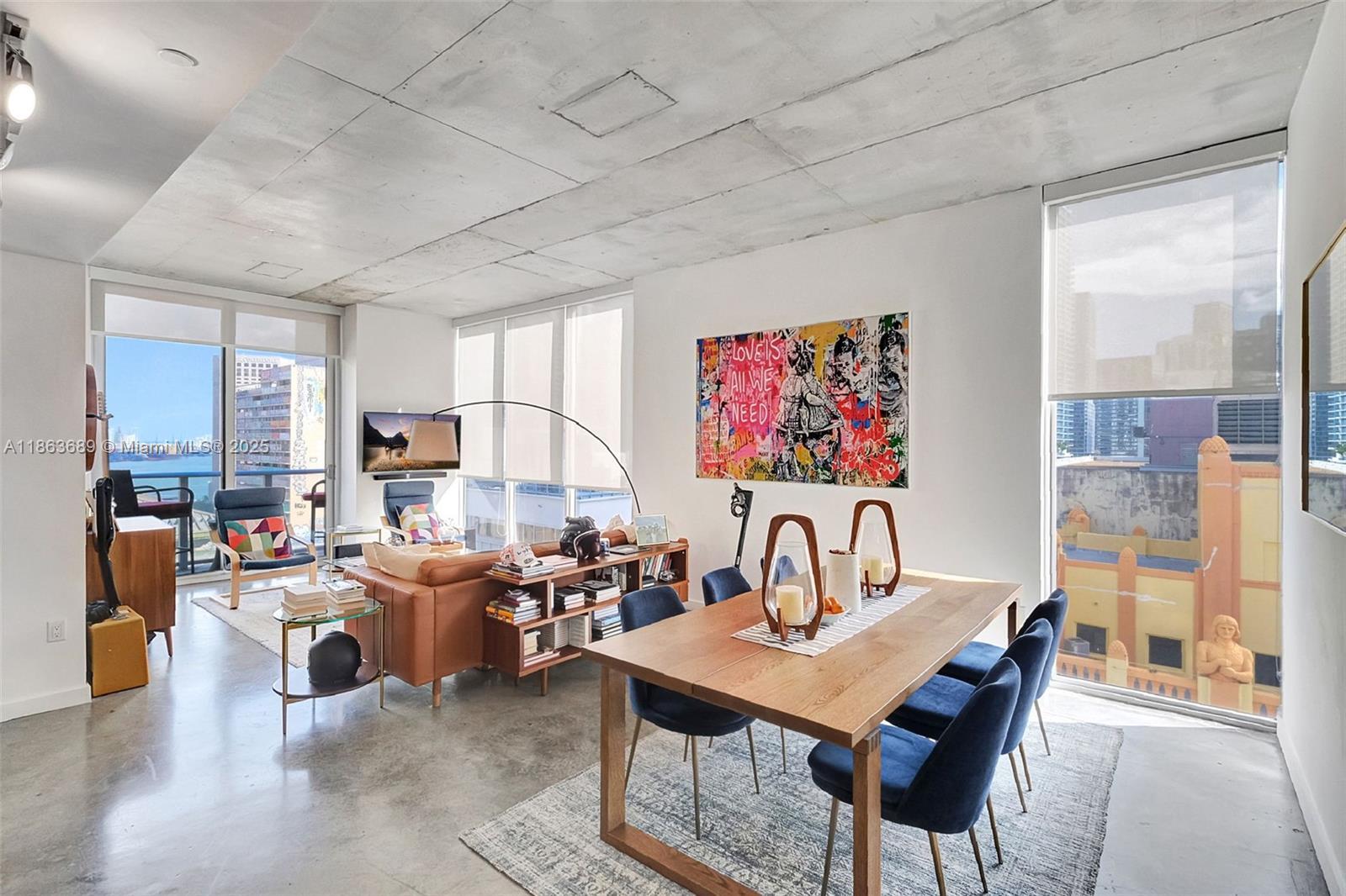 Stunning corner unit with water views of Biscayne Bay and Downtown Miami skyline, all from the comfort of your new loft! This condo features a two bedroom unit with two full baths for a total area of 1,131 SF. The unit comes with beautiful polished concrete floors throughout . This unit features 10-foot high ceilings, expansive floor-to-ceiling glass windows, and custom shades, providing abundant natural light and a seamless connection to the vibrant cityscape. The Italian-inspired kitchen boasts sleek cabinetry, stainless steel appliances, and an open dining-living area perfect for entertaining. Centro Miami offers an array of premium amenities for residents. As for investment minimum rental is 30 days for short term rentals. Walking distance to corporate offices, hotels and restaurants.