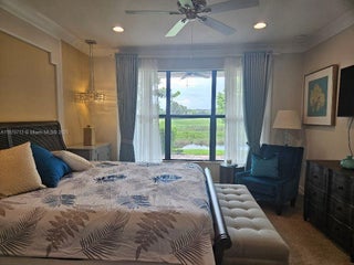 Professionally furnished 3 bedroom with master bedroom on first floor. Separate office with built-ins. This is the largest and most luxurious model home of the community. This corner unit sits on a large waterfront corner lot. Very light and bright open floor plan, 3 1/2 bathrooms, attached 2 car garage and separate laundry room. Large kitchen with double ovens and quartz counter tops and all high end appliances. Open dining and living room overlook the canal and golf course. First floor master suite over looks water with total privacy. Two large walk-in closets and a gorgeous in-suite spa bathroom. Upstairs is a spacious loft ideal for use as the family room or a playroom. Two large bedrooms upstairs with walk-in closets and two full baths. Gated community.