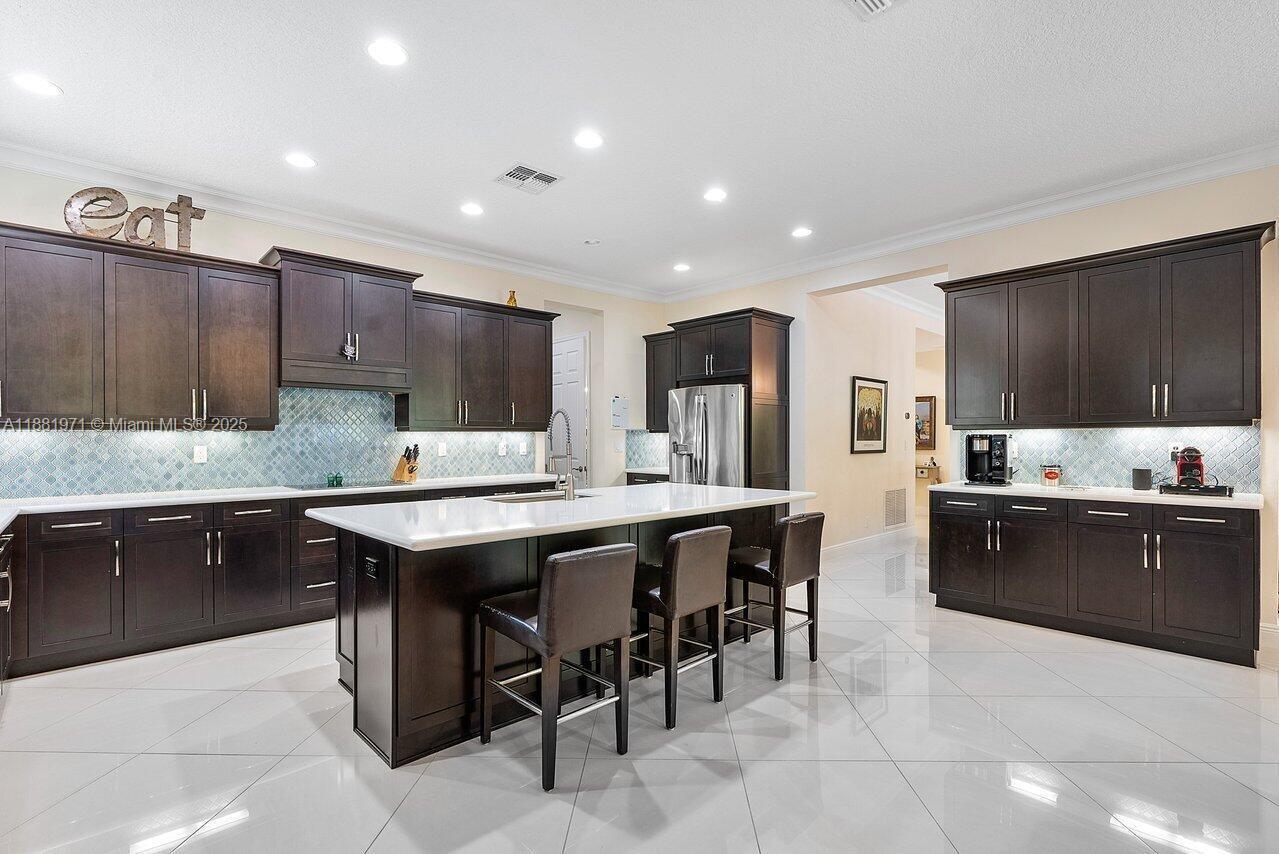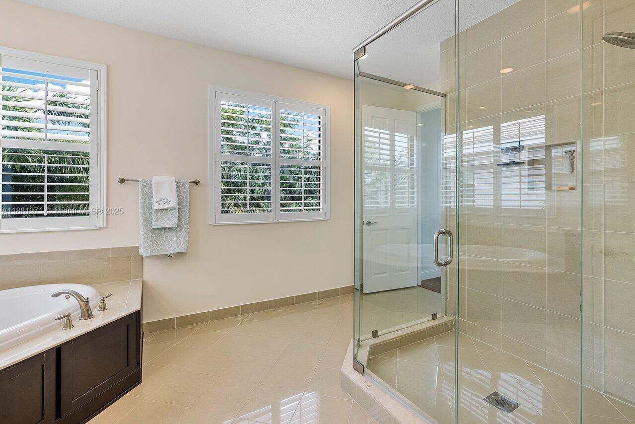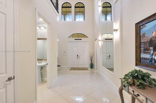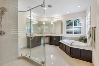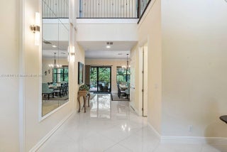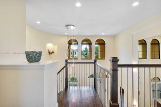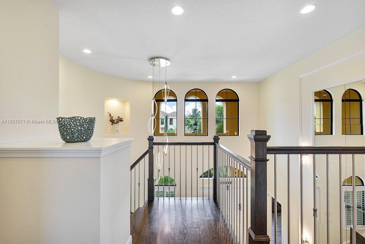 5 bed,4.5 Bths, 2 car gar + Office + Sitting Room off master (which could be 6th Bedroom).You really can have it all! Dramatic 20' foyer entry with curving wood and steel staircase, and floor to ceiling mirror feature. 24'' porcelain tile on the diagonal. Very private backyard area encased in greenery, w heated, salt pool w cascading waterfall, sundeck and 'floating' table, umbrellas. IMPACT GLASS thru-out. Kitchen offers: double ovens, coffee bar, fan vented to Outside, soft close drawers, tiled backsplash, chefs island, SS appliances. Epoxied garage floor. Garage fridge ,wall AC in garage, generator switch - all stay! AUTOMATED outdoor screen for patio! Perfect downstairs set up for 'in-laws-suite' with private 2 bed/1bth wing. Other: Closet Systems, new dryer, 5.5'' basebrds & crown