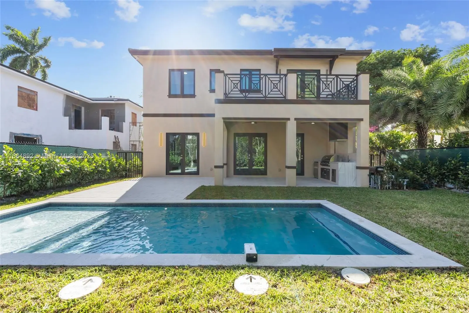 Presenting a stunning newly built residence in the prestigious City of Coral Gables, just completed and ready for immediate occupancy. This exquisite 2025-built home showcases impeccable craftsmanship and modern elegance, offering four generously sized bedrooms and three luxurious full baths. Thoughtfully designed for both comfort and versatility, the home features a conveniently located downstairs suite that can serve as a private office or an additional bedroom with its own full bath, catering to a variety of lifestyle needs. The home features over 3,200 SQFT of living area with 10-foot+ ceilings, open floor plan state of the art kitchen with custom cabinets and high-end appliances. Beautiful outdoor covered terrace with summer kitchen overlooking pool and private yard.