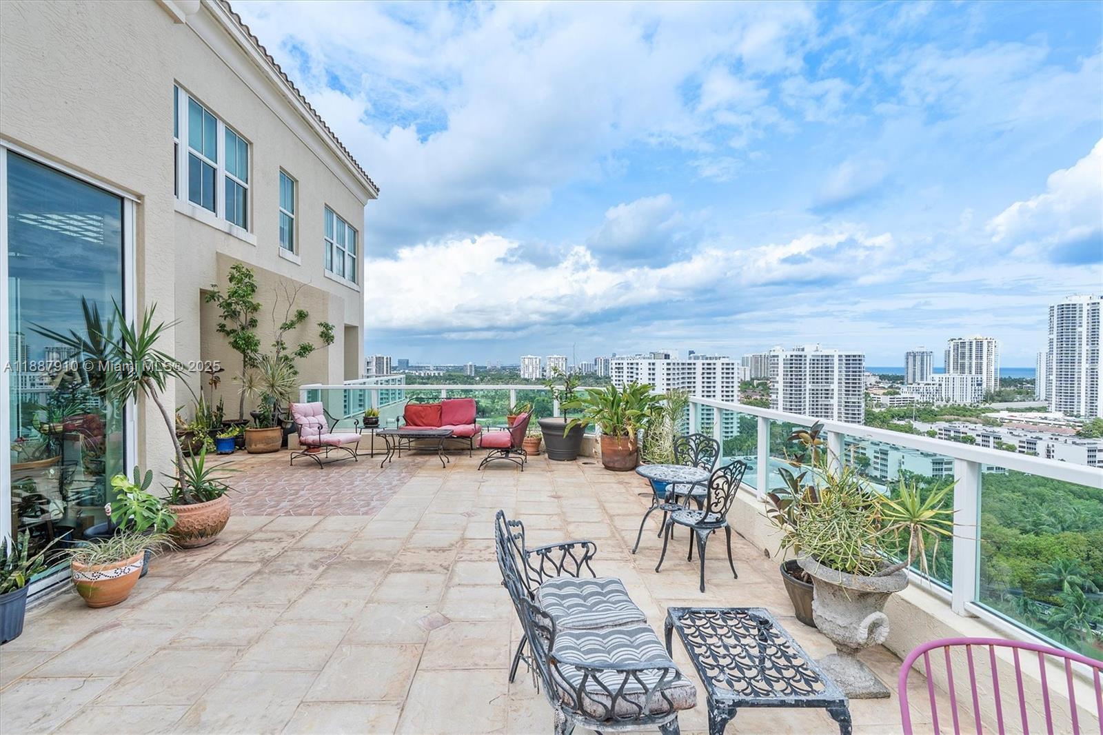 Stunning 2-story corner penthouse with panoramic views of the ocean, Intracoastal & Sunny Isles skyline. Over 2,497 SF interior plus 1,000 SF terrace for outdoor living. Features 12 ft ceilings, wood & porcelain floors, open kitchen, walk-in closets, laundry room, and large storage. Exclusive gated community with marina, walking paths, spa, gym, 2 pools, 4 tennis courts, concierge, valet & 24-hr security. Includes 2 garage spaces. Prime Aventura location.