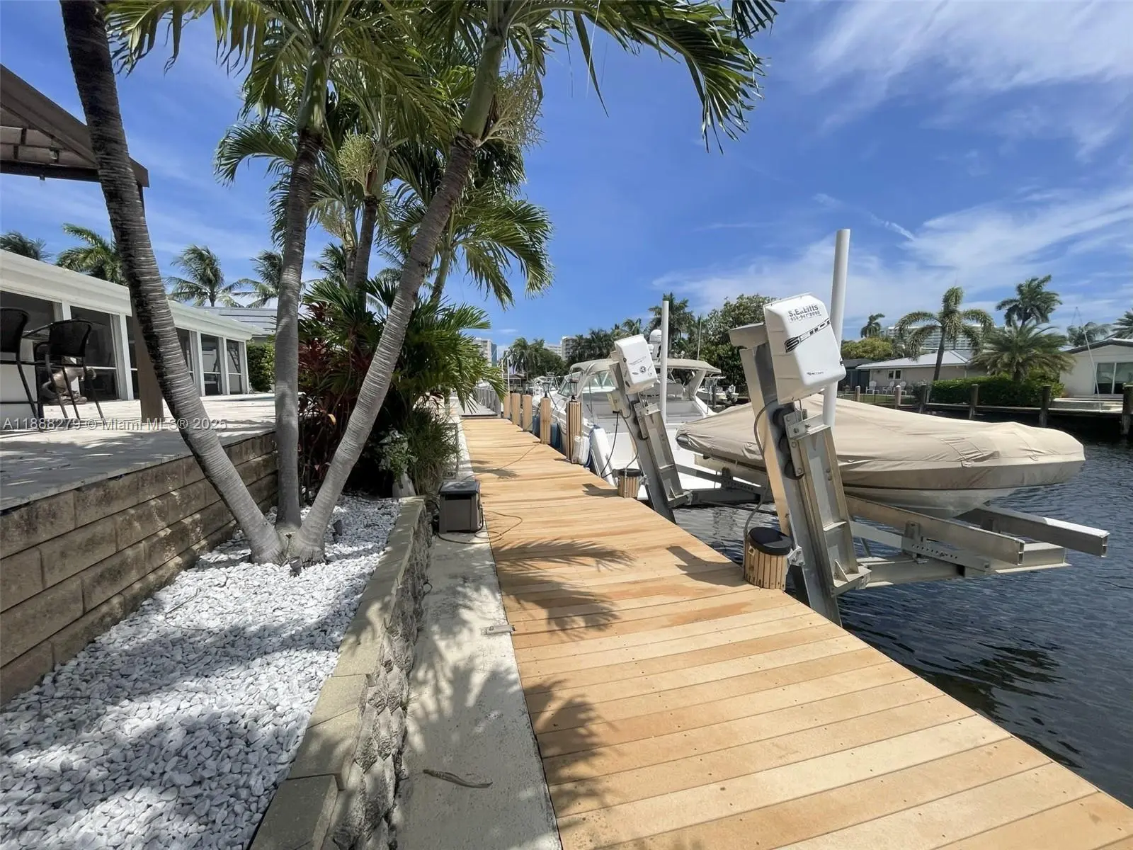 Turn-key furnished Intracoastal estate offering the ultimate South Florida lifestyle. Rare southern exposure backyard provides all-day sun, even in winter. Includes a 45’ sport cruiser yacht and 14’ turbo jet tender, an 80’ private dock, 25,000 lb boat lift, and direct ocean access in just minutes with no fixed bridges. A sliding patio door wall opens the living room to the Florida room, creating seamless indoor–outdoor living. The outdoor oasis features a pool, jacuzzi, summer kitchen, plus a sprinkler system connected to reclaimed city water. Home comes fully furnished and equipped with electric hurricane shutters and impact-rated protection on all windows and the garage door, along with a spacious double garage. A rare opportunity to own a true waterfront retreat with yacht included.