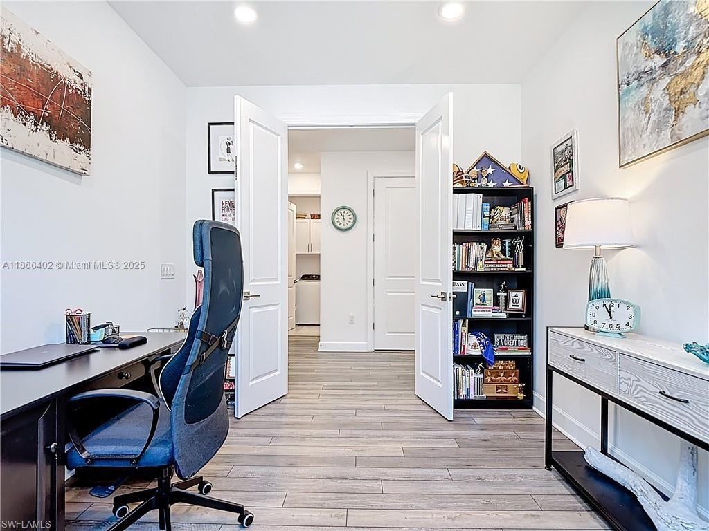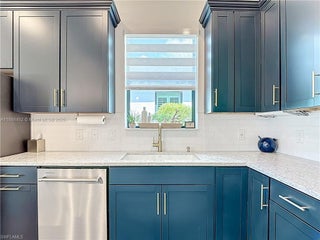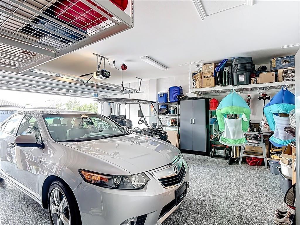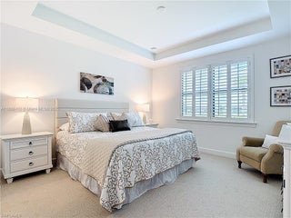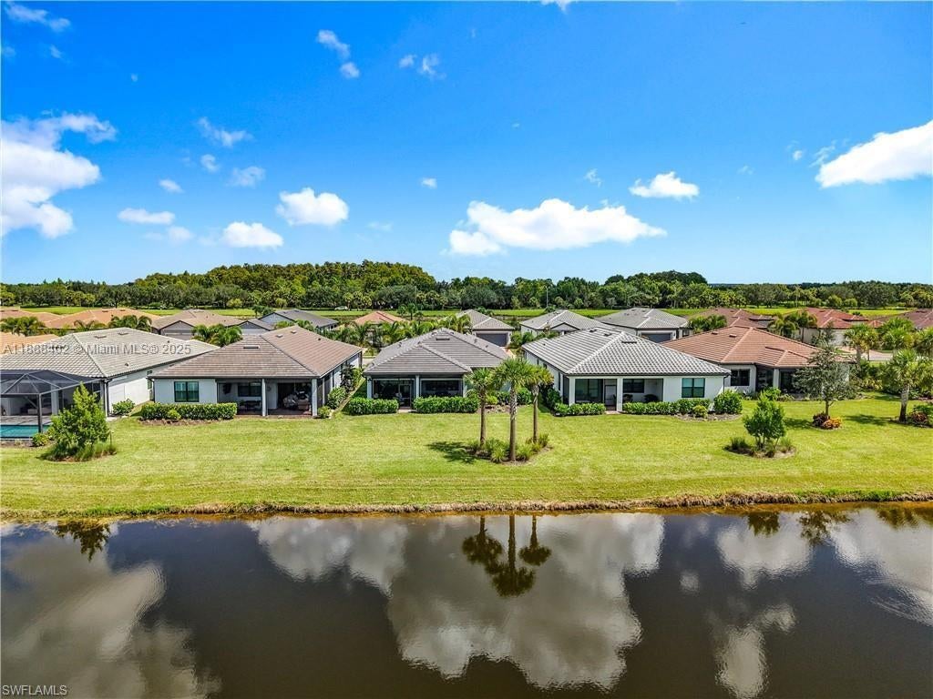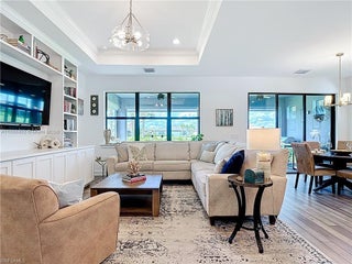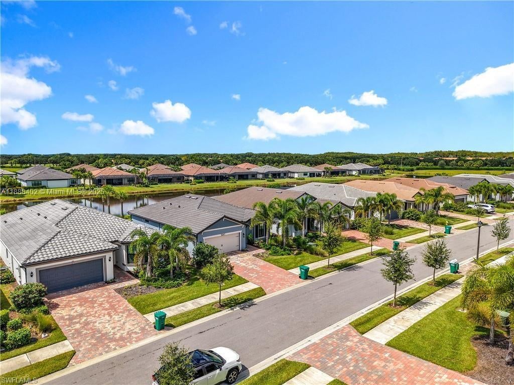 Upgraded Prosperity floor plan with 2 bedrooms, 2 baths, den, and GOLF MEMBERSHIP. Features include epoxy garage floors with storage, gourmet kitchen with built-in stainless appliances, quartz counters, and family room with custom TV wall. Owner’s suite offers a spacious bedroom and frameless glass shower. Plantation shutters throughout. Extended screened lanai has outdoor kitchen with Thor appliances; rear includes hurricane roll-down shades. Located in Del Webb Naples, a 55+ community with two clubhouses, pools, fitness, dining, pickleball, tennis, bocce, garden, trails, and optional golf.