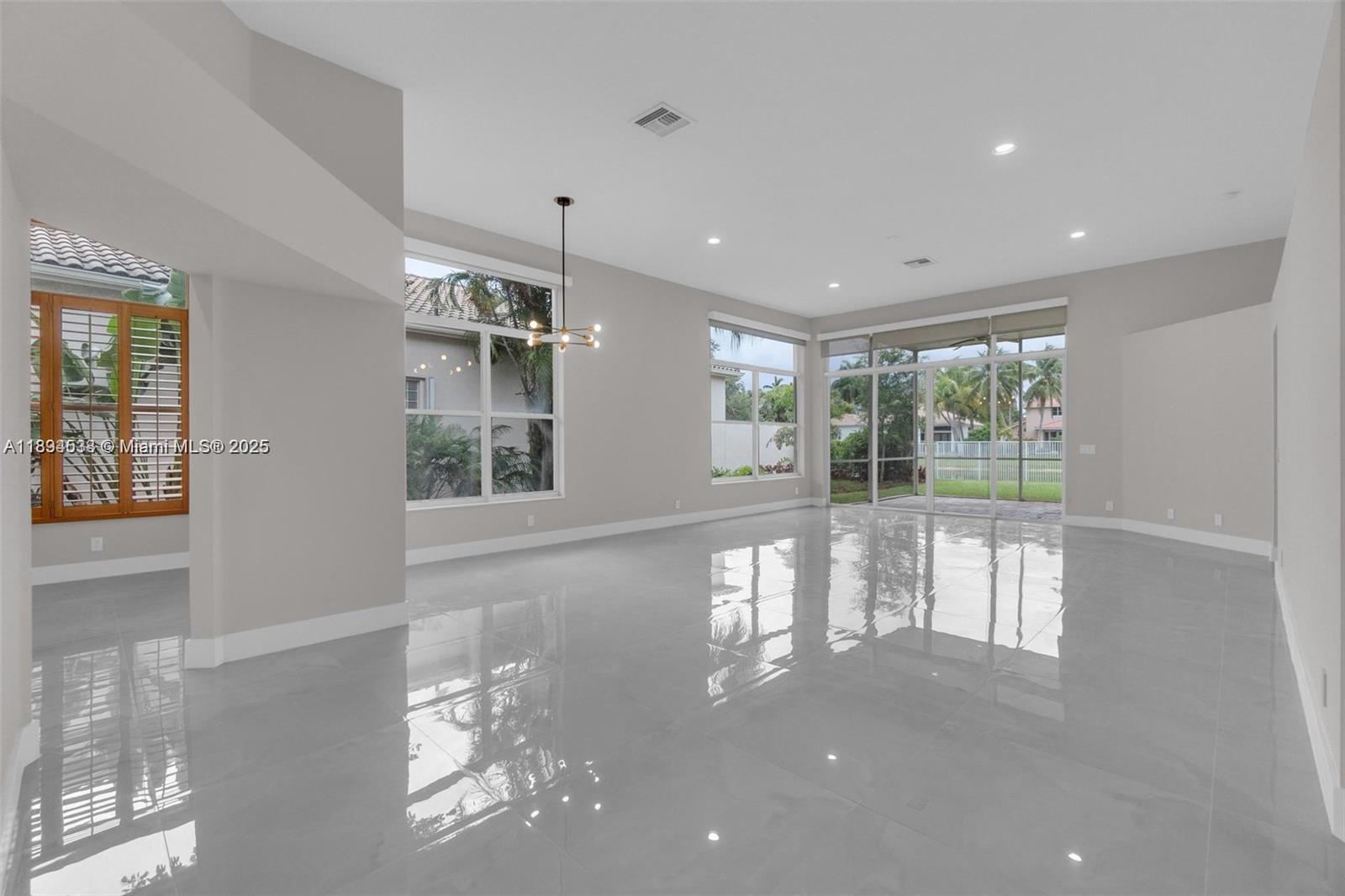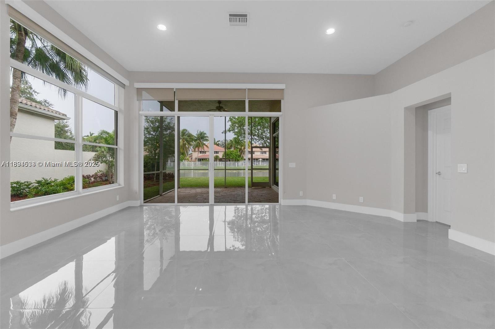 Completely remodeled !l 3 bedrooms 3 full bathrooms one-story waterfront home in the gated community at Weston Hills. Spacious open floor plan with soaring ceilings and serene lake views. Bright and airy living and dining areas. Kitchen features wood cabinets, granite countertops, stainless steel appliances and a breakfast nook. Wood and tile flooring in common areas. Primary suite offers 2 walk-in closets and large bathroom with tub, shower and dual sinks. One guest bedroom is en-suite with private bathroom. Relax and enjoy breathtaking sunsets from the oversized screened patio overlooking the large fenced backyard, with room for a pool, ideal for entertaining! Large laundry room with sink and 2-car garage. Enjoy 5-star resort-style amenities. Close to I-75, dining and parks. A+ schools.