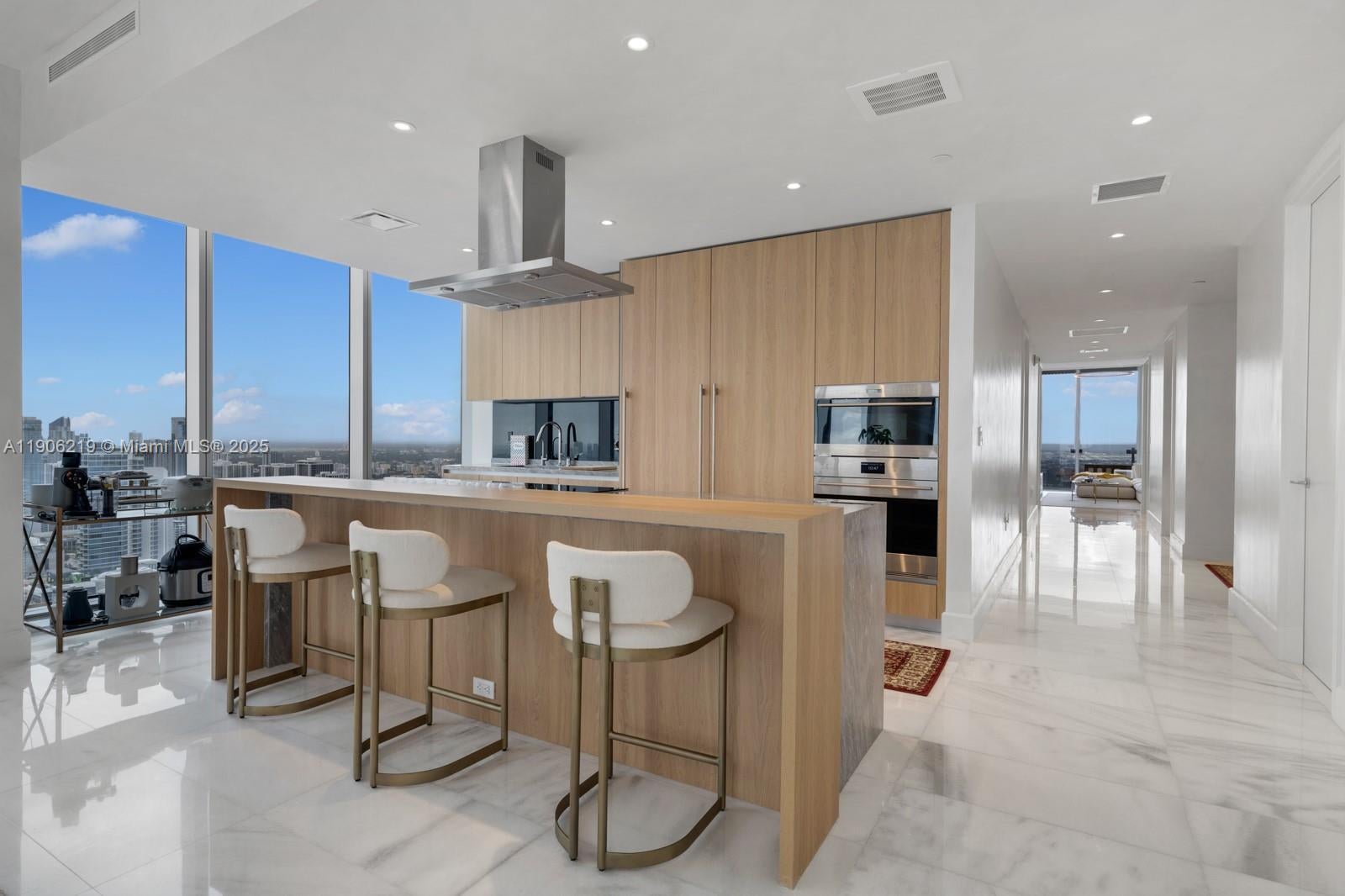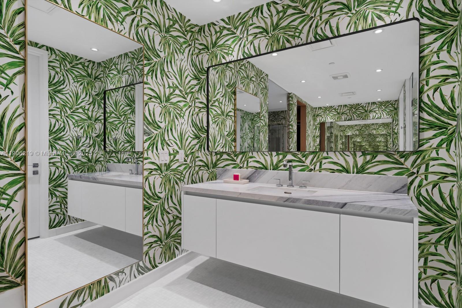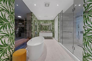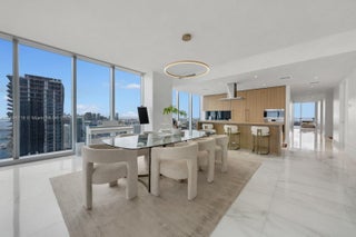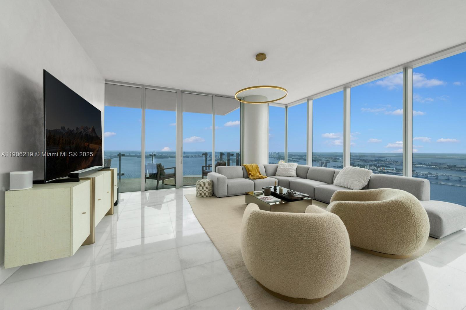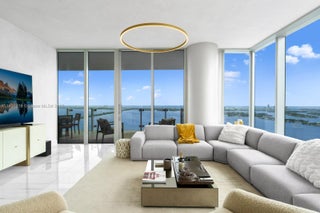 The only move-in ready 03-line at Missoni Baia! This stunning 4-bedroom + family room, 6-bath residence offers floor-to-ceiling glass on all sides, filling the home with natural light and showcasing breathtaking bay, ocean, and skyline views. The living room is surrounded by windows, creating a bright, airy ambiance that seamlessly connects to two large patios overlooking the water. Features include a private elevator entry, high ceilings, built-out closets, designer window treatments, and top-of-the-line WOLF & Sub-Zero appliances. Residents enjoy a hotel-style lifestyle with two pools, a tennis court, valet parking, spa, and fitness center—all with the unmistakable Missoni touch and a seamless blend of comfort, elegance, and resort-style living every day.