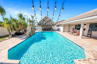 A tropical oasis perfectly positioned on an expansive, private lot. This home is built for the ultimate Florida lifestyle! Offering soaring vaulted ceilings and an abundance of natural light throughout, the generous floor plan features an open kitchen with oversized family room ideal for lounging or entertaining. The party can spill onto the resort style backyard serving as a personal tropical retreat with a stunning pool area, custom tiki hut and an impressive built-in summer kitchen, making every weekend feel like a vacation. Enjoy your "waterfront" primary suite overlooking the pool area. A versatile loft provides the perfect spot for a secluded home office, media room, or playroom. Other features include Metal Roof, 2 car garage, impact windows and new appliances.