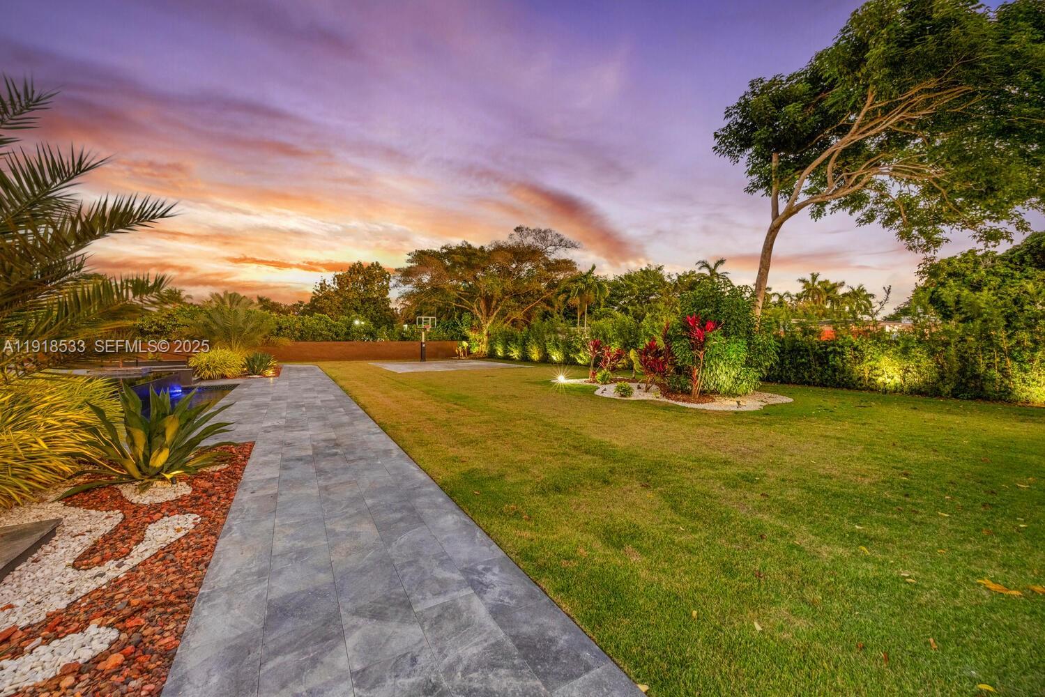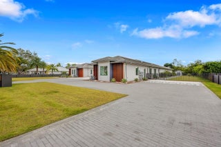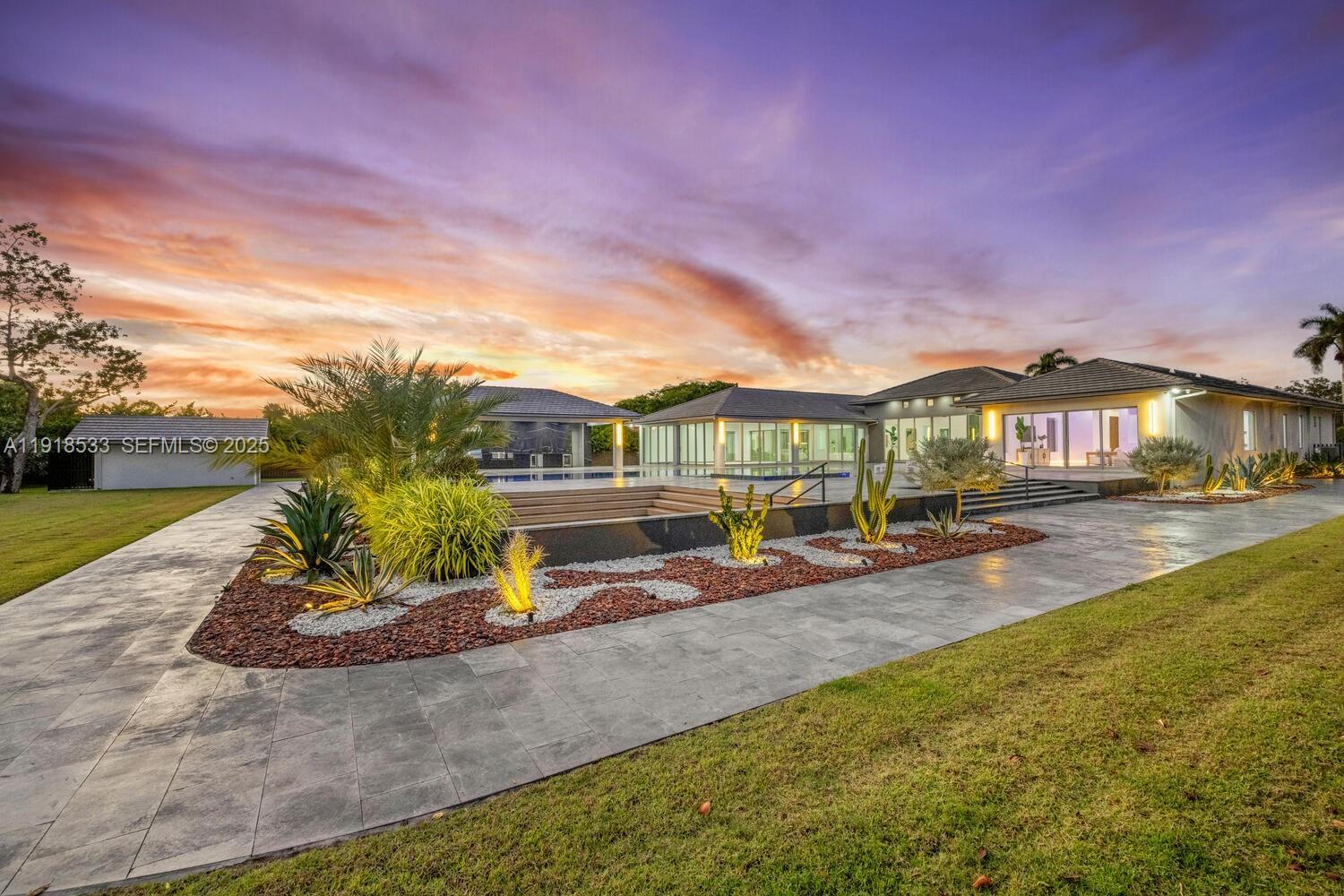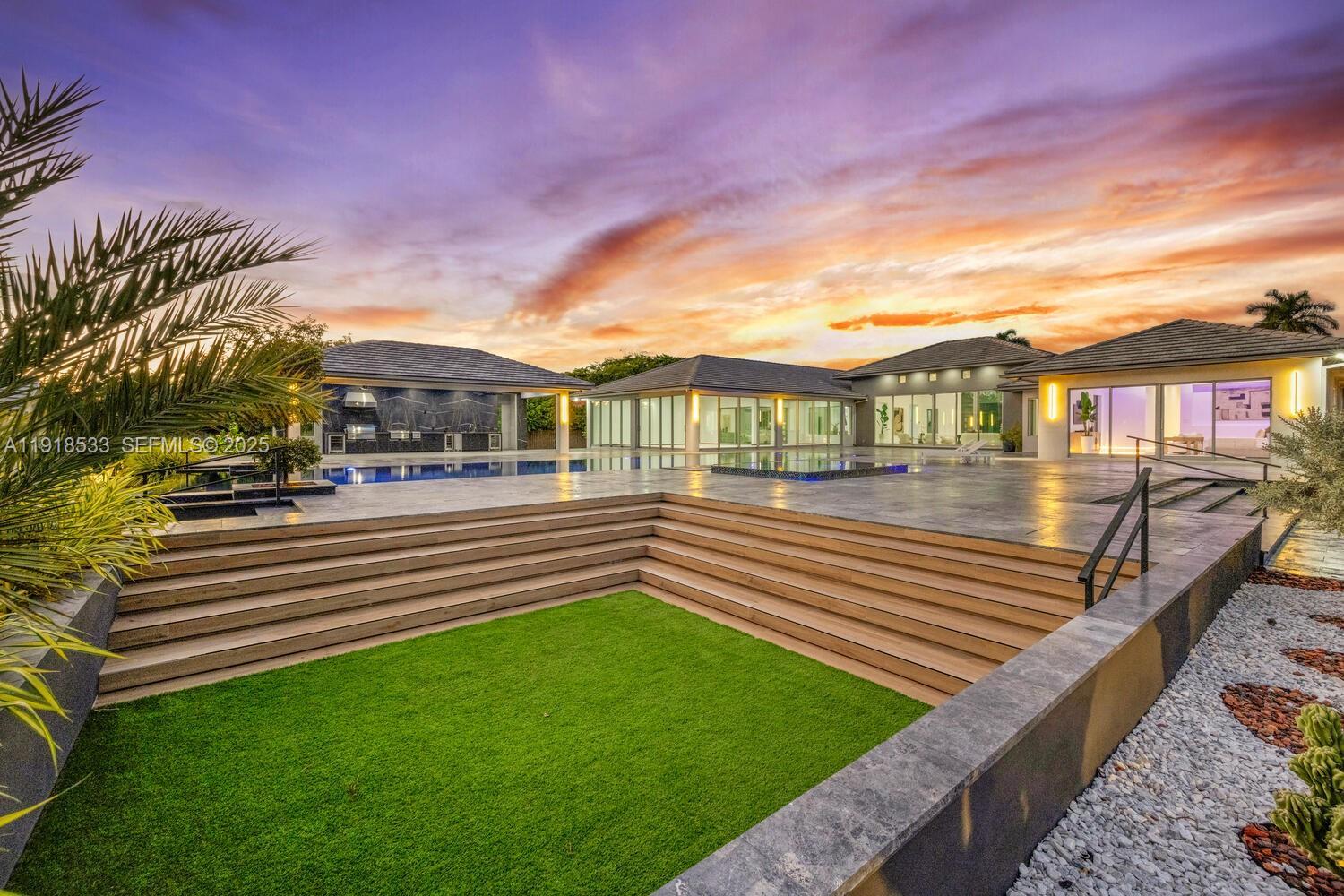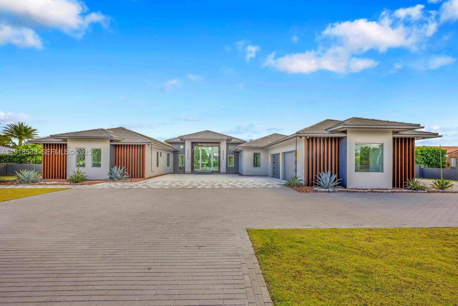 Experience modern luxury in this exceptional 1-story estate offering 6 bedrooms, 6.5 baths, and 8,067 sq ft of living space on 1.25 lush acres. A 12-ft pivot glass door and soaring 15 ft ceilings set a grand tone for refined interiors with Italian porcelain floors. The chef’s kitchen includes Wolf and Sub-Zero appliances, custom cabinets, quartzite counters, a large island, and a cable wine display. A glass-wrapped sunroom opens to the summer kitchen and patio. Enjoy a 70-ft knife-edge pool, 10×14 overflow spa, fire-pit lounge, half basketball court, and 3-car garage.