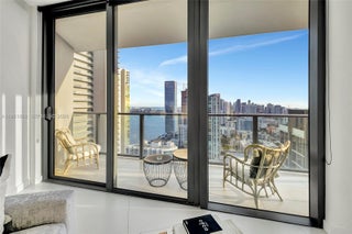Welcome to Paraiso Bayviews #3708 — a high-floor 2BD/2BA + den residence with sweeping, unobstructed Biscayne Bay and Miami skyline views. This split floor plan features floor-to-ceiling glass, an open European kitchen with premium cabinetry and quartz countertops, porcelain flooring throughout, and an expansive wraparound terrace ideal for sunrise and sunset living. Primary bedroom includes a private balcony with city views. Resort-style amenities include a 46th-floor rooftop pool with 360° views, 5th-floor pool, state-of-the-art fitness center, sauna, massage rooms, coworking spaces, theater, game room, kids’ room, club room, plus access to the Paraiso District beach club, marina, and Amara restaurant. One assigned parking space and 24/7 concierge/security.Prime Edgewater location — minutes to Design District, Midtown, Wynwood, Downtown/Brickell, and a short drive to Miami Beach. Ideal for relocation buyers.