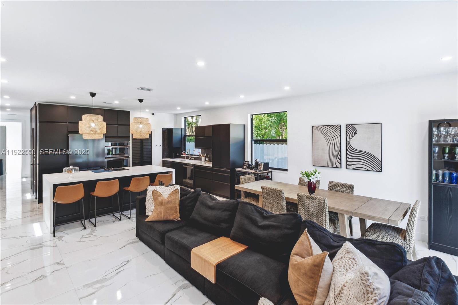 Newer construction (2022). Pure perfection with no detail spared. This immaculate, turn-key home offers an open floor plan with 4 bedrooms, 4.5 baths, and 2,594 sq ft of living space. Features include oversized porcelain floors throughout, chef’s kitchen, impact windows, and pristine bathrooms. The dream kitchen showcases custom cabinetry, black stainless-steel appliances, and a new extended-island countertop. Additional highlights: built-in closets, electric fence, sprinkler system, and more. Convenient ground-floor bedroom with full bath and direct access to the exterior patio. The second floor offers three bright, spacious bedrooms. Centrally located near Brickell, Coral Gables, Coconut Grove, the airport, and more.