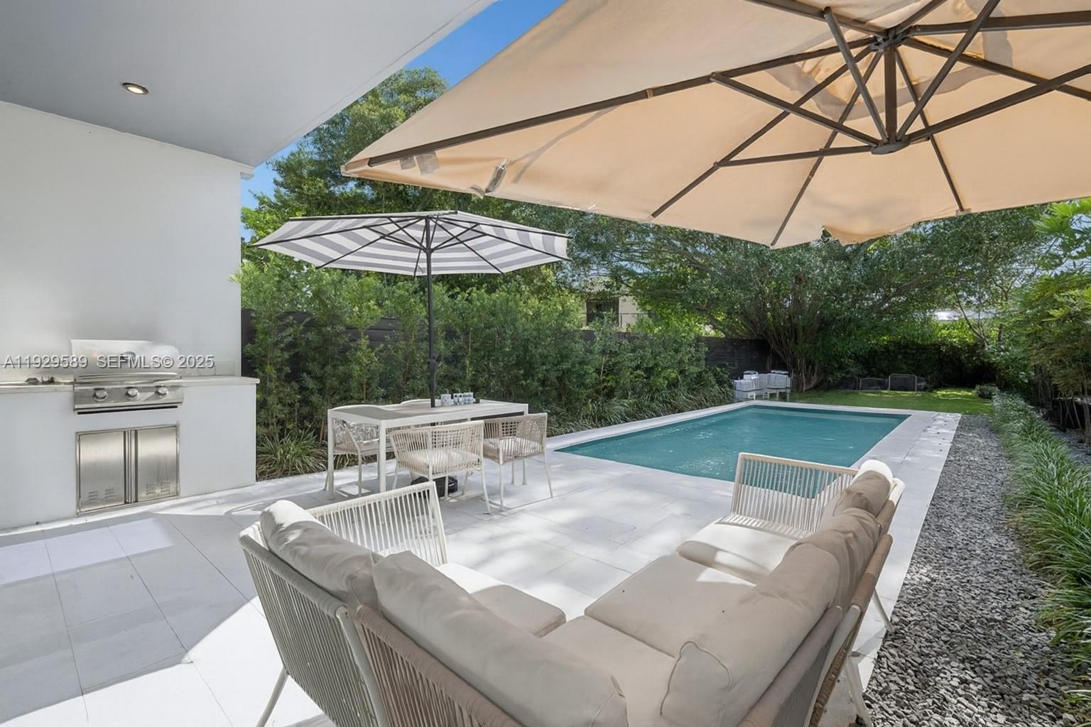 Luxury 3-bedroom, 3.5-bath townhome offering exceptional indoor-outdoor living. Tile floors throughout complement the Italian kitchen cabinetry, Spanish porcelain tile, and European appliances. Floor-to-ceiling sliding doors open the living area to a covered patio with a summer kitchen, oversized pool, and a rare and expansive yard providing an exceptional offering in the Grove. All bedrooms are located upstairs with ensuite baths. The primary suite features two walk-in closets, a private covered terrace, and a spa-style bath with separate tub and shower. Deep driveway accommodates two vehicles, plus a one-car garage with EV charger. Ideally located minutes to Downtown Coconut Grove, shops, cafés, and the farmer’s market.