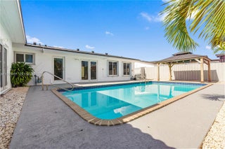 This move-in-ready 4-bedroom, 2-bath residence blends modern upgrades with everyday comfort. Highlights include a durable metal roof, impact windows, and a newly poured oversized concrete driveway. The interior and exterior have been freshly painted, creating a bright, clean canvas throughout. An open, sun-filled living space flows into a renovated kitchen with granite counters and stainless-steel appliances. Step outside to a fully fenced backyard designed for relaxation, featuring a sparkling pool, covered gazebo, and a separate storage structure. Low-maintenance landscaping completes this private retreat, all conveniently located near major roads, shopping, and dining.
