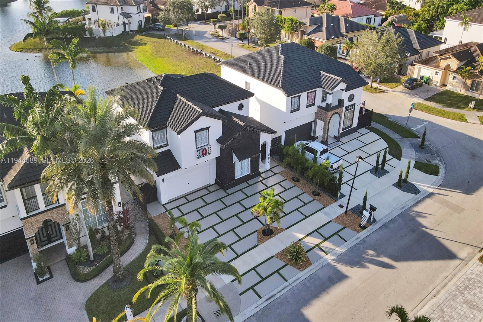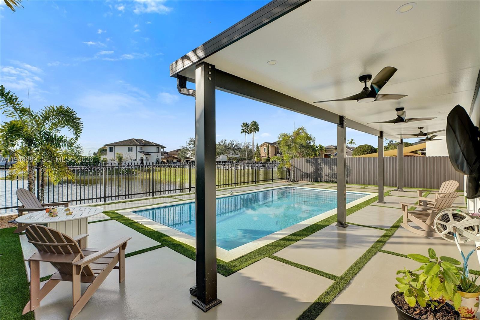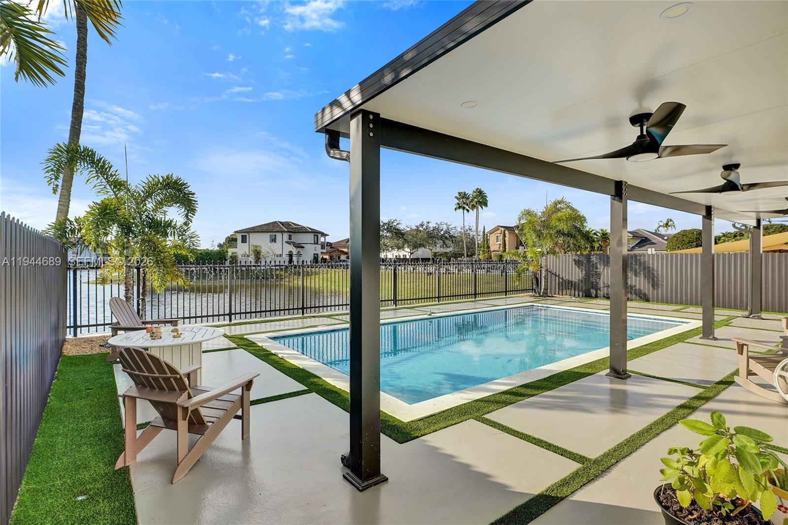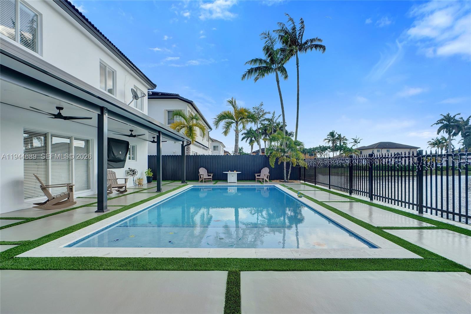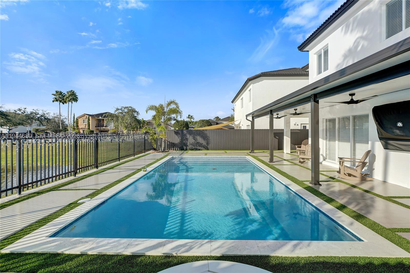 Beautifully updated 4-bedroom, 3-bath modern residence offering porcelain flooring, soaring ceilings, and an expansive open-concept kitchen with high-end finishes. Features include a two-car garage with EV charging, covered terrace, contemporary pool with LED lighting, and serene waterfront views. Move-in ready with outstanding curb appeal, located in a secure, non-HOA community. A truly exceptional opportunity.