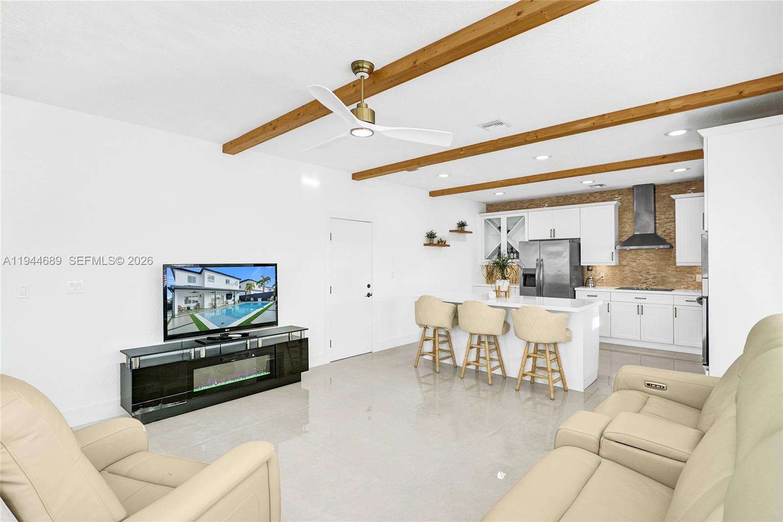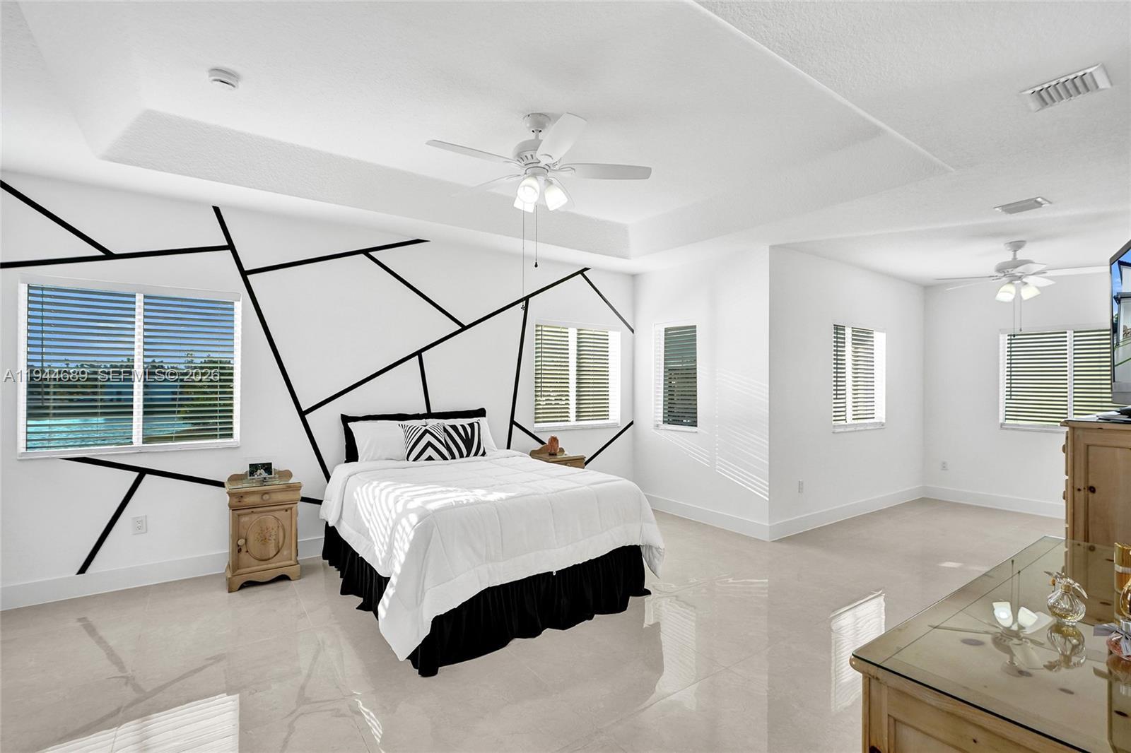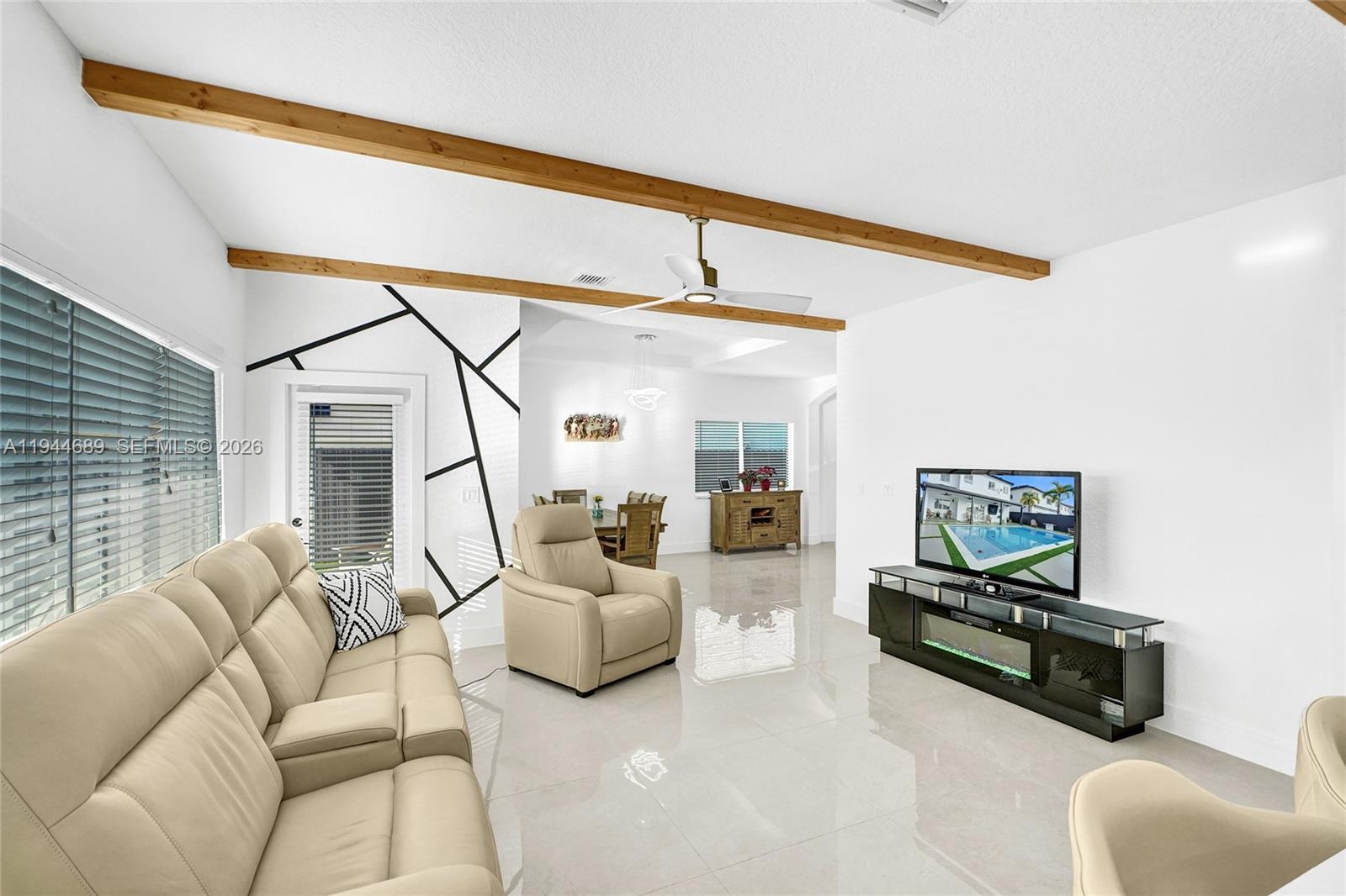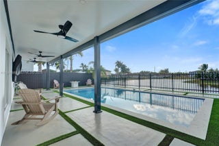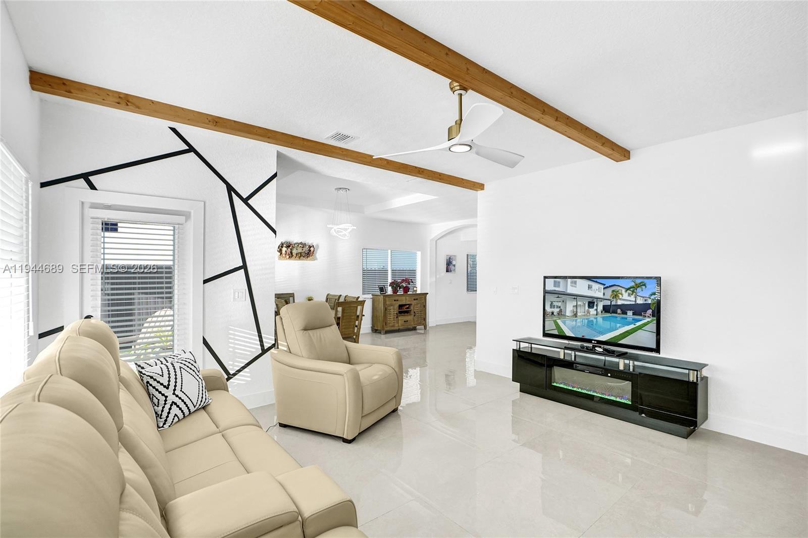 Beautifully updated 4-bedroom, 3-bath modern residence offering porcelain flooring, soaring ceilings, and an expansive open-concept kitchen with high-end finishes. Features include a two-car garage with EV charging, covered terrace, contemporary pool with LED lighting, and serene waterfront views. Move-in ready with outstanding curb appeal, located in a secure, non-HOA community. A truly exceptional opportunity.