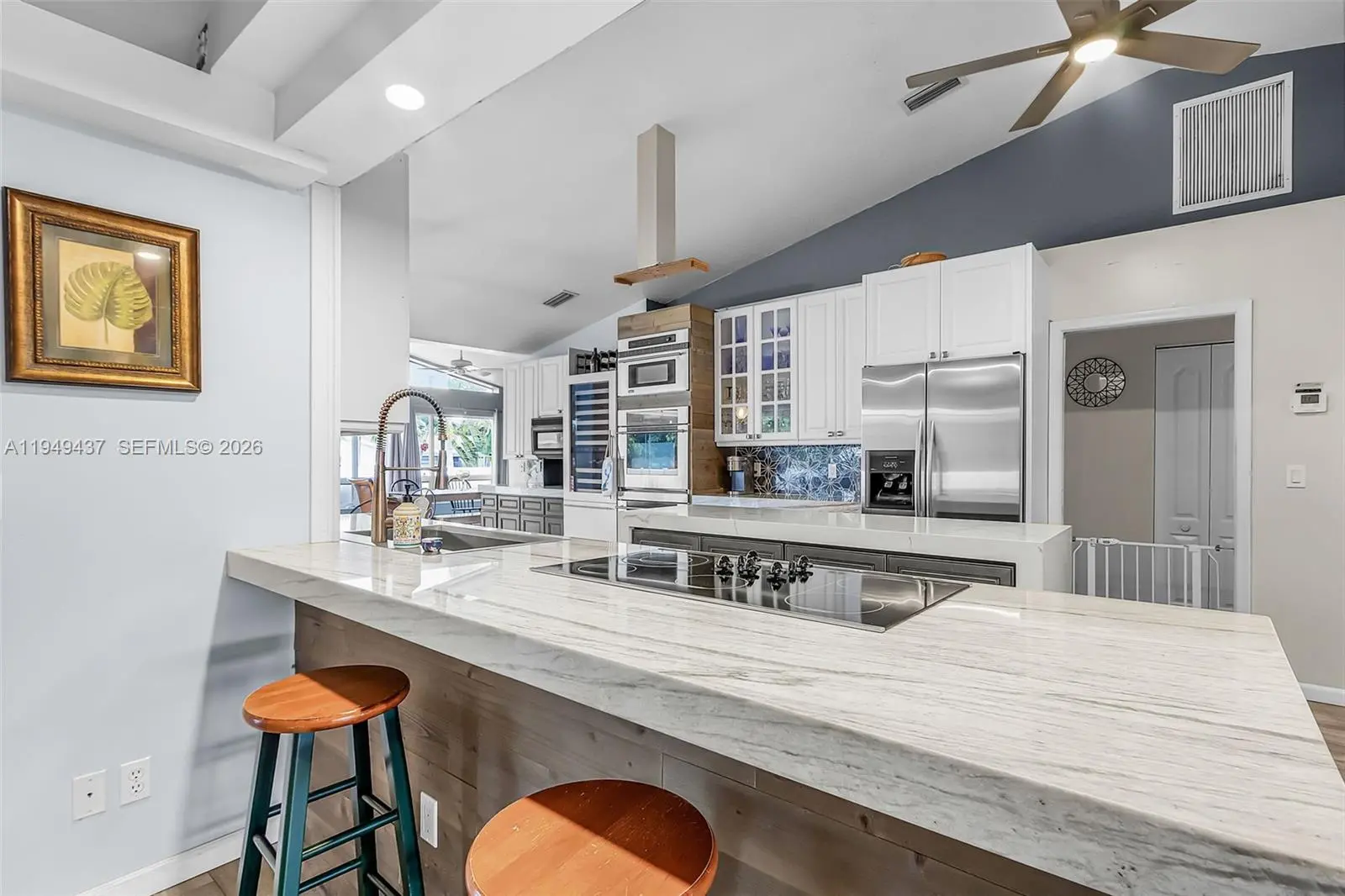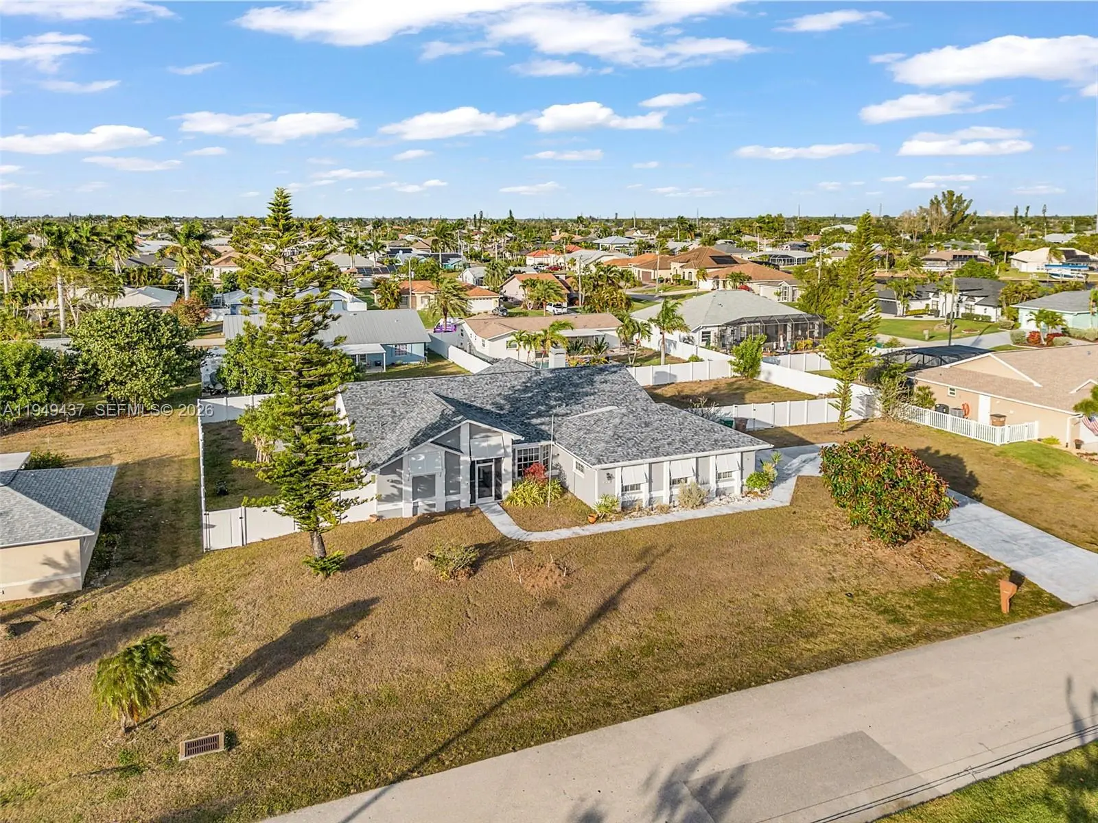 Prime SW Cape Coral Remodeled Pool Home on an Rare 4-Lot site – Nearly Half an Acre! Discover this exceptional, never-flooded property nestled in one of Southwest Cape Coral’s most desirable family neighborhoods, just off Pelican Blvd. Known for its annual Halloween celebrations. Just minutes from downtown Cape Coral, Tarpon Point’s waterfront dining, & Rotary Park’s scenic trails & dog park, this location offers the perfect balance of convenience and tranquility. Situated on an oversized .43-acre (4-lot) site, this beautifully updated home offers 2,242 sq ft with 3 bedrooms & 2.5 baths, delivering privacy & endless future potential. The backyard is a true showstopper, featuring a brand-new heated saltwater pool (2023), pavered deck, & a large covered lanai. Perfect for entertaining year-round. Pool cage footers are already in place, saving money, & the half bath doubles as a convenient pool bath. Inside, the fully remodeled gourmet kitchen shines with quartz waterfall countertops, custom cabinetry, wine cooler, double ovens, newer appliances, & an eat-in dining area overlooking the pool. A flexible dining room with built-in fireplace easily converts to a home office or second living space. The owner’s suite offers pool access, dual walk-in closets, & a spa-style bath with soaking tub, walk-in shower, & double vanities. Updated guest bath, newer flooring, & rare air-conditioned attic storage complete the home. Roof, Pool, & Vinyl Fence all 2023 Garage Door 2024