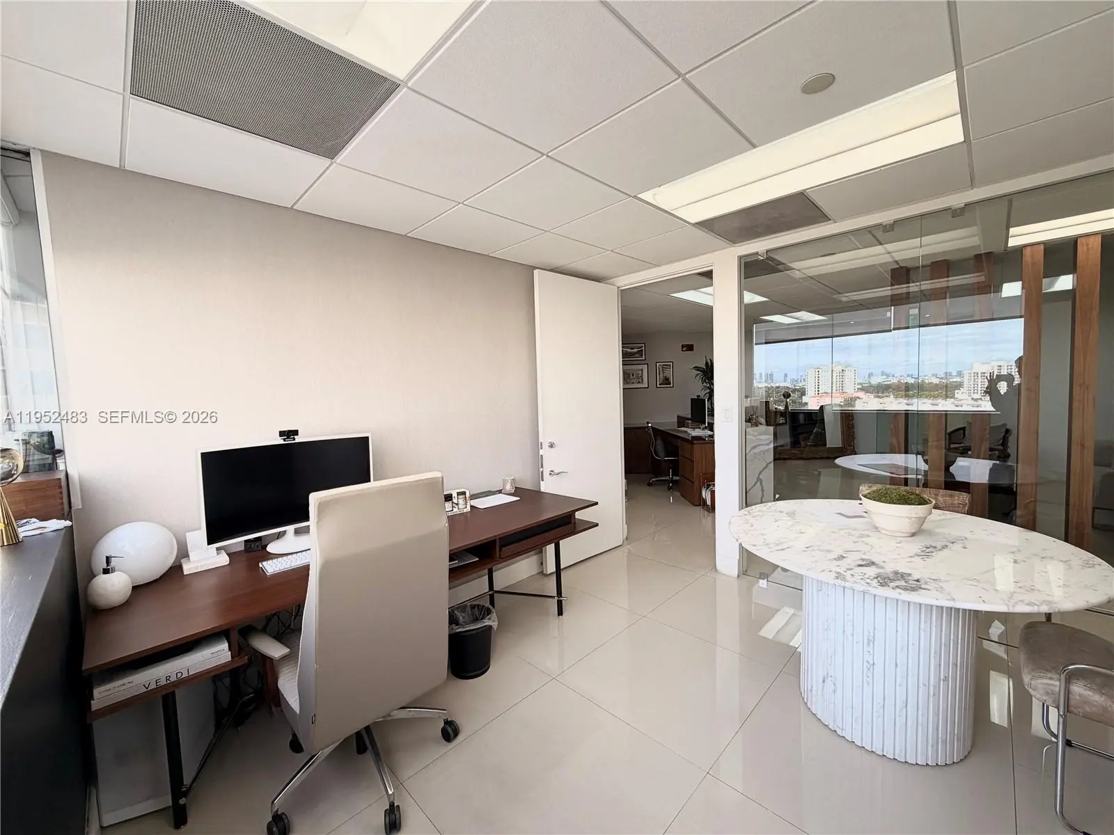 Suite 920 offers 2,198 RSF of elegant, move-in ready office space featuring double glass entry doors and an inviting reception/waiting area. The current layout includes: • Three (3) private window offices, each with glass partitions and glass doors • One (1) large conference room, also with with glass partitions and glass doors, which can easily be converted into two additional window offices • A spacious open area, ideal for workstations or to build up additional offices or a conference room • A kitchenette with stainless steel appliances and running water The suite features porcelain floors throughout, abundant natural light, and breathtaking skyline views of Brickell and Downtown Miami. Currently occupied by a renowned interior design firm, the space showcases refined finishes and exceptional taste—ideal for design, architecture, legal, or professional service firms seeking a modern, flexible, and bright workspace. Adjacent Suite 930 (1,500 rsf) available at the same time for a total of 3,698 RSF continue prime office space. A must-see opportunity in the heart of Coral Gables! *** EASY TO SHOW *** CALL LISTING AGENT ***