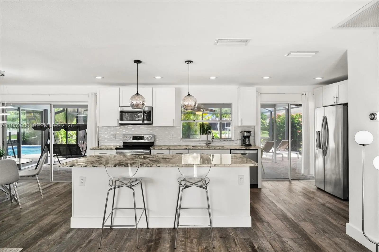 Welcome to your Direct Gulf Sailboat Access Paradise! This 2-bedroom, 3 full bathroom Pool home is located below Cape Coral Pkwy and has no bridges between you and open water. The Island Kitchen features a breakfast bar, granite countertops, tile backsplash, stainless steel appliances and lots of storage. The Primary Suite has sliding doors directly to the Lanai and pool area. The 2nd bedroom has lots of windows for natural light. There are 3 full bathrooms, including a guest bath and a pool bath. This remodeled home has many upgrades throughout, including wide plank LVP flooring throughout and a fresh, modern look. The large, covered lanai faces West and overlooks the screened, heated pool and the gulf access canal. There is a dock and 10,000 lb boat lift with 80 feet of frontage ready for your marine adventures. Just a short boat ride to restaurants, beaches, and the Gulf. The home sits on a quiet street near the end of a cul-de-sac. Walking distance to Rotary Park, also close to Tarpon Point and downtown Cape Coral. ROOF 2017, WHOLE HOUSE RE-PIPED IN 2021, DOCL/LIFT 2018! Sold TURN-KEY AND READY TO MOVE IN! Call today for more information or a private showing!
