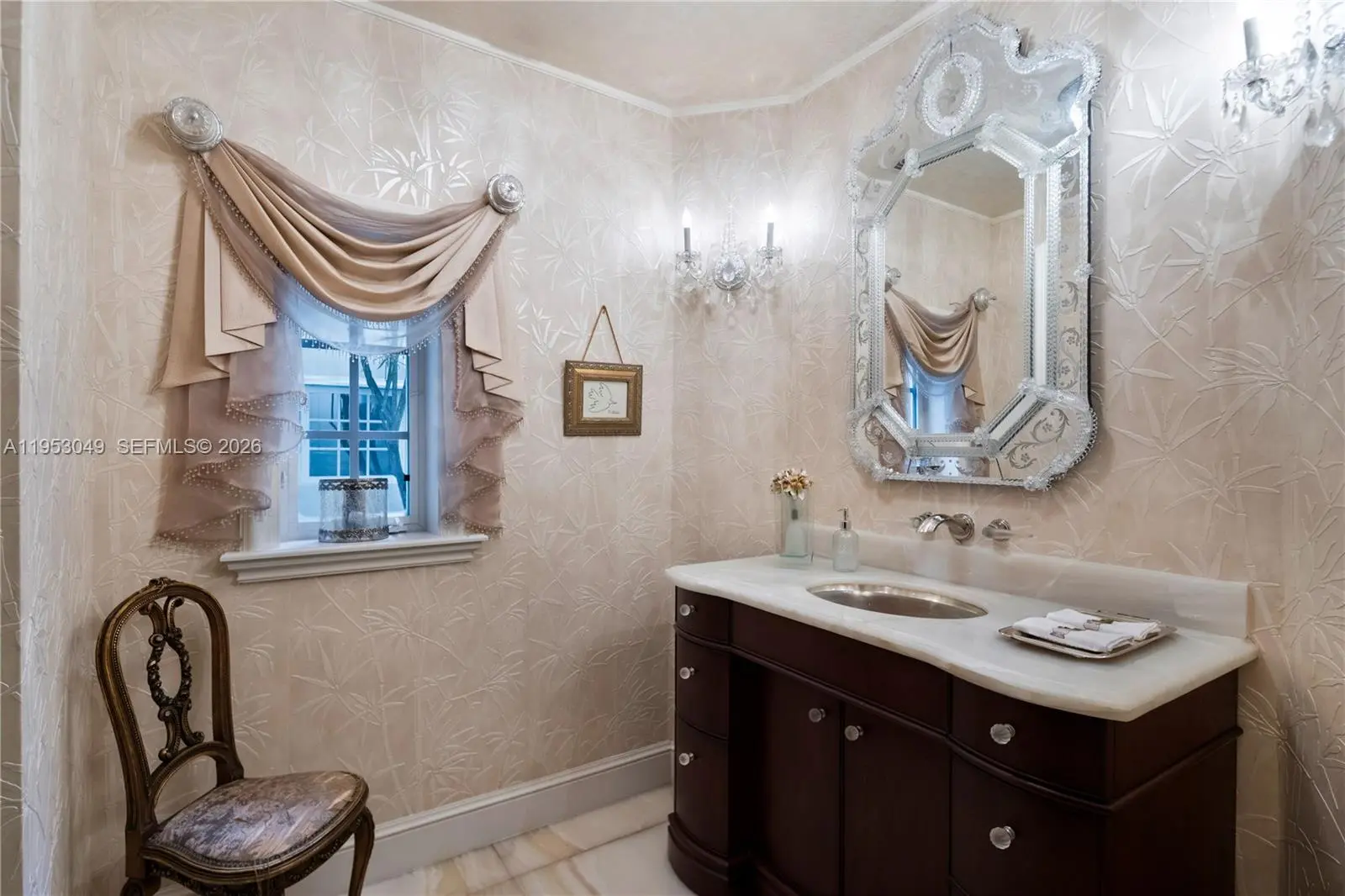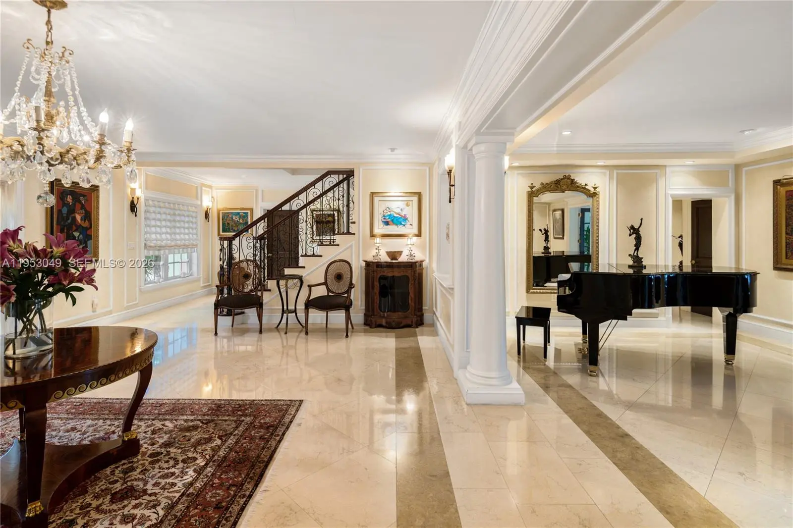 Tucked away behind a private gated entrance, this stunning 9,148 SF storybook estate spans 37, 358 SF of lush, manicured grounds with a remarkable 256 feet along the Coral Gables Waterway. A Chicago brick driveway leads to the classic grand residence where elegance meets comfort. Inside, marble and cherry wood floors flow in sunlit spaces, while the impact windows and French doors reveal a resort-style picturesque backyard. A sprawling terrace surrounds the saltwater heated pool, offering many spaces for al fresco dining and lounging, overlooking serene waterway. Entertain in style with walk-in wine cellar, chefs kitchen, and lavish primary suite. With 5 bedrooms, service quarters, cabana, 2 car-garage, whole-house generator and expansive gardens, this is a rare retreat in a prestigious setting.