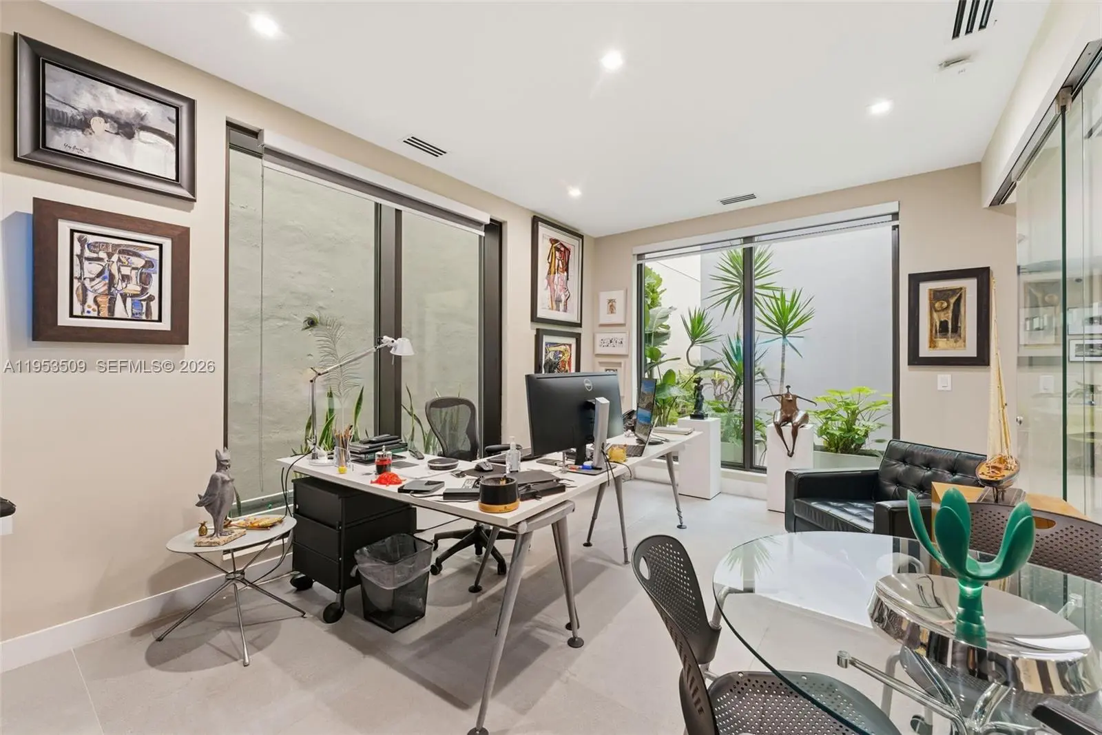 Exceptional free-standing commercial building. Fully renovated with completed 40-year recertification. Located in the heart of Coral Gables. Adjacent to public parking garage and metered street parking. Features impact windows and doors, porcelain and marble floors, and high-end finishes throughout. Security system includes cameras, alarm, and intercom. The property offers a welcoming lobby, five private offices, open floor plan with workstations accommodating up to nine desks, conference room, IT room, break room, two half baths, and one full bath. abundant natural light. Two-car garage may be converted to additional office space. Furniture negotiable.