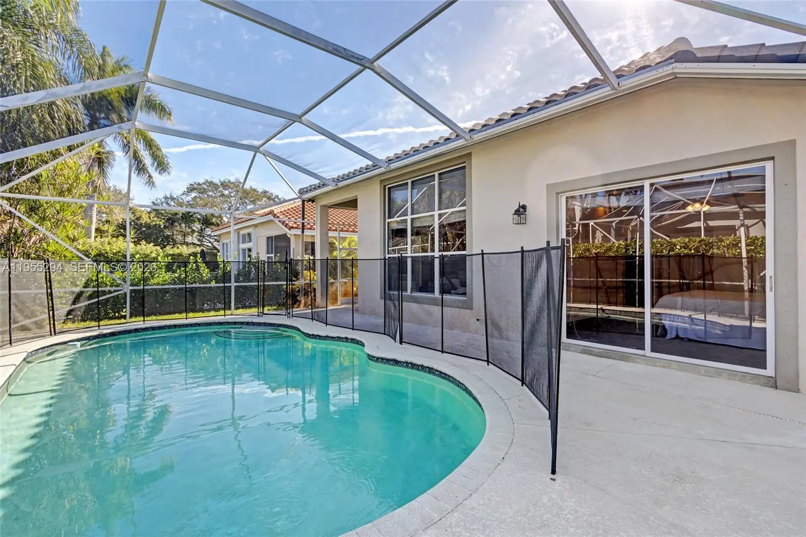 An elegant single-story Mediterranean-style pool home, tastefully remodeled and ideally situated within the prestigious gated golf community of Eagle Trace. The residence features a brand-new roof and new A/C, along with high-volume ceilings, expansive living and family rooms, and formal dining. The light-filled open kitchen offers granite countertops, stainless steel appliances, and a breakfast area. The spacious primary suite serves as a private retreat with walk-in closets, dual vanities, a spa-style soaking tub, separate shower, and private water closet. Well-proportioned guest bedrooms provide comfort and privacy for family and visitors alike. Designed for effortless indoor-outdoor living, the home opens to a screened-in patio, sparkling pool, and covered entertaining area—ideal for year-round South Florida living. Additional highlights include a dedicated laundry room and a two-car garage. Residents of Eagle Trace enjoy 24-hour gated security, golf, tennis, playgrounds, and resort-style amenities.