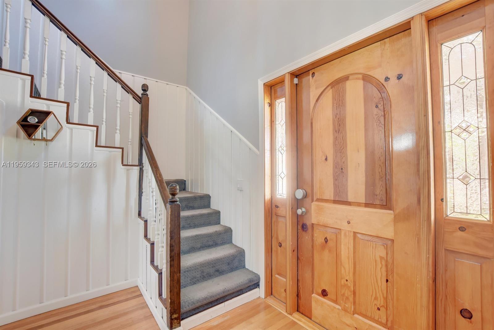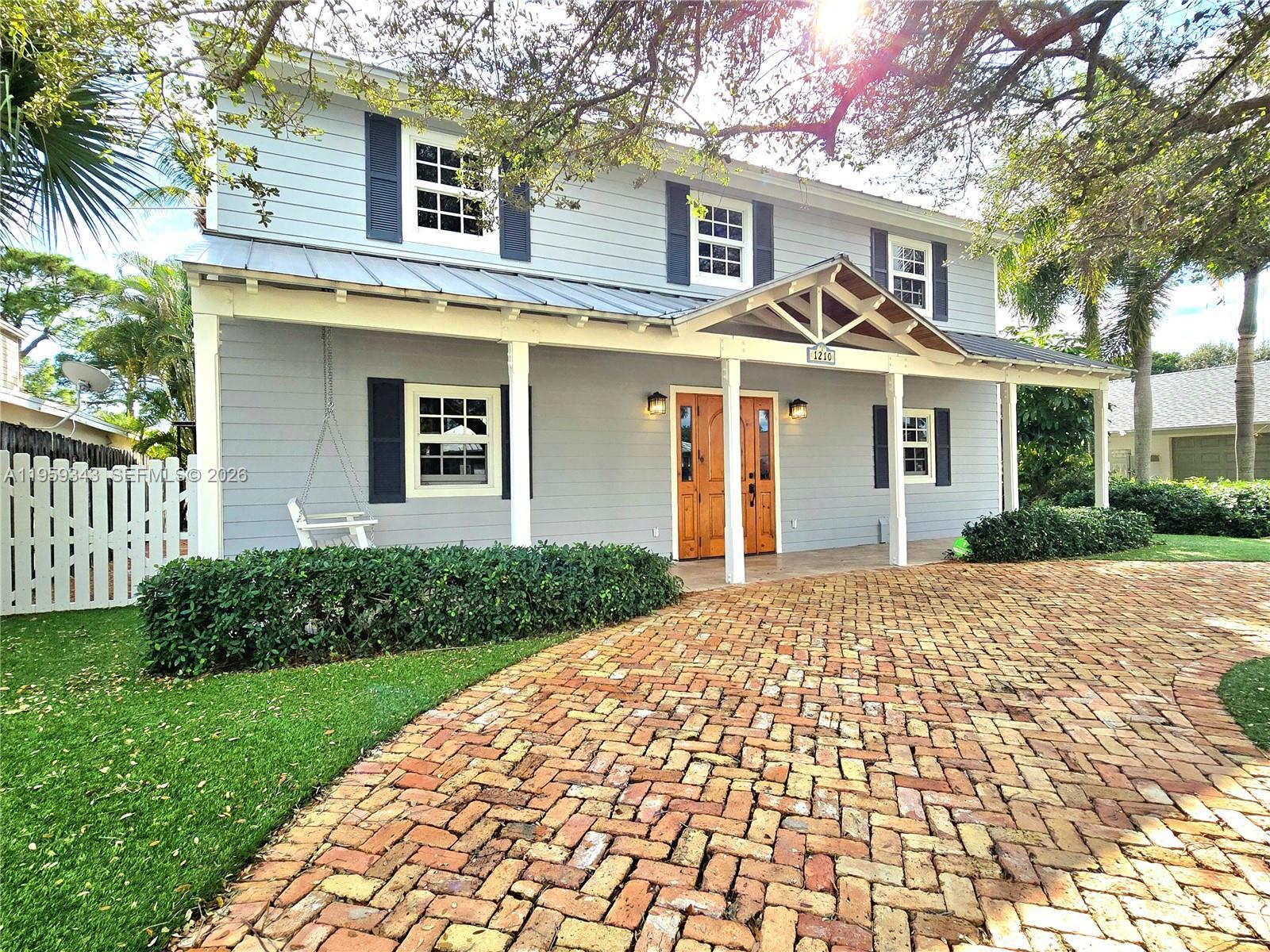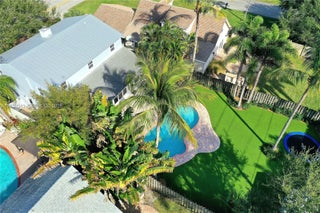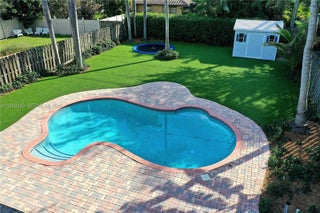 Located in the sought-after Palm Beach Farms East Boca neighborhood, this 4-bedroom + loft, 2.5 bath pool home features an inviting front porch and remarkable charm. The spectacular backyard features a beautiful just re-surfaced saltwater pool, maintenance-free high-quality artificial turf, an in-ground trampoline, shed, outdoor shower, and a brick patio. When you step inside the home you will notice a distinct warmth and coziness. The two-story foyer leads to a living room featuring a wood-burning fireplace, wainscoting, and oak wood floors. The kitchen is complete with white cabinets, granite counter tops, stainless steel appliances, and porcelain tile. The large dining area is great for entertaining and features built-in floor to ceiling cabinets. The Florida room/family room has 6 elongated windows, allowing for plenty of natural light and views of the backyard. The downstairs master bedroom features hard wood floors, a custom walk-in closet, wainscoting, and double doors leading to a covered porch. The renovated master bath features a brand-new vanity, double sinks, and a free-standing tub. An additional half bath and laundry room are downstairs with a door providing easy access to the backyard and pool. Three additional bedrooms are located upstairs, as well as a large loft/office. Home has been updated, immaculately maintained. Impact windows. Freshly painted and new carpet installed. AC unit was replaced in 2025. The home is situated on a quiet street. A-rated schools