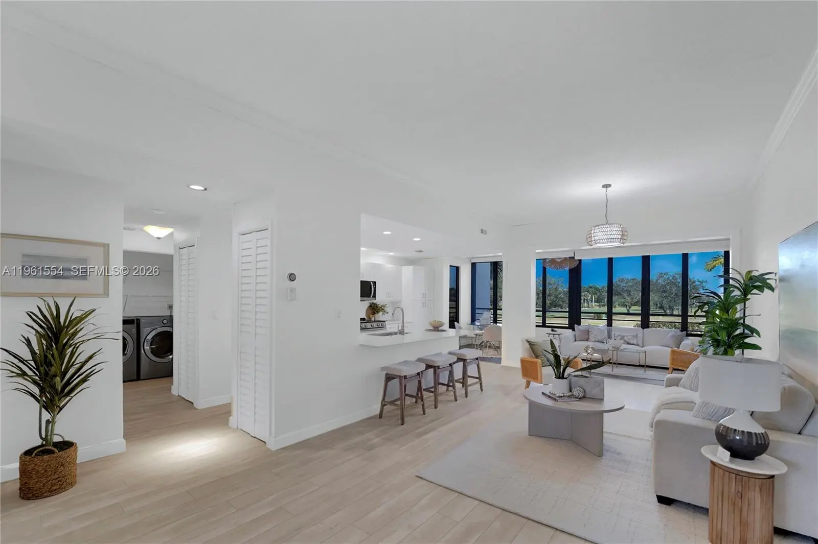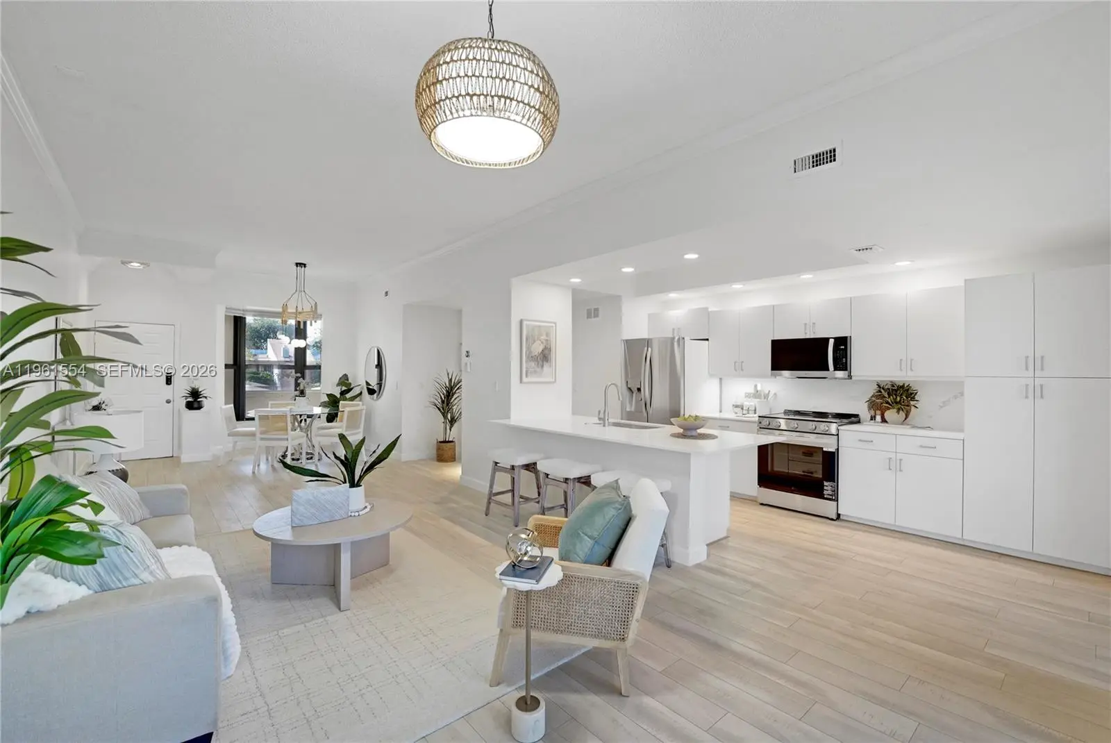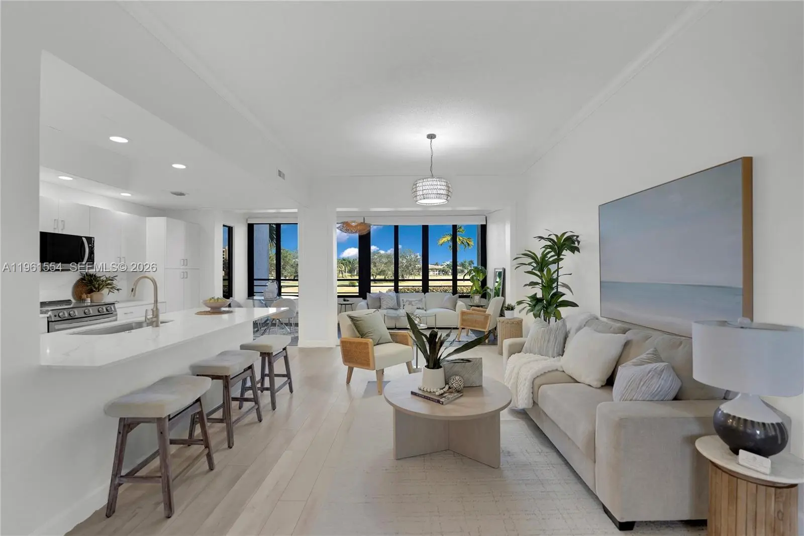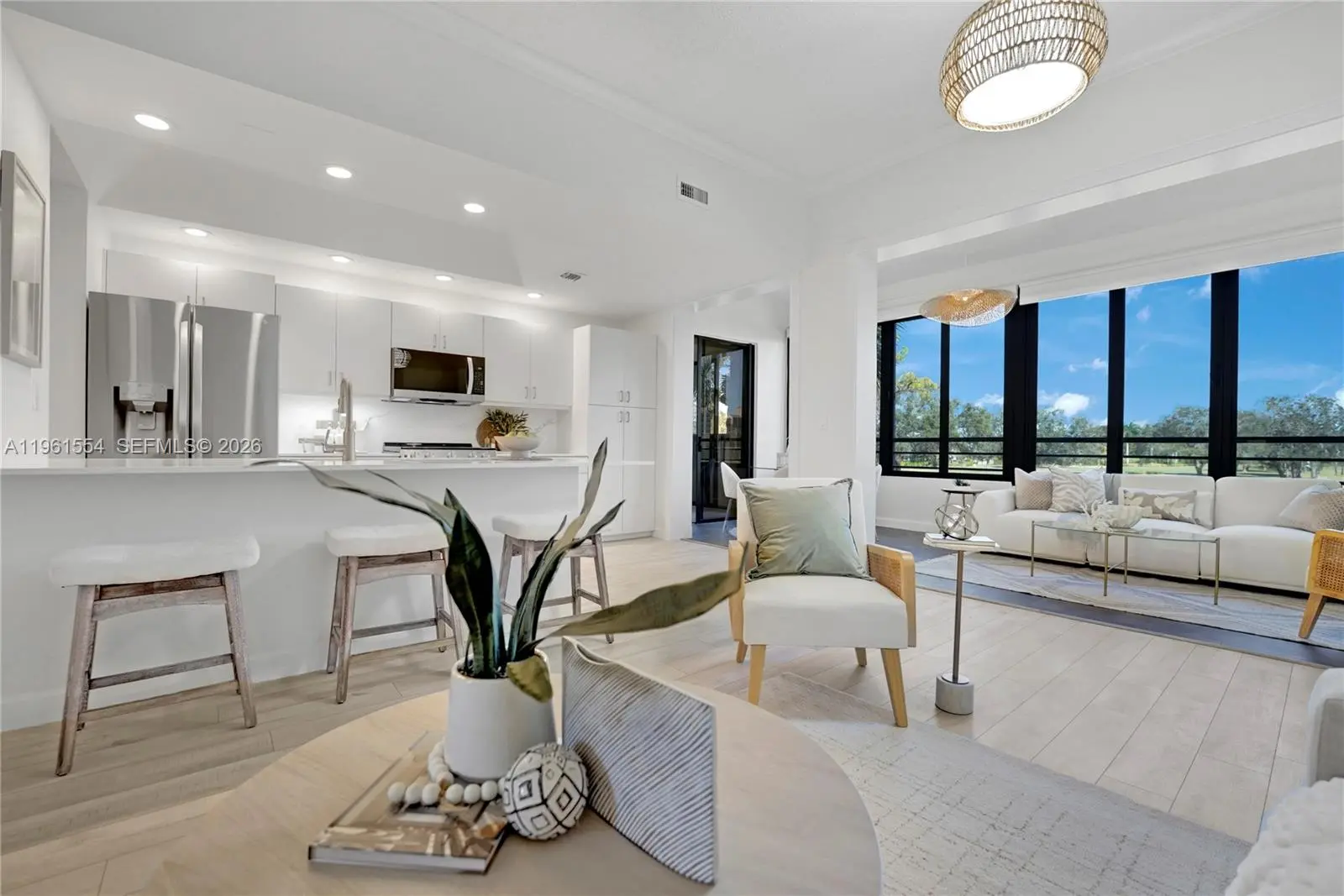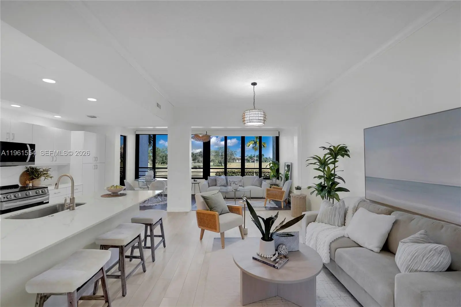 Spacious1,526 SF fully expanded and updated. 2BR/2BA condo in desirable La Paz at Boca Pointe with golf course views and ideal eastern exposure. Impact windows throughout and all plumbing replaced. Features laminate flooring, open-concept kitchen with quartz countertops, modern cabinetry, and stainless steel appliances. Primary suite offers walk-in closet with custom built-ins and renovated bath with subway tile, separate tub and shower. Second bedroom includes custom closet and access to updated guest bath with walk-in shower. Newer front-loading washer/dryer. La Paz offers two pools, two tennis courts, and a clubhouse. Per county permits, actual living area is approximately 1,526 SF. Tax records reflect 1,323