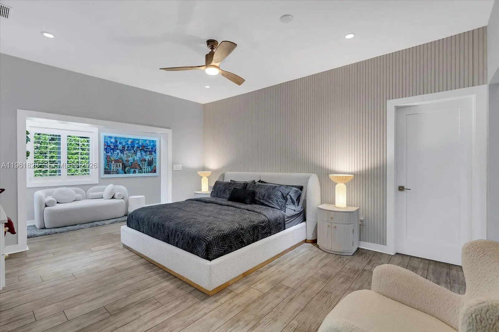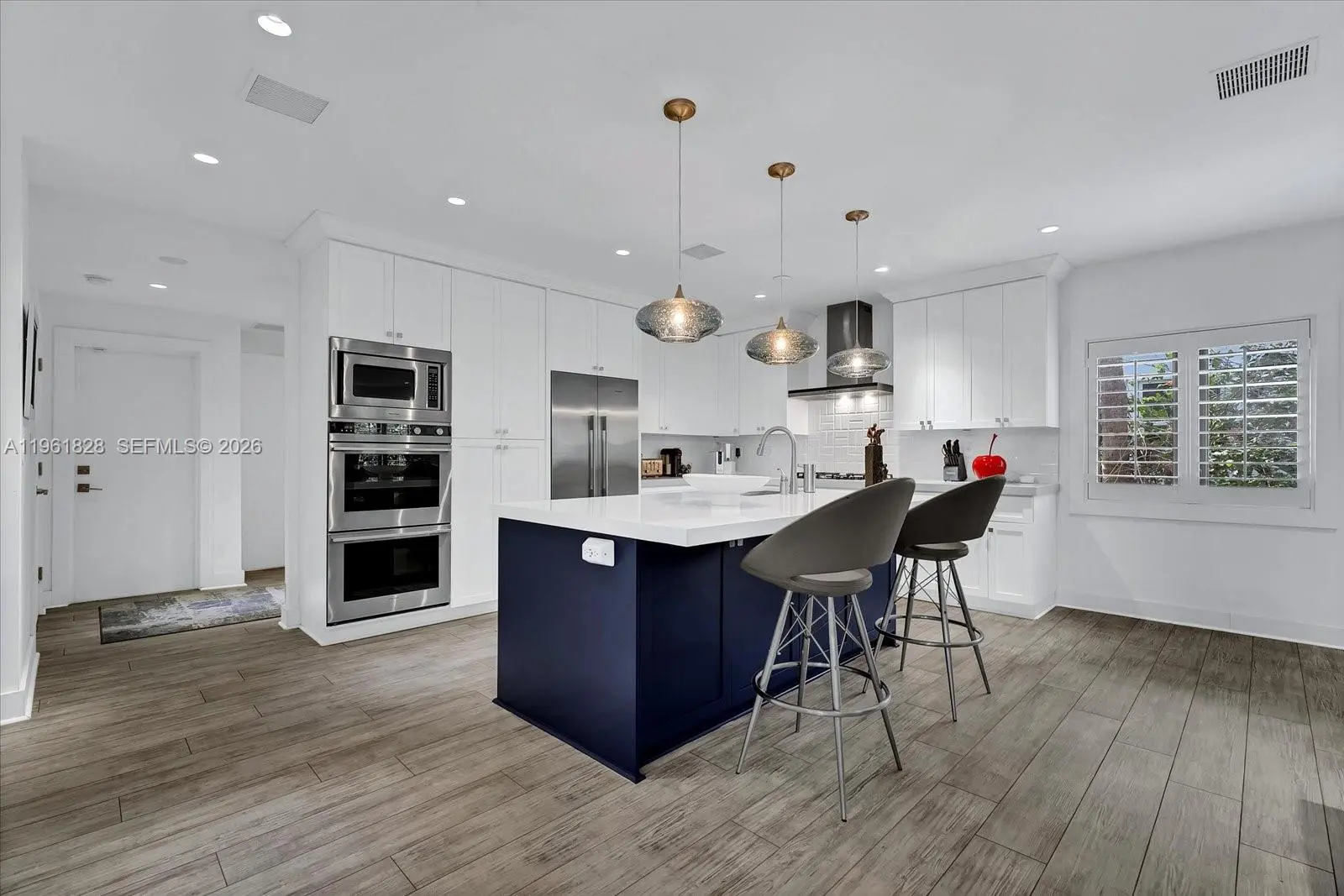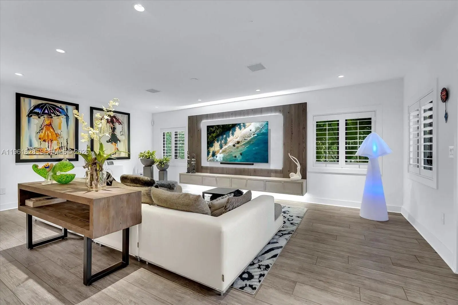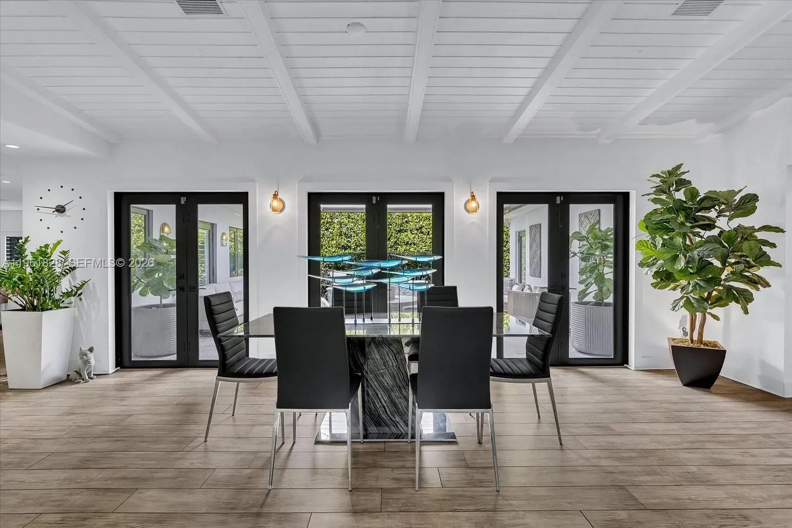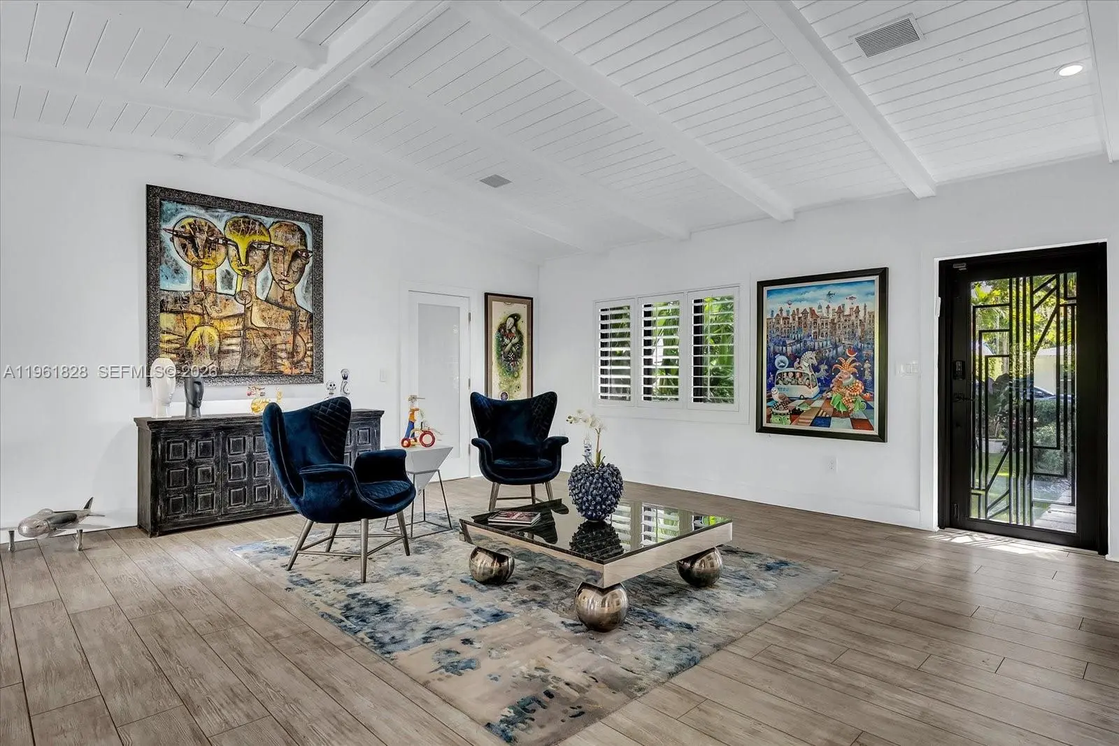 Fully furnished and nestled on a quiet Coral Gables street just minutes from downtown and Merrick Park, this refined 4-bedroom, 3-bath residence offers 2,948 living sq ft, 3,680 total sq ft, on a 9,000 SF lot. Light-filled interiors showcase engineered wood floors, wood-paneled ceilings with exposed beams, plantation shutters, and impact windows and doors, creating a warm yet sophisticated ambiance. The open-concept custom kitchen flows seamlessly into the family room with a built-in media center and features an expansive island with sink, storage, and dishwasher, complemented by Fisher & Paykel refrigerator, double wall ovens, microwave, and 5-burner gas range with hood. The primary suite is a private retreat with a sitting area and an illuminated custom walk-in closet with center island, linen storage, and makeup vanity. The spa-inspired bath offers dual vanities with LED mirror, a freestanding soaking tub, frameless glass shower, and separate washroom with smart toilet. Outdoors enjoy true Florida living, award-winning landscaping (Coral Gables 2022 Landscape Beautification Award), a custom pool with slate deck, raised mosaic waterfall wall, sculptural fountain, manicured privacy hedge, and an automatic louvered pergola shading a chic lounge area furnished with West Elm outdoor furniture. Additional features include a one-car garage, gravel driveway, whole-house generator, Nest thermostats, two A/C units, keypad entry, and timed exterior lighting.