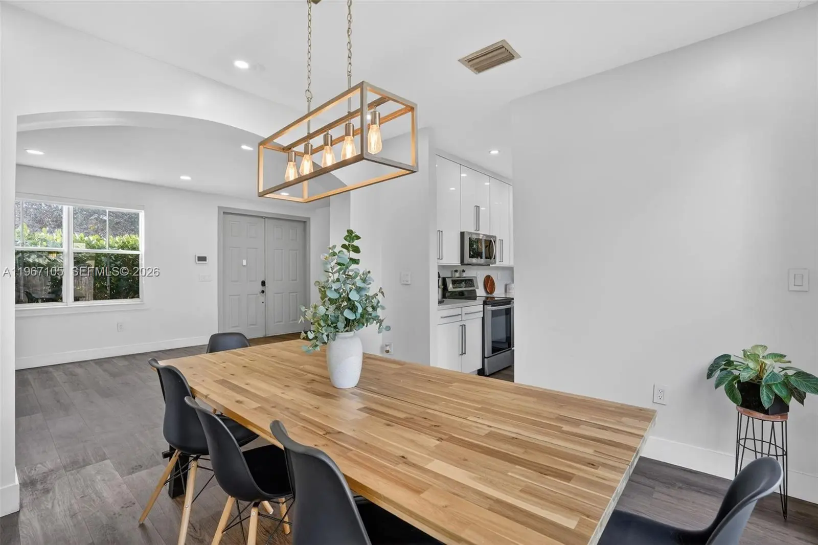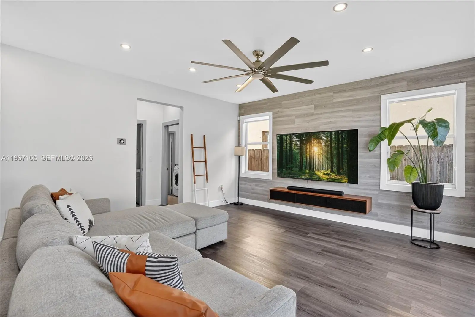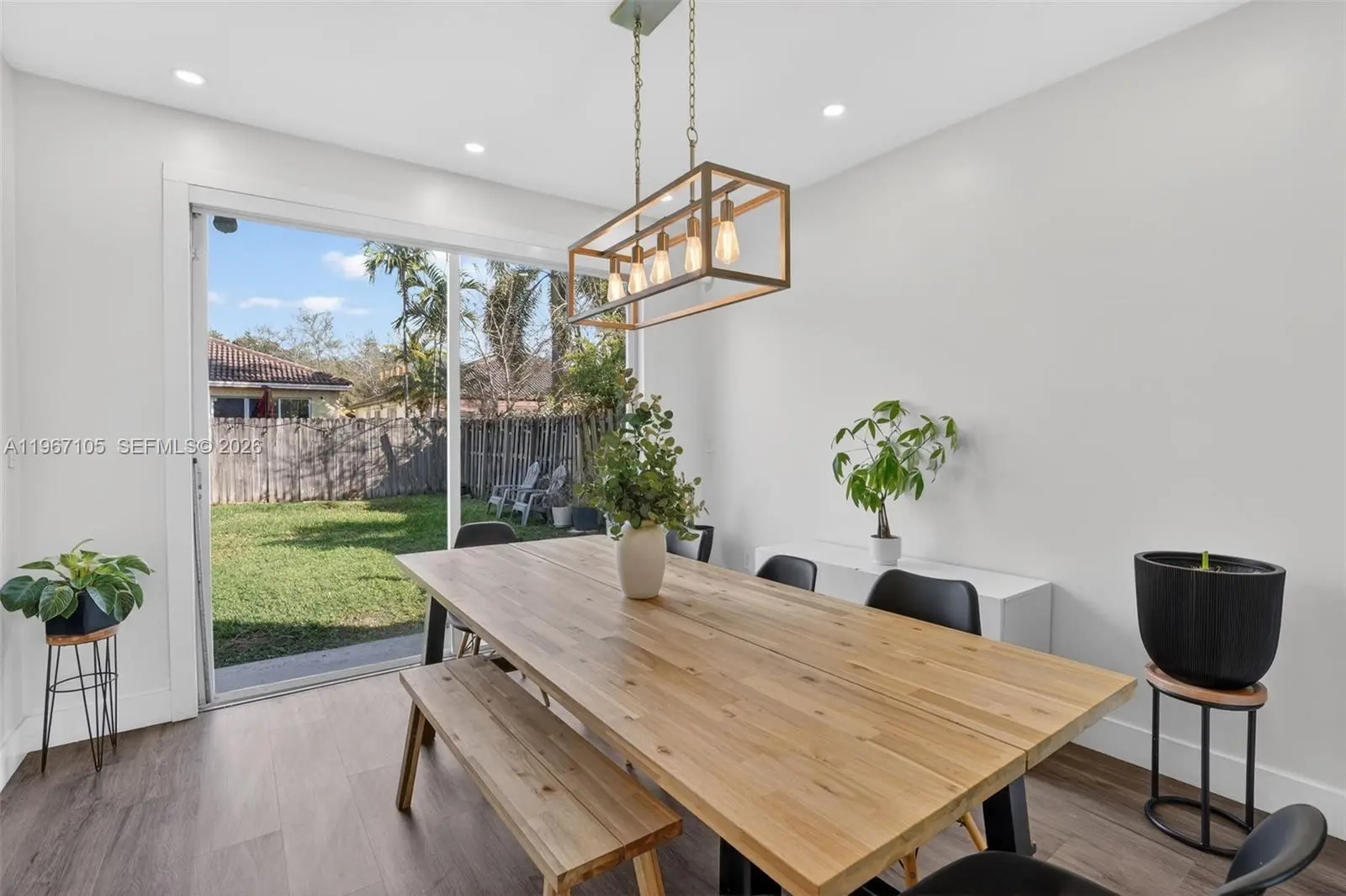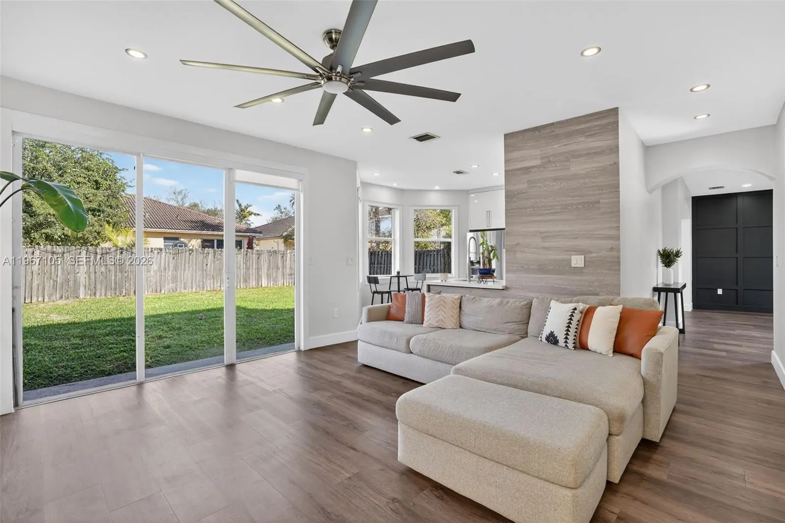 Beautifully updated 4-bedroom, 2.5-bath home offering 2,064 SqFt of bright and modern living space on a 5,500 SqFt lot, located in a well-maintained community. Step inside to a light-filled interior featuring sleek wood-style flooring throughout, recessed LED lighting, high ceilings, and an open-concept layout designed for comfortable living and entertaining. The fully renovated kitchen showcases high-gloss white cabinetry, quartz countertops, stainless steel appliances, and a spacious, functional design. Large windows and sliding glass doors bring in abundant natural light while creating a seamless connection to the backyard. Upstairs, the spacious primary suite features high ceilings, his and hers walk-in closets, and a well-appointed bathroom with a separate soaking tub and walk-in shower. Additional bedrooms offer flexibility for family, guests, or a home office. Enjoy a generously sized fenced backyard with plenty of space for outdoor gatherings, pets, or even a future pool. The home also includes a dedicated laundry room and a 2-car garage with ample space for parking and storage. For added protection and peace of mind, the property includes accordion shutters on the second-floor windows and hurricane shutters on the first floor. Conveniently located near major highways, shopping, schools, and everyday amenities. Move-in ready and thoughtfully updated — schedule your private showing today.