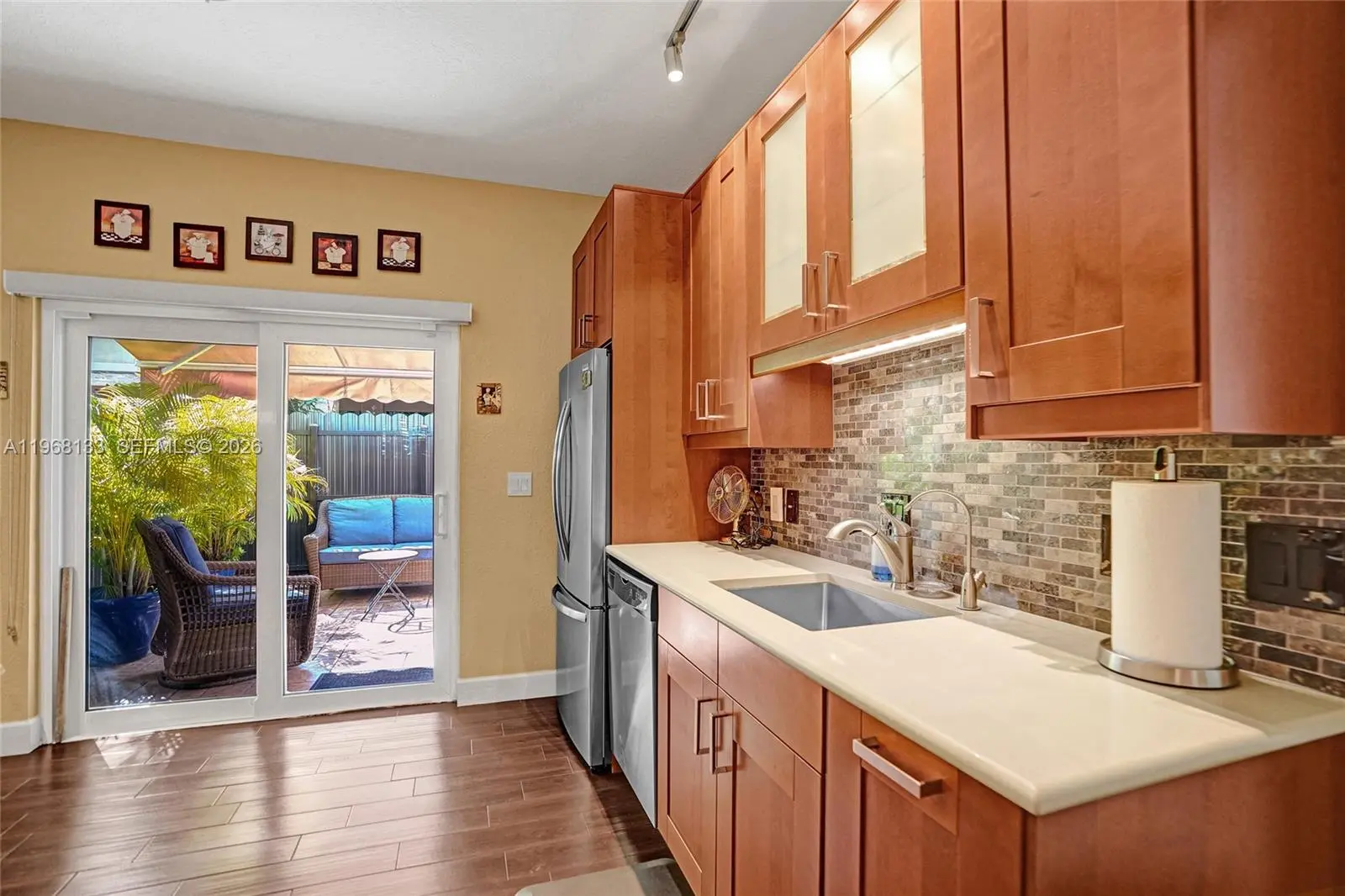 Rarely available unit in this boutique complex is a must see. This completely remodeled 2/2 unit presents like townhome living. Direct unit access, parking in front, and the best feature; a large outside patio to enjoy outdoor entertaining and grilling. The updated kitchen features an open concept with granite and countertop dining. Both the primary and secondary bedrooms feature large walk-in closets and updated baths. The unit is immaculate and being sold turn key furnished. Great for those second home buyers. Just move right in. The complex is a gated hidden gem in the central Hollywood area in one of the most convenient locations in the tri county area. Literally minutes to access I-95, 595, Turnpike, Fort Lauderdale International, and Tri-Rail. For shopping you have Dania Point, Oakwood Plaza, Target, Publix and Walmart all within a two mile radius. Straight shot east on Hollywood Blvd to Downtown Circle and the famed Hollywood Beach Boardwalk. Artwork excluded from sale.