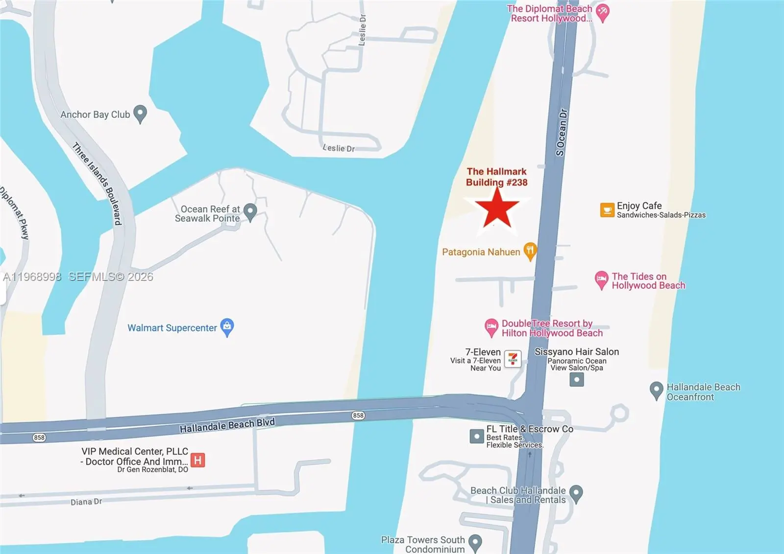 **NEW LOWER PRICE** The office is divided into three private offices, one conference room, and a reception area. A great opportunity for professionals or investors looking for commercial space on the east side of the city. Offered at only $420 per square foot. The total space is 891 SF, located in the prestigious Hallmark building on Ocean Drive, on the bay, just blocks from the Hallandale Beach Blvd. bridge. The building has been fully renovated, offering a modern and professional environment. Includes 2 private parking spaces plus several visitor spaces and valet service. Located across from the beach, very close to hotels, luxury condos, and restaurants. The elegant offices are perfect for welcoming patients or clients with style and professionalism.