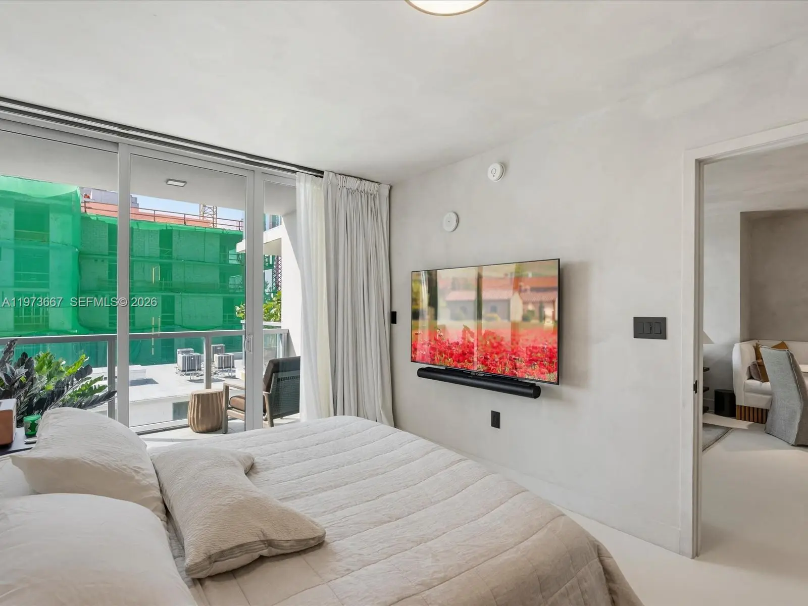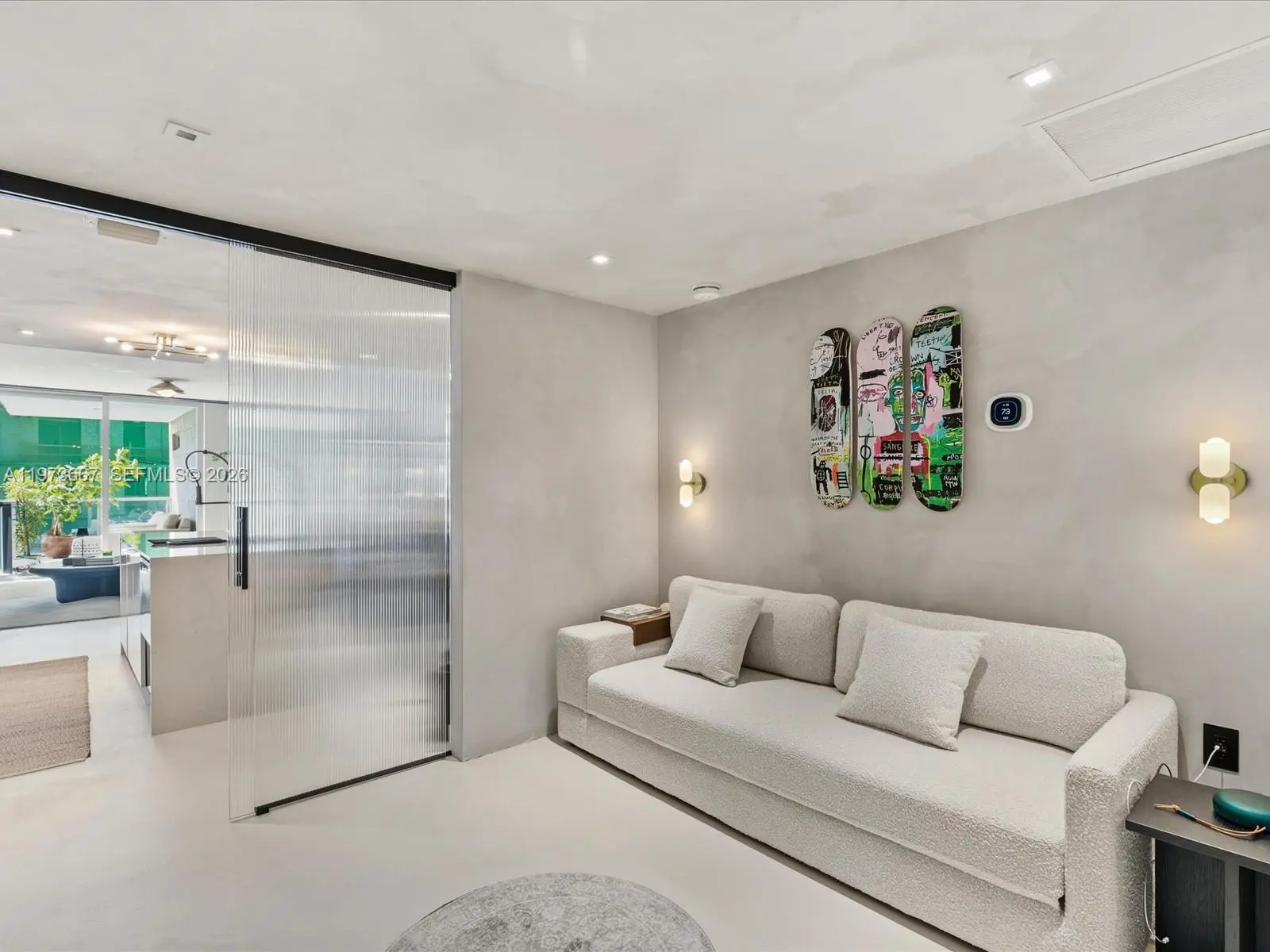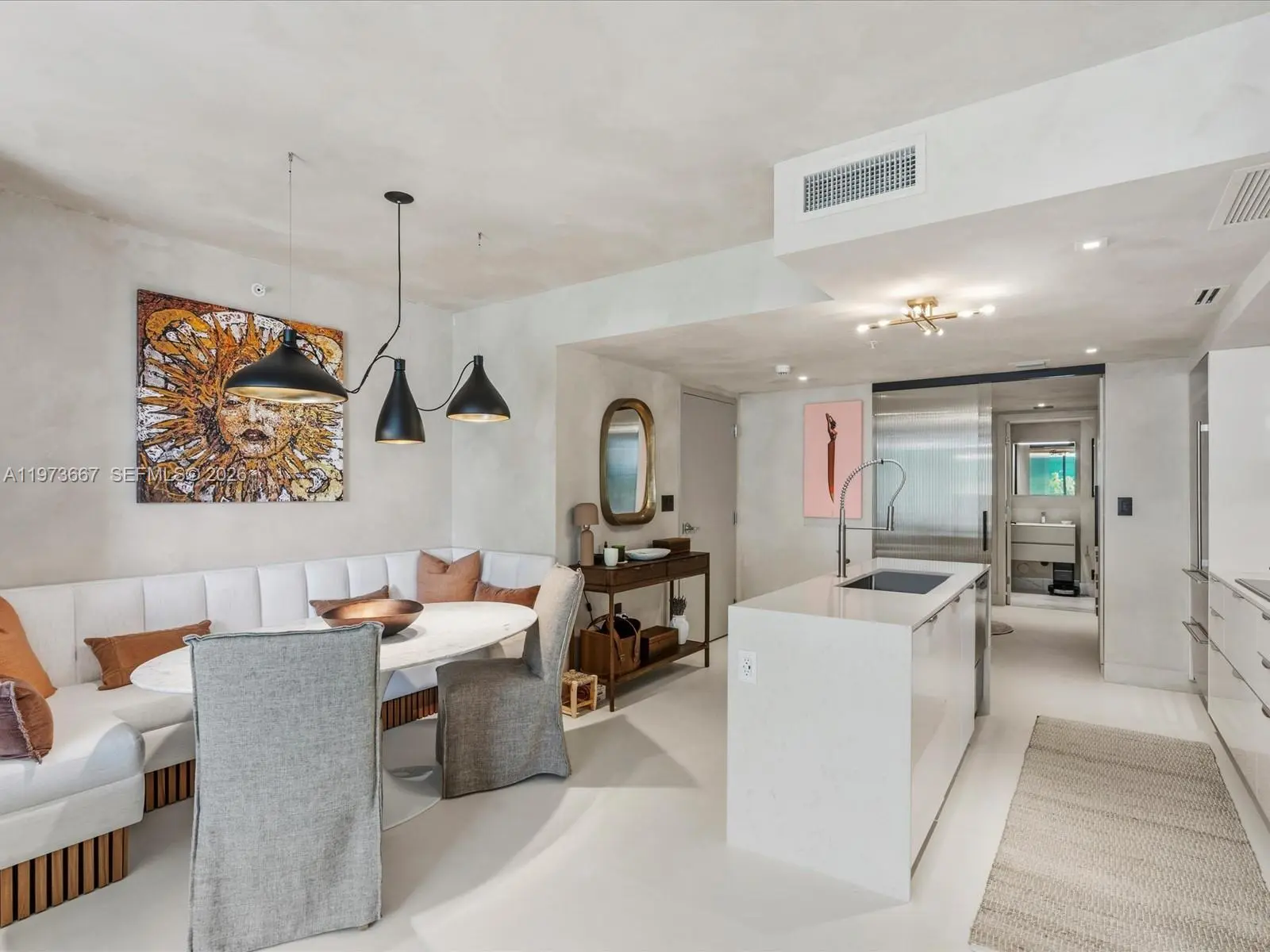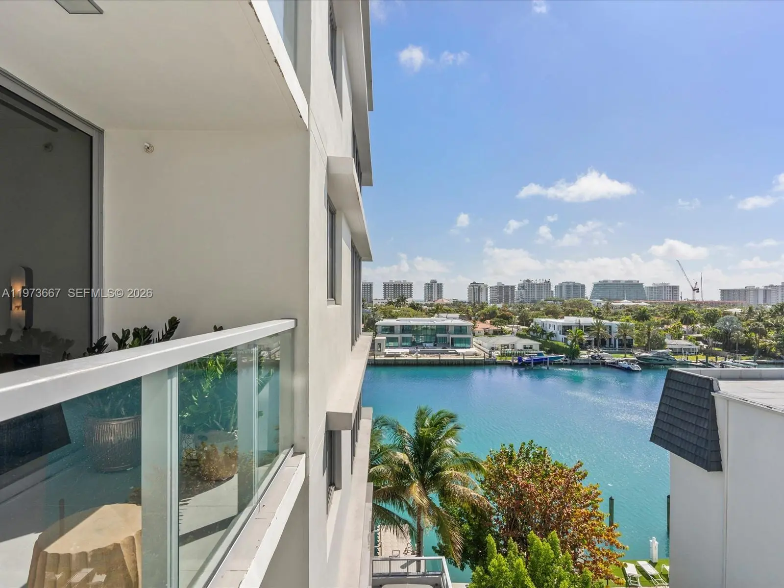 Bijou residence 705 offers a rare opportunity to own a fully customized residence in one of Bay Harbor Islands’ most exclusive boutique waterfront buildings. This modern 1-bedroom plus enclosed den, 2-bathroom home lives like a true 2-bedroom and offers 1,031 interior square feet plus 166 square feet across two private balconies. The spacious primary suite features custom closets and its own private balcony. The enclosed den with custom doors serves as a guest room, office or second bedroom. Designer upgrades elevate every space including polished concrete flooring, custom limewash walls and built-in cabinetry and storage. A custom dining banquette adds style and functionality. Additional highlights include custom shades throughout, a walk-in laundry room and a built-in safe. The Italian-designed MiaCucina kitchen features marble countertops and backsplash paired with premium Wolf and Sub-Zero appliances. Two valet parking spaces are included. Completed in 2021, Bijou is a boutique 9-story waterfront building along Biscayne Bay with 150 feet of Bay Harbor Islands frontage and dock access. Residents enjoy a rooftop lounge with sweeping bay views, fitness center, residents lounge and 24-hour security. The resort-style pool deck features a 36-foot infinity-edge pool overlooking the bay, whirlpool, cabanas, chaises, fire pit lounge and outdoor bar and dining area. Located two blocks from Bal Harbour Shops and moments from beaches, fine dining and luxury shopping.
