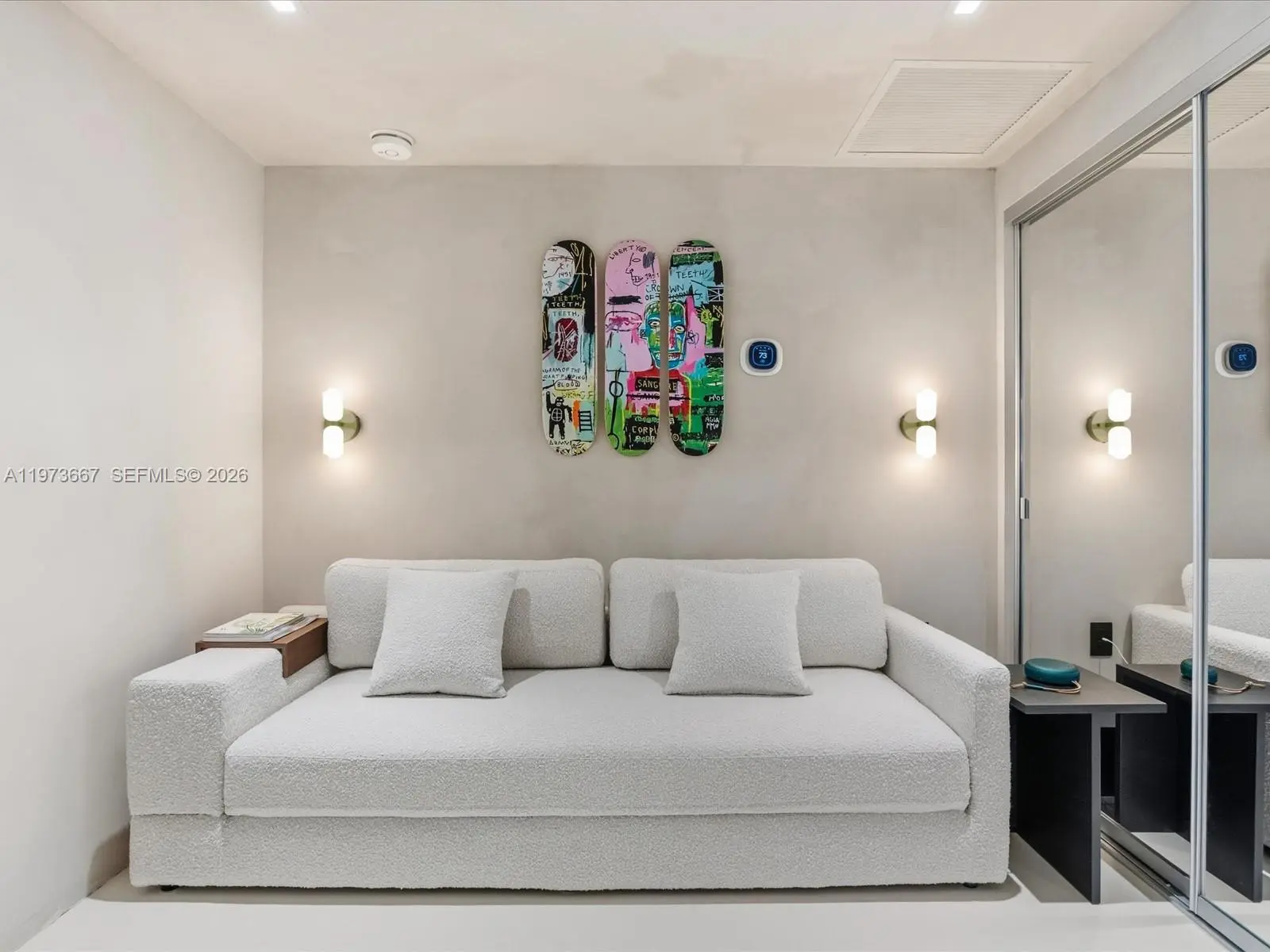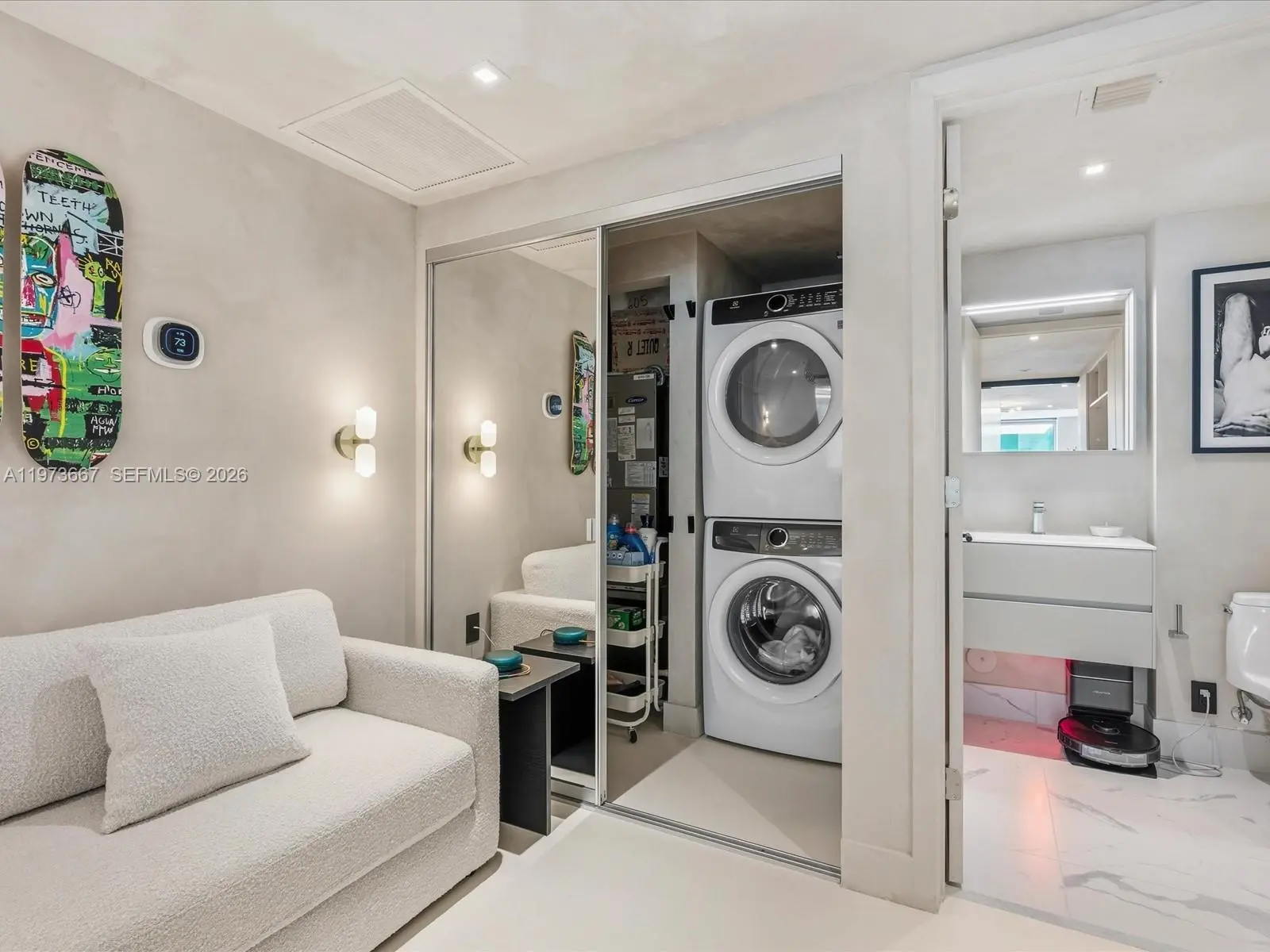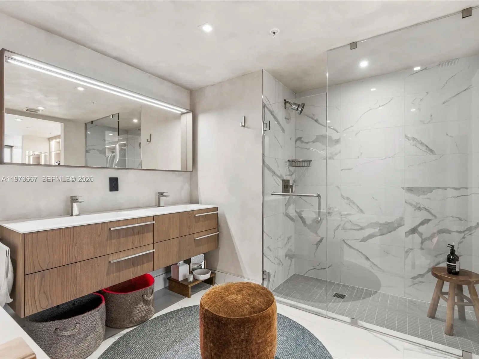 Bijou residence 705 offers a rare opportunity to own a fully customized residence in one of Bay Harbor Islands’ most exclusive boutique waterfront buildings. This modern 1-bedroom plus enclosed den, 2-bathroom home lives like a true 2-bedroom and offers 1,031 interior square feet plus 166 square feet across two private balconies. The spacious primary suite features custom closets and its own private balcony. The enclosed den with custom doors serves as a guest room, office or second bedroom. Designer upgrades elevate every space including polished concrete flooring, custom limewash walls and built-in cabinetry and storage. A custom dining banquette adds style and functionality. Additional highlights include custom shades throughout, a walk-in laundry room and a built-in safe. The Italian-designed MiaCucina kitchen features marble countertops and backsplash paired with premium Wolf and Sub-Zero appliances. Two valet parking spaces are included. Completed in 2021, Bijou is a boutique 9-story waterfront building along Biscayne Bay with 150 feet of Bay Harbor Islands frontage and dock access. Residents enjoy a rooftop lounge with sweeping bay views, fitness center, residents lounge and 24-hour security. The resort-style pool deck features a 36-foot infinity-edge pool overlooking the bay, whirlpool, cabanas, chaises, fire pit lounge and outdoor bar and dining area. Located two blocks from Bal Harbour Shops and moments from beaches, fine dining and luxury shopping.
