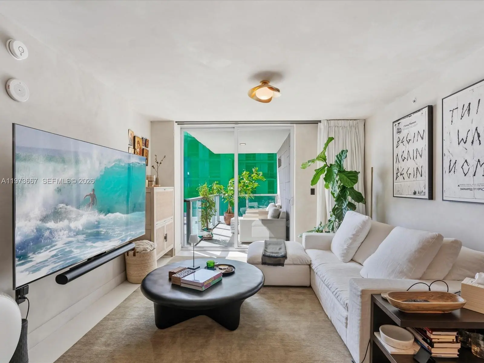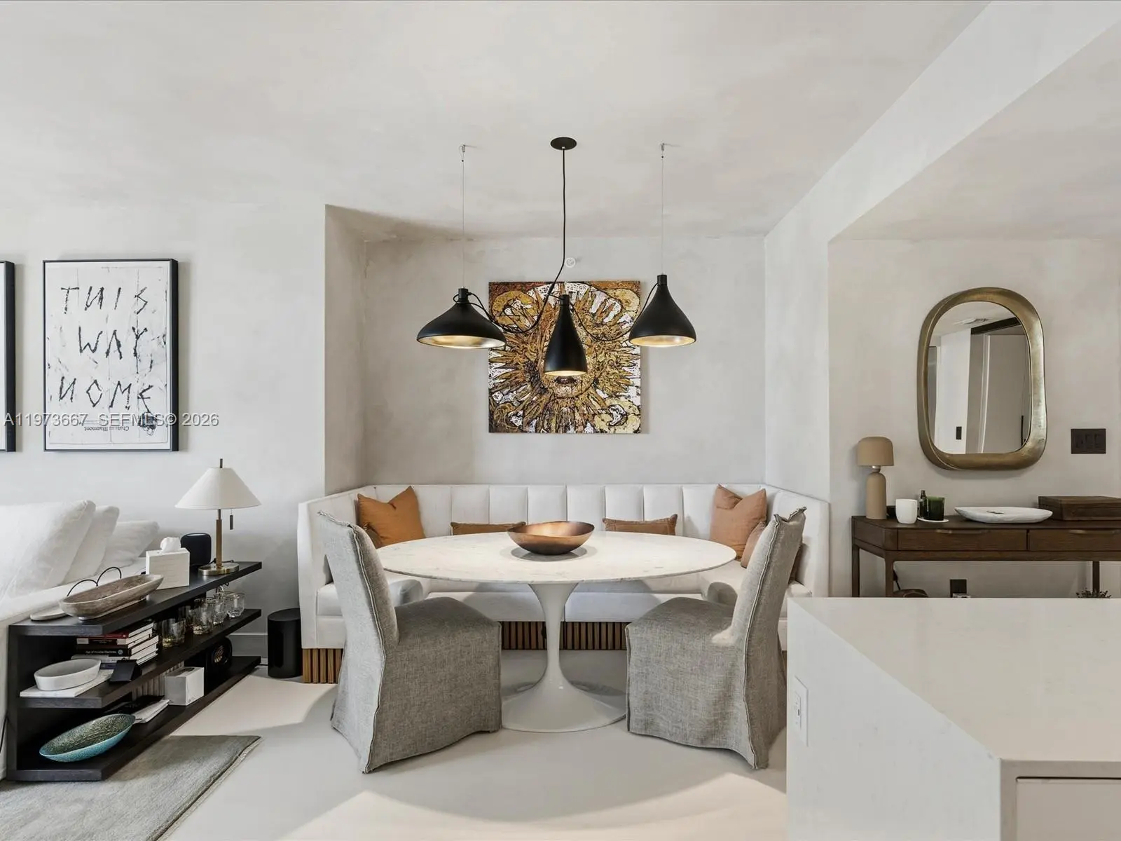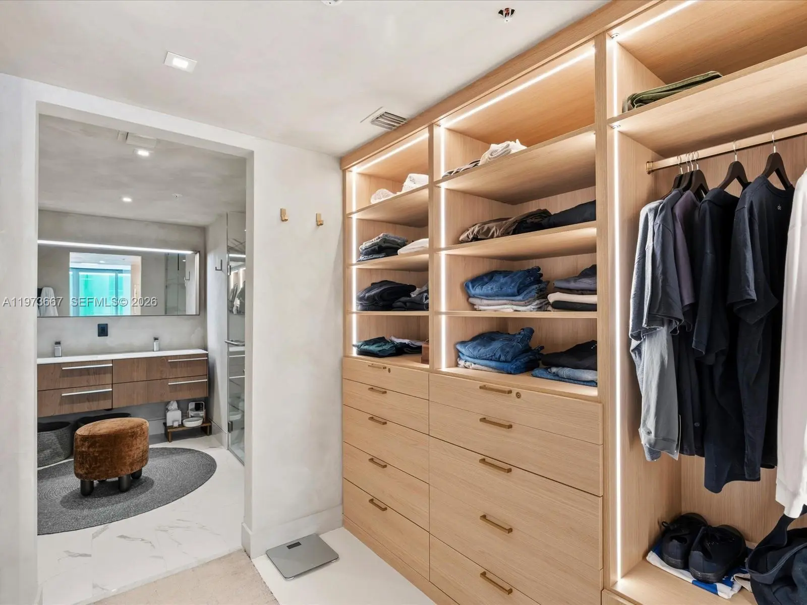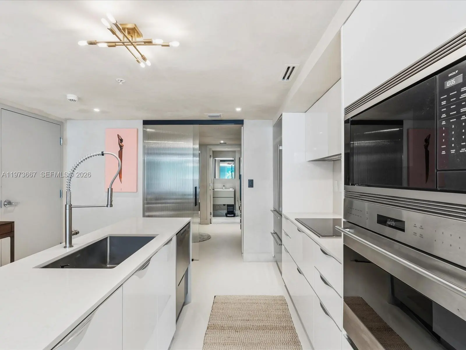 Bijou residence 705 offers a rare opportunity to own a fully customized residence in one of Bay Harbor Islands’ most exclusive boutique waterfront buildings. This modern 1-bedroom plus enclosed den, 2-bathroom home lives like a true 2-bedroom and offers 1,031 interior square feet plus 166 square feet across two private balconies. The spacious primary suite features custom closets and its own private balcony. The enclosed den with custom doors serves as a guest room, office or second bedroom. Designer upgrades elevate every space including polished concrete flooring, custom limewash walls and built-in cabinetry and storage. A custom dining banquette adds style and functionality. Additional highlights include custom shades throughout, a walk-in laundry room and a built-in safe. The Italian-designed MiaCucina kitchen features marble countertops and backsplash paired with premium Wolf and Sub-Zero appliances. Two valet parking spaces are included. Completed in 2021, Bijou is a boutique 9-story waterfront building along Biscayne Bay with 150 feet of Bay Harbor Islands frontage and dock access. Residents enjoy a rooftop lounge with sweeping bay views, fitness center, residents lounge and 24-hour security. The resort-style pool deck features a 36-foot infinity-edge pool overlooking the bay, whirlpool, cabanas, chaises, fire pit lounge and outdoor bar and dining area. Located two blocks from Bal Harbour Shops and moments from beaches, fine dining and luxury shopping.