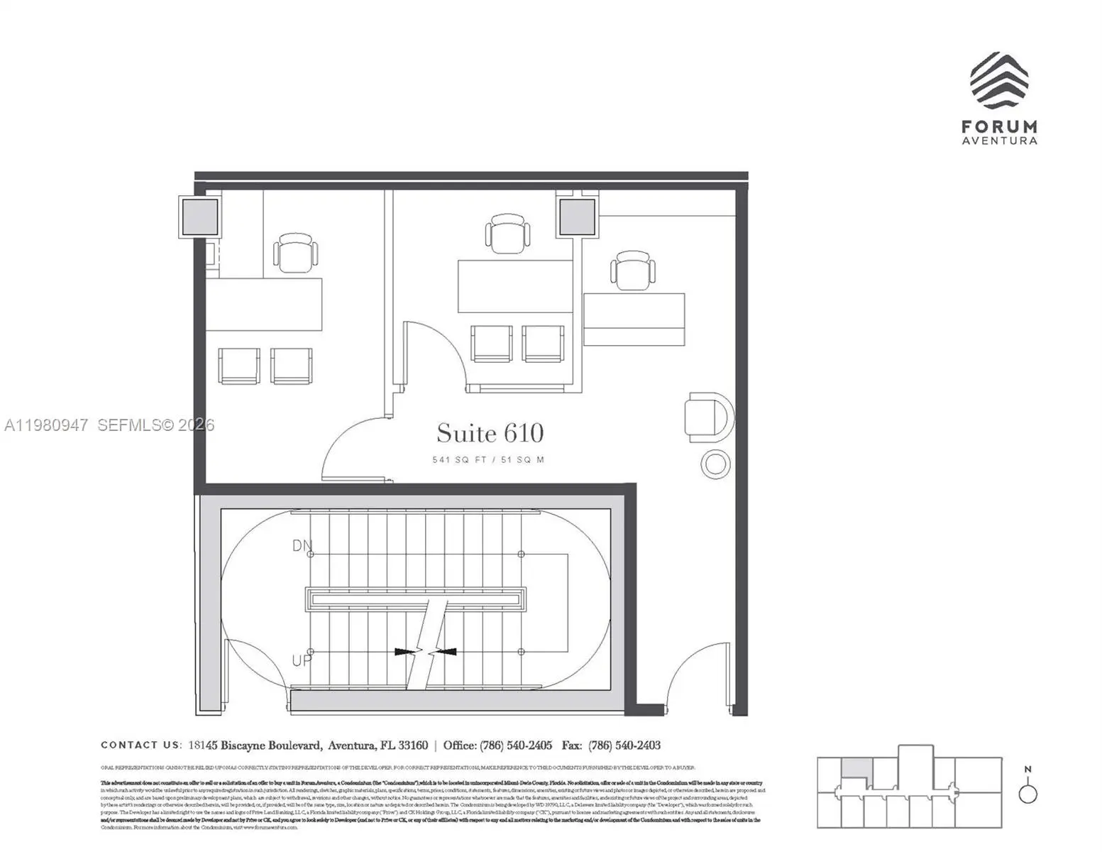 541 SF professional office located in Forum Aventura, ideally positioned next to the Aventura Brightline Station with excellent accessibility to I-95, Biscayne Blvd, and Aventura Mall. The suite features two private offices and a small reception area, making it ideal for professional services such as legal, accounting, consulting, or medical-related users. The building offers a professional environment with easy and fast tenant approval. Tenants also enjoy access to a beautiful rooftop terrace common area, featuring a garden and pool table, providing a relaxing space to work or meet informally. Option to expand: Tenant may also lease Unit 611 next door, allowing the spaces to be combined for additional square footage.