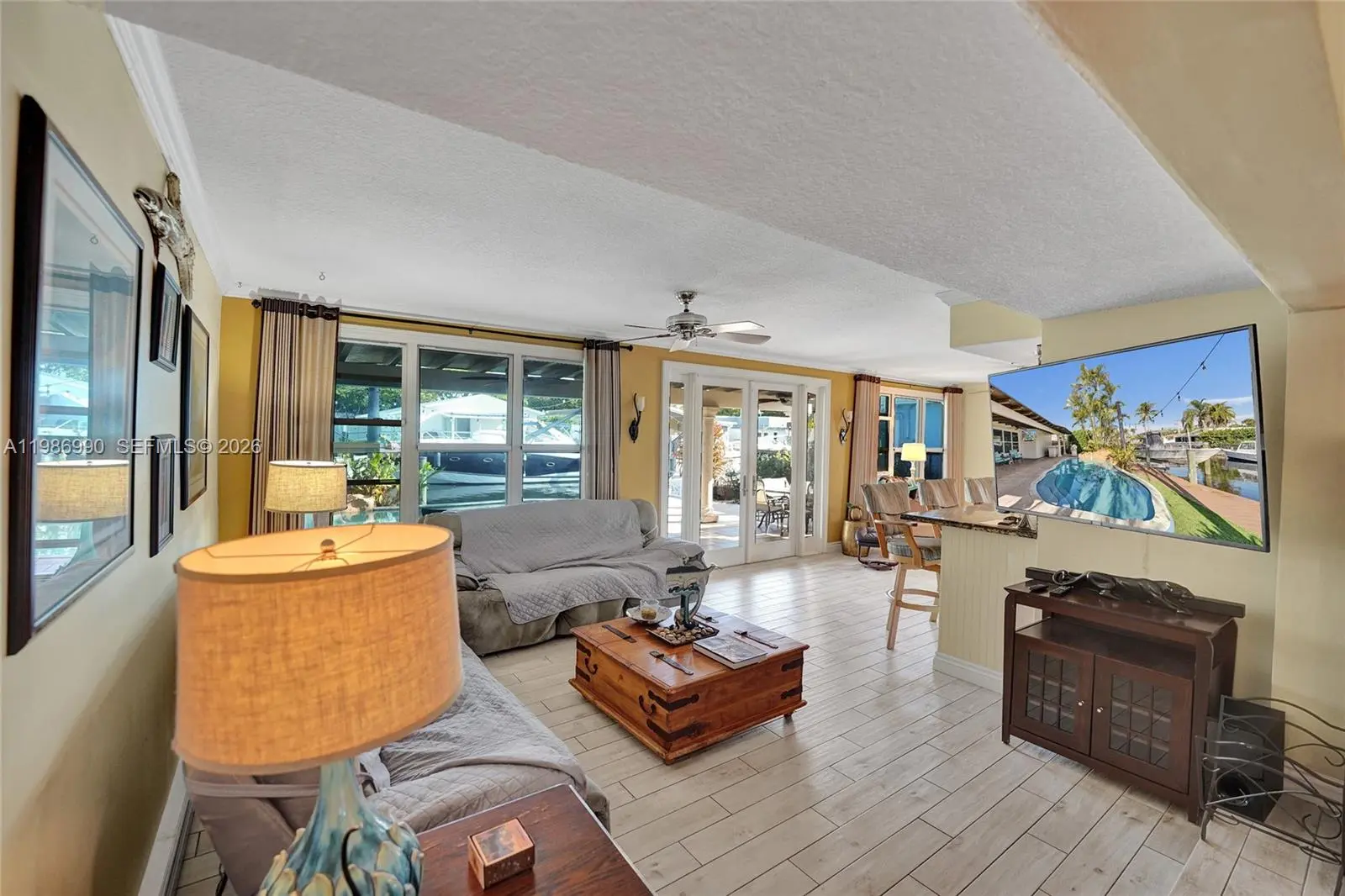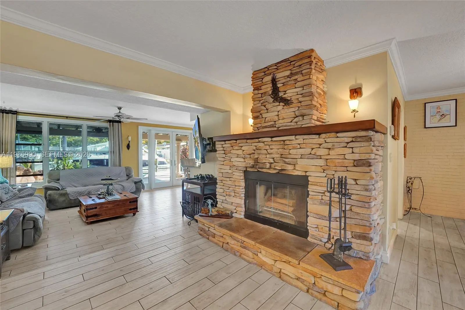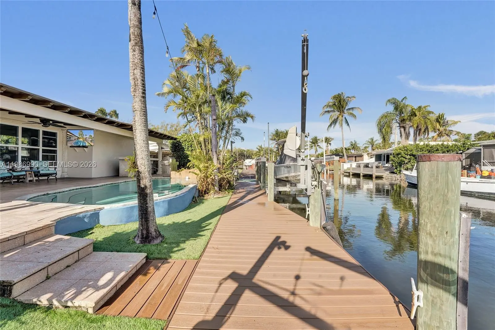 Hidden Gem area!!! Amazing and huge now 2 bed 2 bath Pool home with a garage could easy be converted to a 3 bed house. Home offers a very big living and entertainment area. Going outside through the French doors the almost 700sqft porch is great when it rains in summer to enjoy the outside without getting wet. House has a real working wood fireplace for the cold Florida days. Open kitchen with lots of wood cabinets and granite counter tops. Master bathroom is very spacious with a huge shower and tub. Walk in closet and more closets. The beautiful pool has a nice waterfall feature. New updated guest bathroom with a beautiful shower. Dock 2025, Boatlift 2020, 13 ton B-lift. Freshly painted outside and inside in 2026, Ac compressor is from 2025, tankless water heater, Seawall rebuilt recently. House has impact windows and doors . Only one fixed bridge and you are at the ocean in a very short time. Community offers a boat ramp and Tennis and Playground. Perfect as a vacation home or family home. Close to highways and perfect in the middle between Fort Lauderdale and Miami. Close to airport so could be a great rental income.