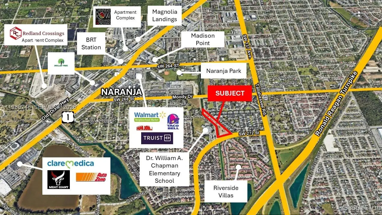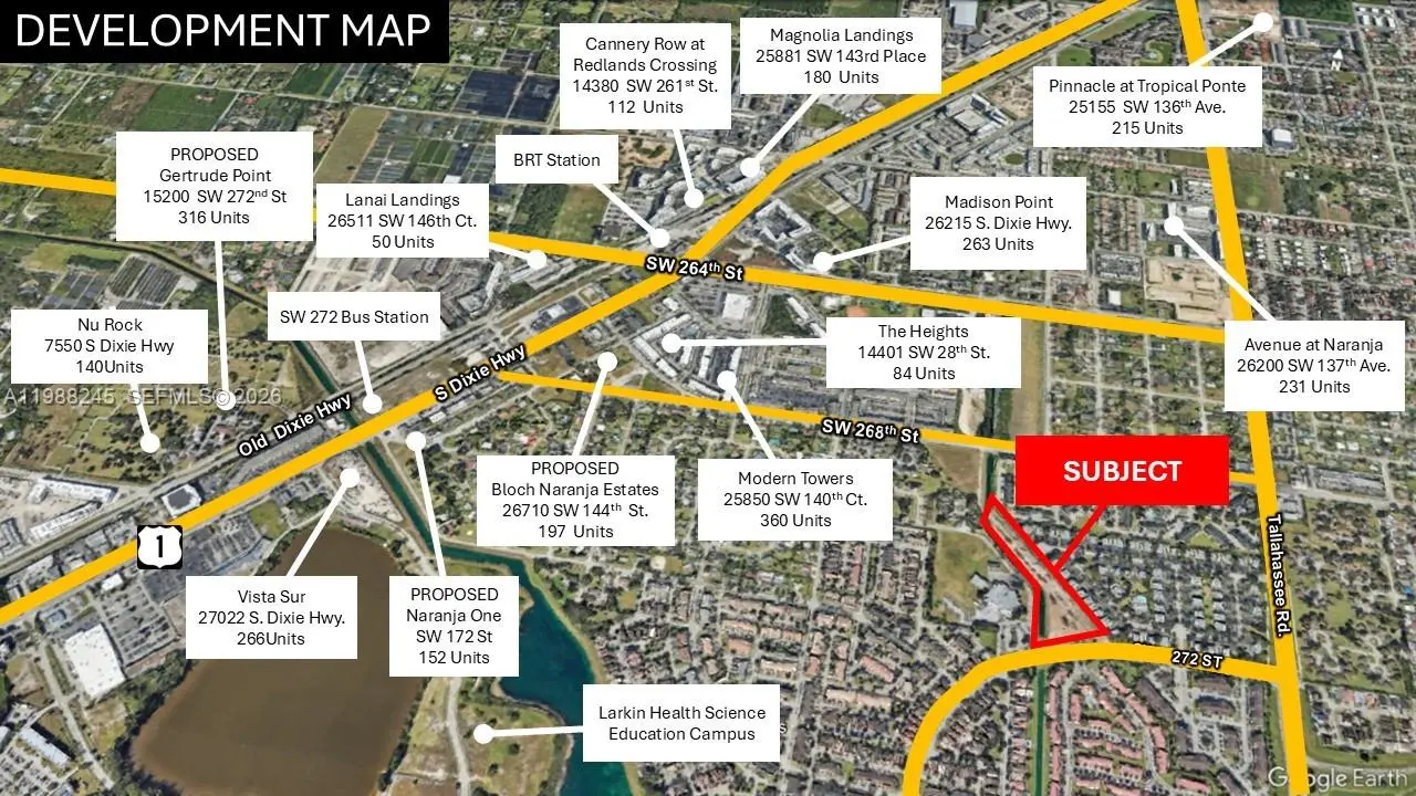 This development site represents one of the lowest price-per-acre opportunities in the Naranja/South Miami-Dade market, offered at $976,335 per acre-delivering exceptional value for investors and developers alike. The property is zoned R-Edge within the Naranja Community Urban Center District, allowing multifamily developments. The site is comprised of 3 folios totaling 3.38 acres, with an allowable FAR of 3.7. The seller is currently in the process of obtaining ASPR approvals for a 66-unit garden-style multifamily project. Additionally under the Live Local Act, the site may qualify for a density increase of up to 90 units, subject to verification of eligibility and compliance with program requirements. Located directly across from a school and with convenient access to US1, public transit, the Florida Turnpike and major commercial corridors. The site is also located next to a canal which adds a nice buffer and flexibility for site design.