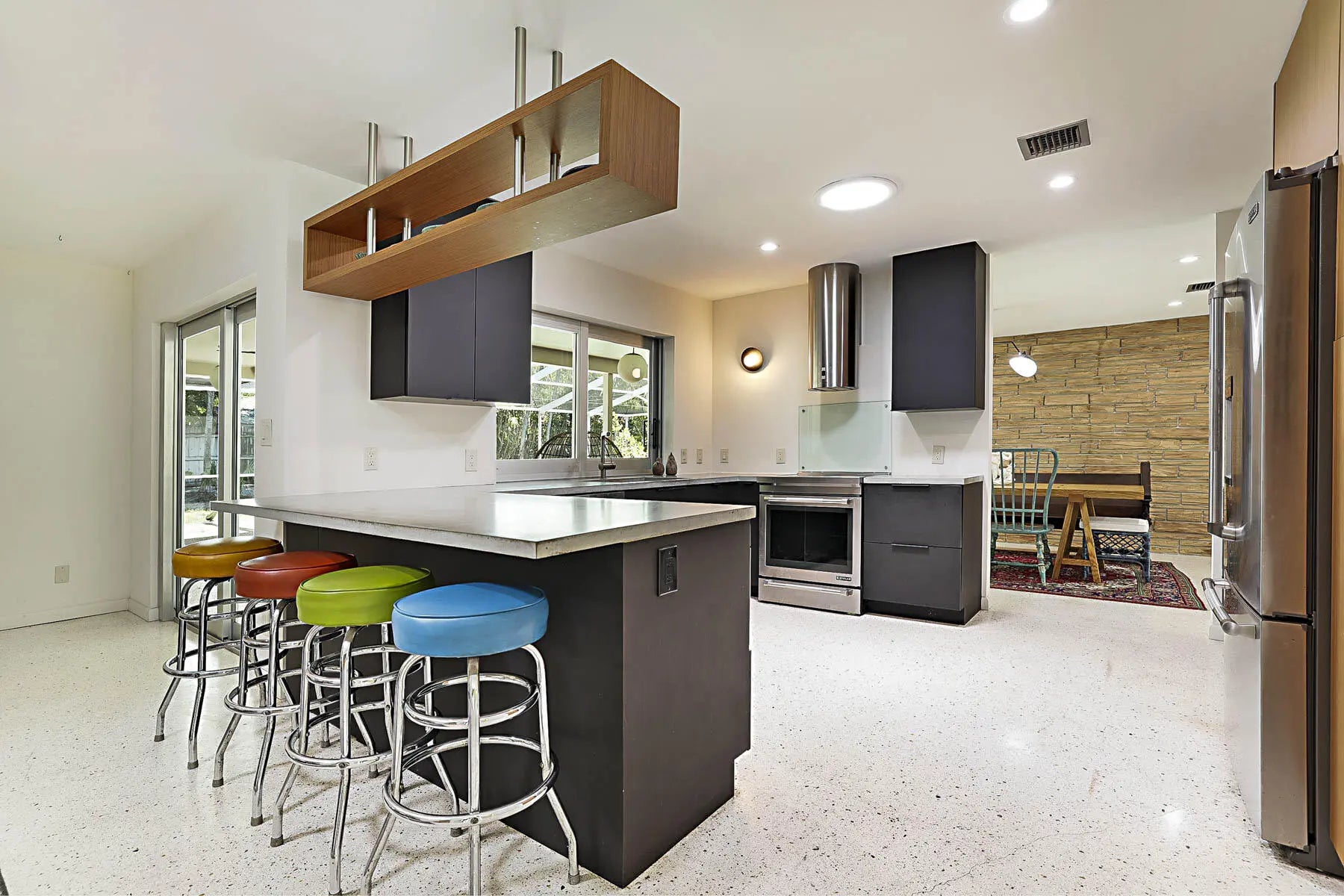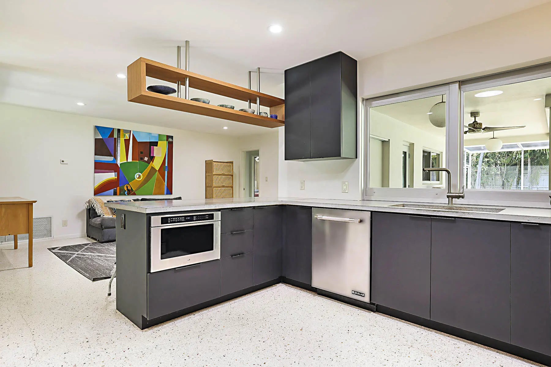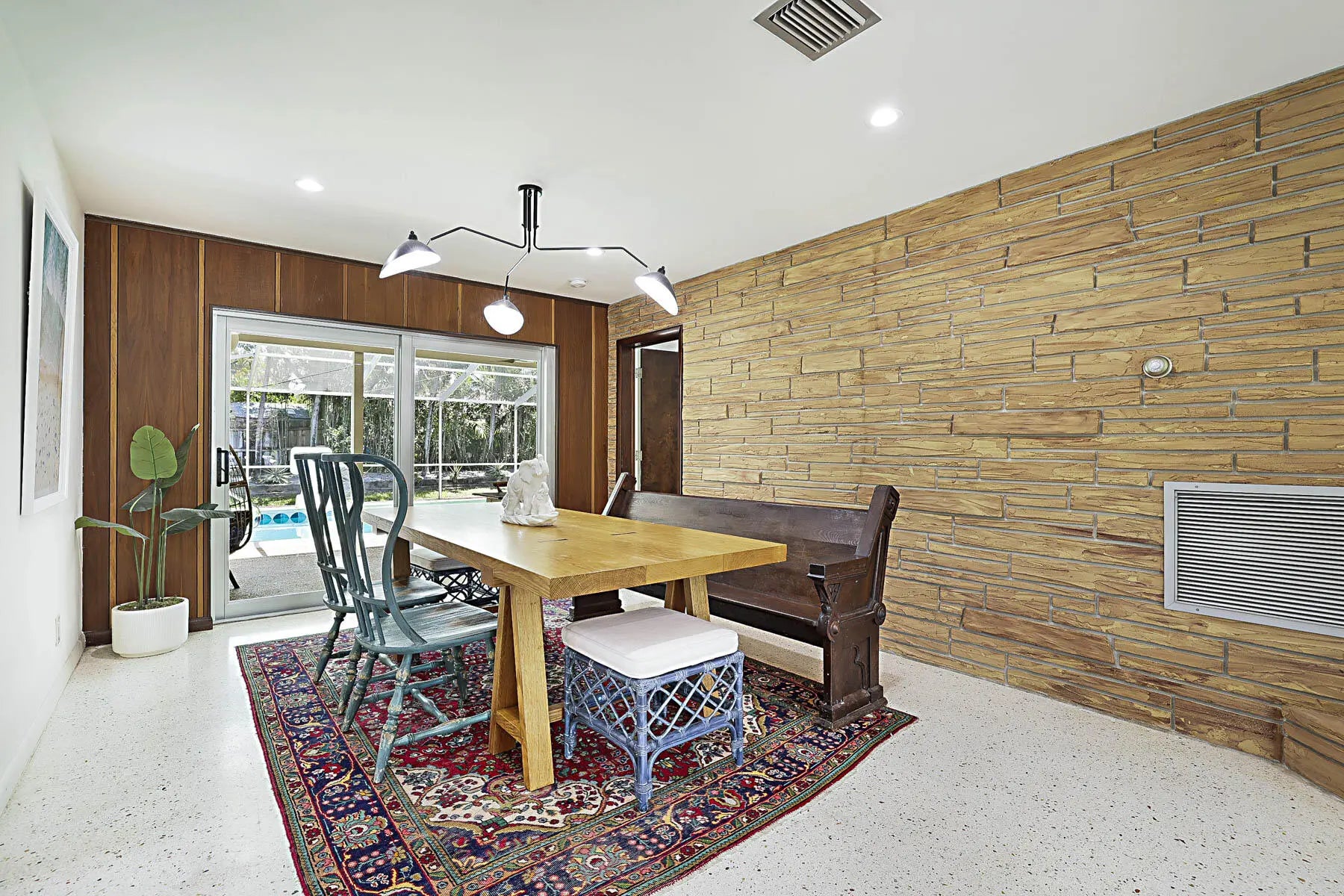 Experience East Boca living at its finest in this beautifully renovated 4-bedroom, 3-bathroom Mid-Century Modern home with a sparkling private pool. Showcasing stunning Terrazzo flooring throughout, this residence seamlessly blends classic architectural charm with thoughtful modern updates. A converted garage serves as a highly versatile 5th room—complete with a built-in Murphy bed and a dedicated mini-split AC—making it the perfect home office or guest suite. Step outside to enjoy year-round relaxing and entertaining in the covered pool area. Perfectly situated in a tranquil, highly sought-after neighborhood, you are just minutes away from Mizner Park, South Pavilion Beach, the Brightline Station, FAU, the Boca Raton Library, and Baptist Memorial Hospital.