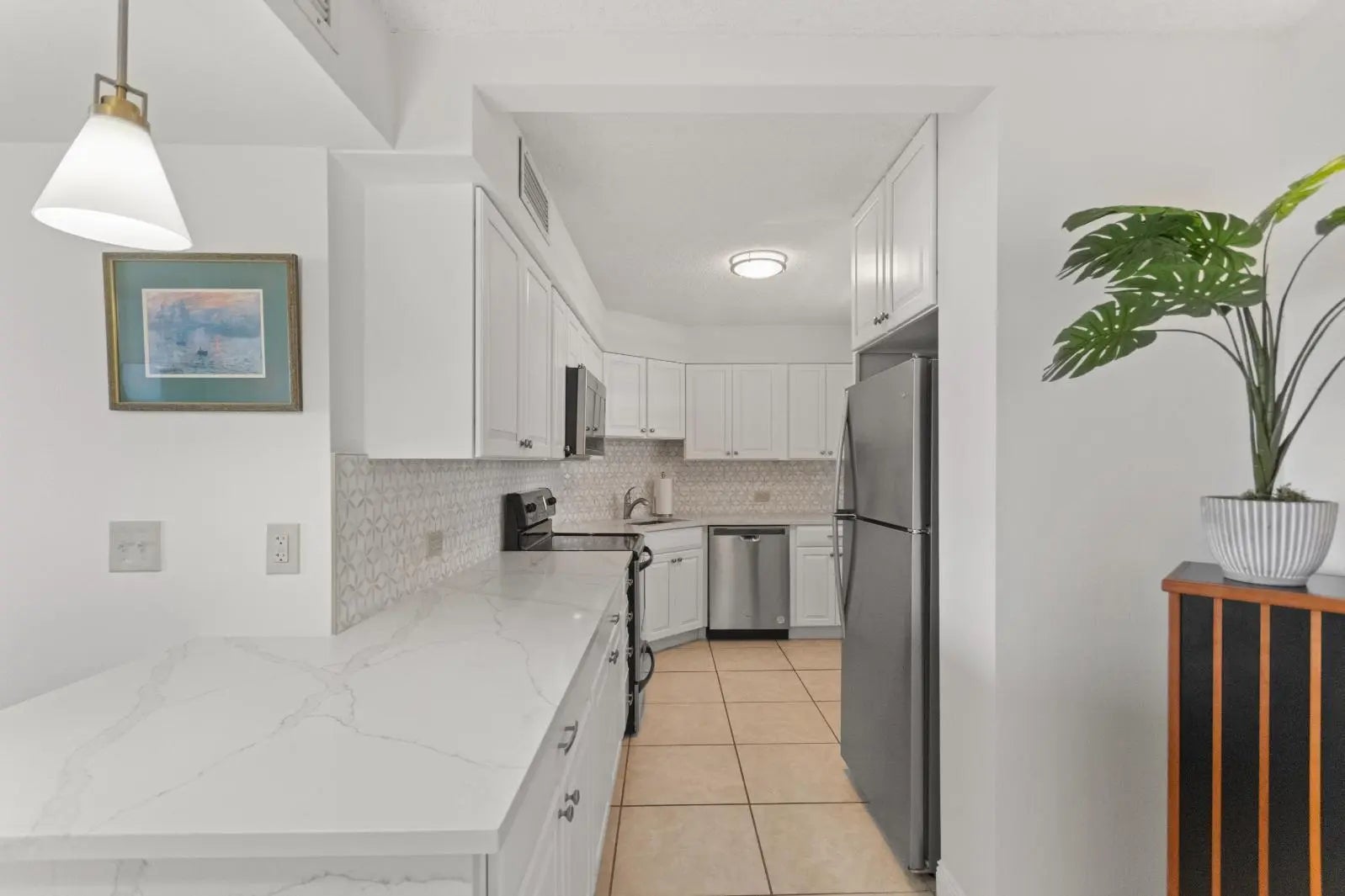 Beautiful waterfront views of the Intracoastal and Old Port Cove Marina. This 2-bedroom, 2-bathroom condo features a renovated open white kitchen with stainless steel appliances and an updated primary bathroom with a walk-in shower. Enjoy a spacious living area that opens to the covered balcony, perfect for relaxing and taking in the water views. Enjoy the views from all main living areas. The unit comes with covered parking. Community amenities include a pool, fitness center, and community room. Old Port Cove offers a scenic waterfront walking path and Belle's Restaurant located at the marina. Conveniently located close to dining, shopping, golf, and miles of beautiful beaches.