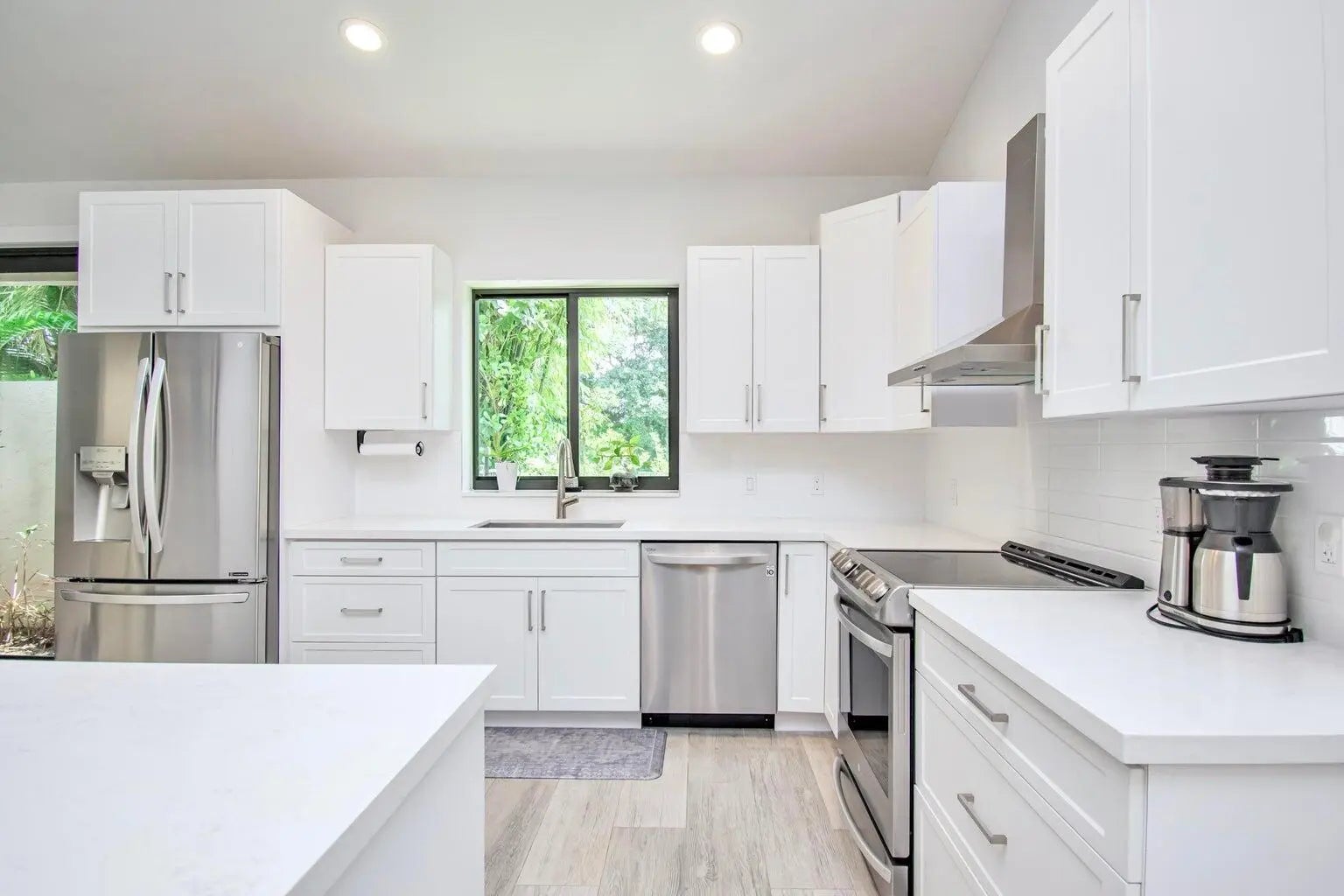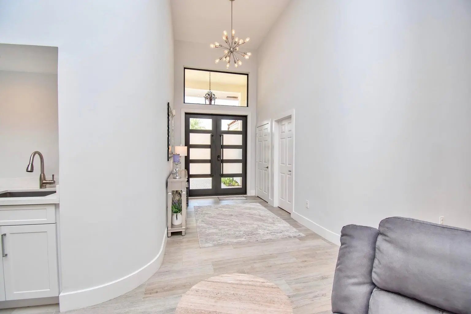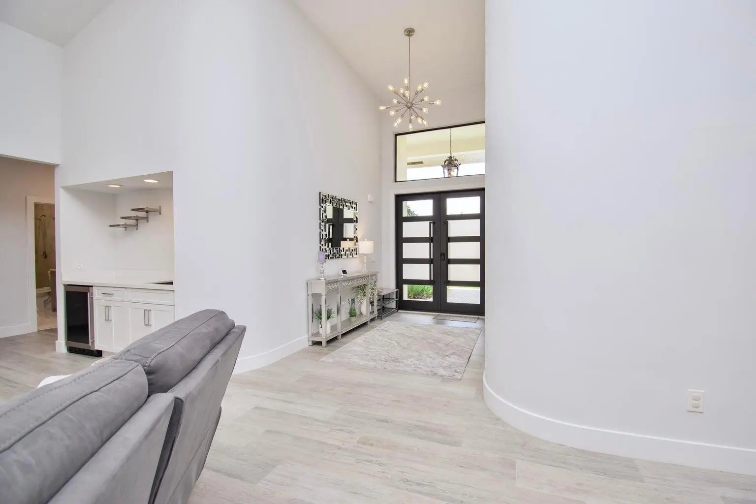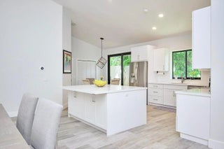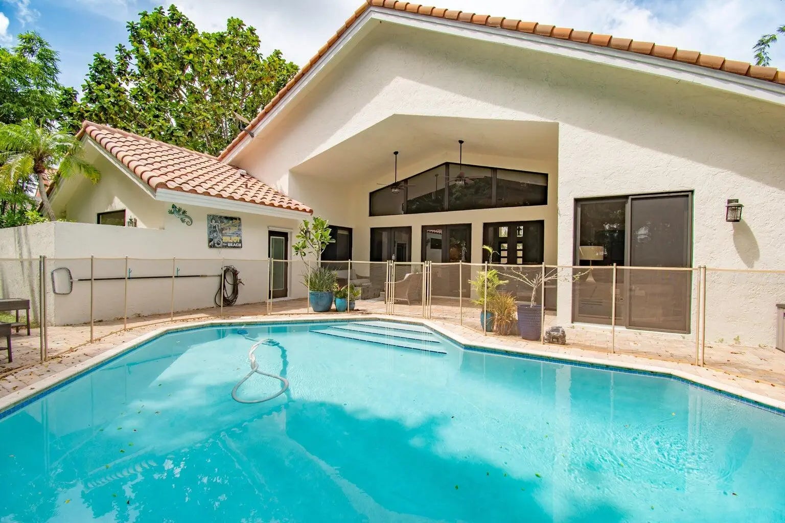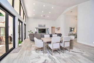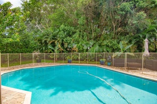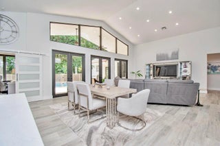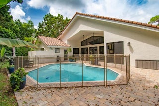 This completely updated home features a modern, warm, clean-line design. Single story East Boca 5 bedroom, 2 1/2 bath, cul-de-sac pool home with 2 car garage in a small private community adjacent to Calusa Elementary School. The front entrance has impressive double 8 foot modern impact doors that open to a grand foyer and large open floor plan with high soaring ceilings. The interior has many windows providing adequate natural light. The Primary Suite includes a large walk-in closet with an elegant bathroom. The kitchen boasts of modern custom cabinetry with quartz counter tops, large island, and like new energy efficient stainless steel appliances. Additional features in supplemental remarks. A MUST SEE! Additional features include a built in wet bar with beverage cooler, LED lighting, Smart Home switches, tankless water heater, Epoxy coated garage, walk-in pantry, fenced yard, and Hurricane Impact windows/Doors. A++ schools.