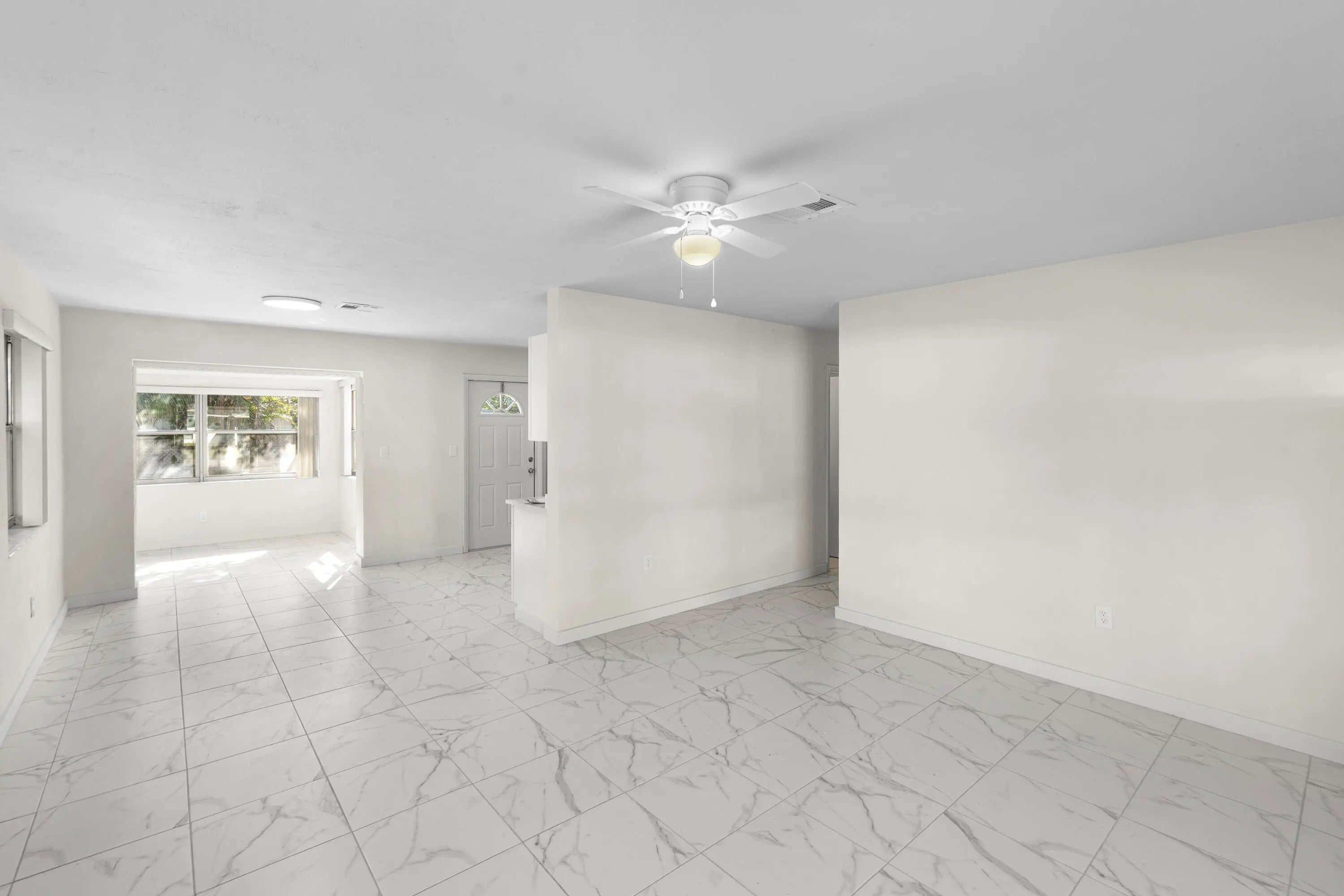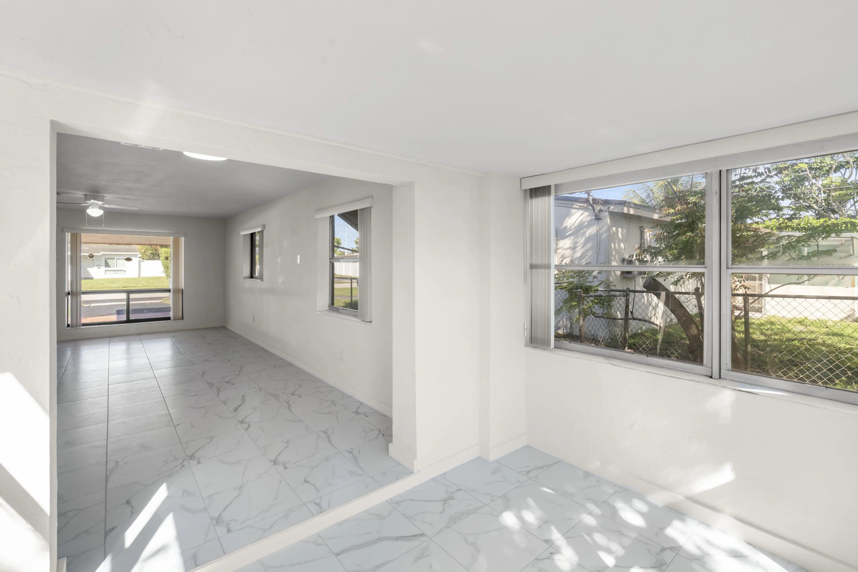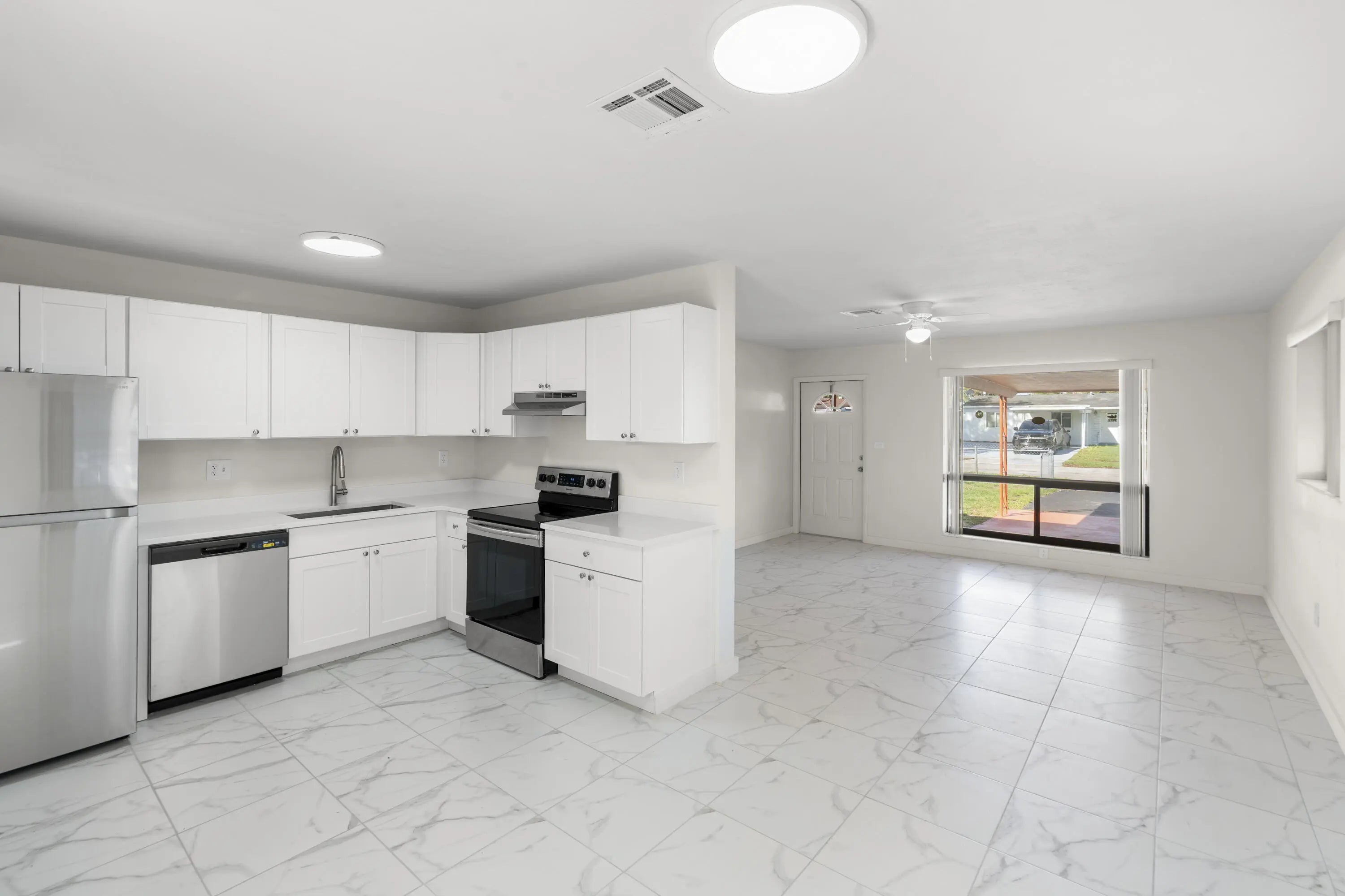 lovely 3 /1/1/2, totally renovated, new kitchen, quartz counter tops, stainless steel appliances, new bathrooms, beautifull tile floors, central ac,, laundry room, totally fenced property, will put in backyard sod when sold. being sold as is.