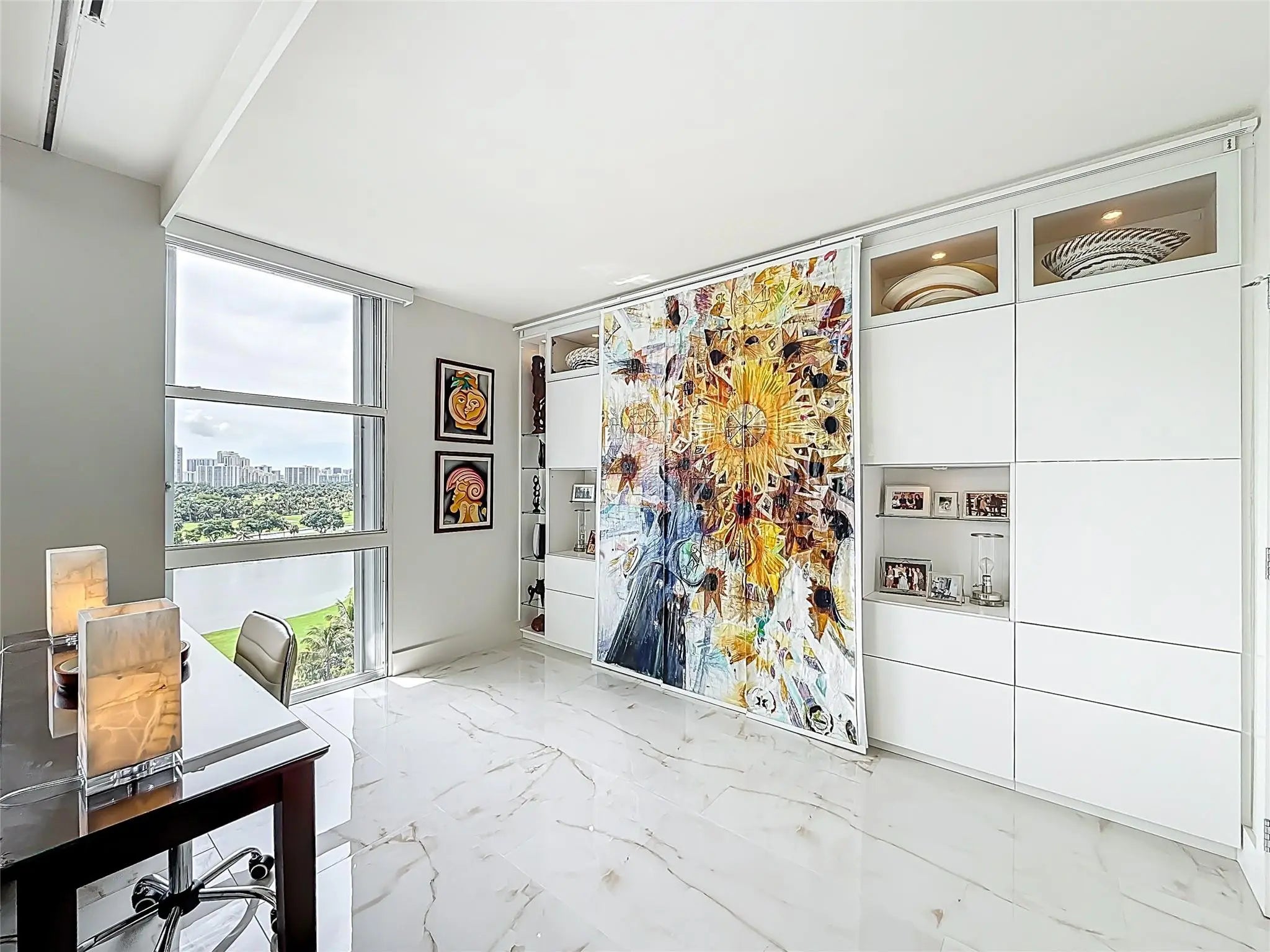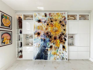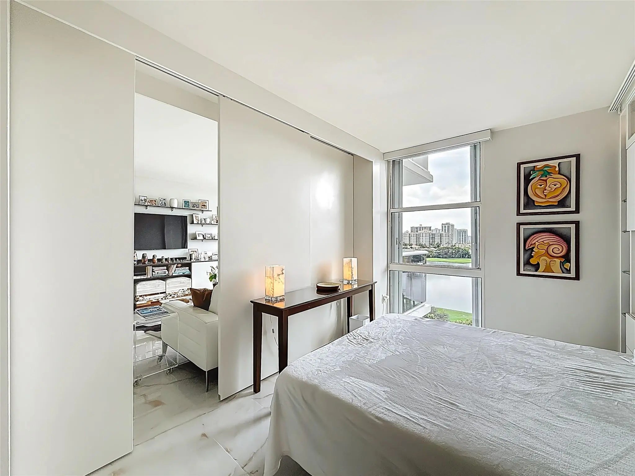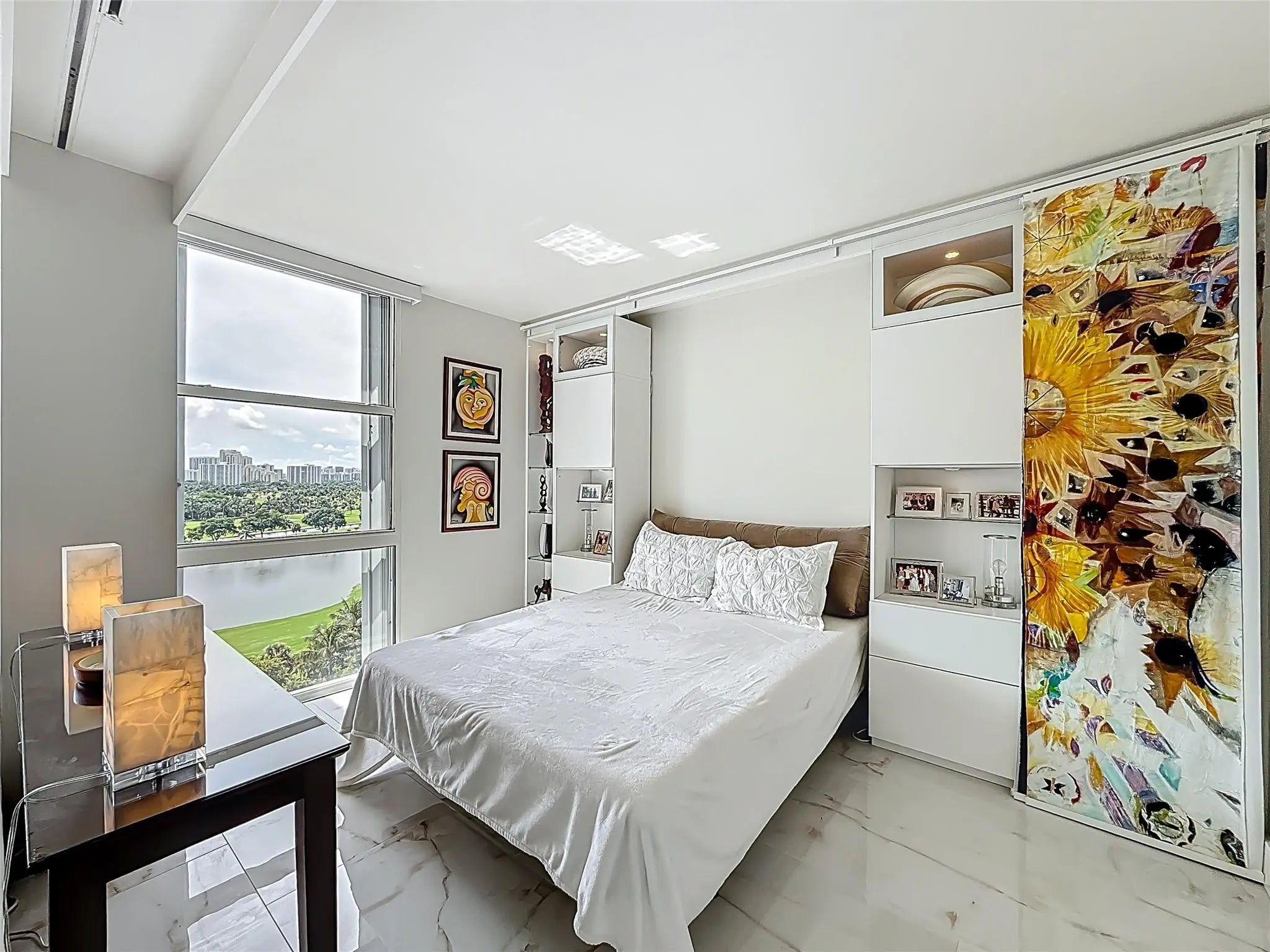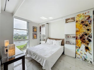 Architect’s residence with turnkey fully furnished option. 180-degree views of sunrises over the ocean, majestic sunsets, shimmering moonrises & serene lake reflections. Innovative living area seamlessly integrates the LR, DR & 2nd BR for open concept, but can be portioned into an office/bedroom w/ a panel pocket wall system. Artfully concealed Murphy bed creates a BR w/ closet & en-suite bathroom. Interior features: 3D accent walls, exquisite mother of pearl tile, custom kitchen, bar w/ built-in cabinets, entertainment center w/ floating shelves, motorized blackout shades, WIC, lots of storage, hurricane shutters & deeded parking (2nd available). Location is on the Soffer nature trail & Turnberry lakes…Walk to Aventura mall, restaurants, houses of worship, dog park, horse track marina, train or Golden beach. HOA: WIFI/cable, 24-hour concierge, pool, jacuzzi, gym, club room, saunas, library, billiard room & covered BBQ area with outdoor dining area on the canal.